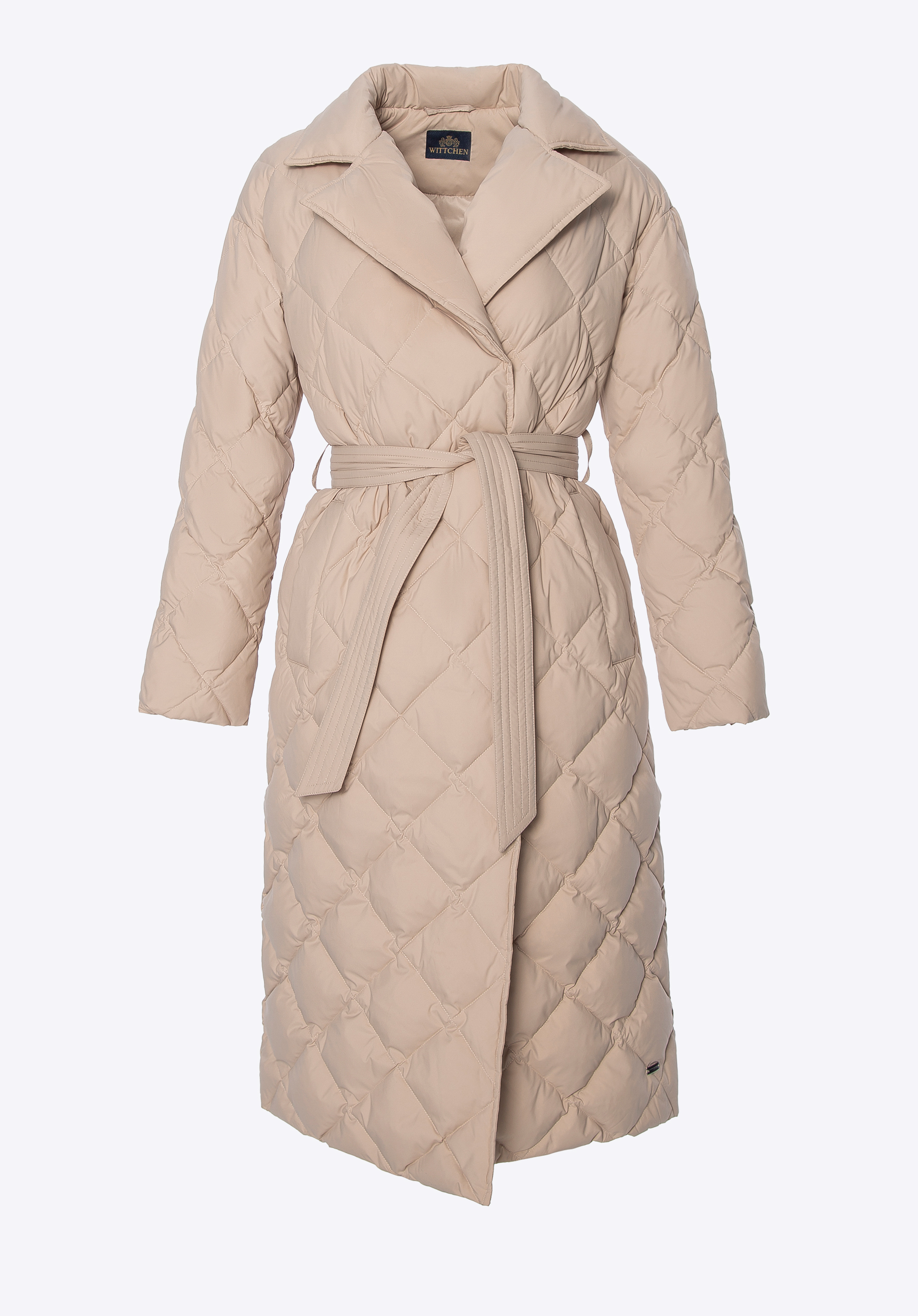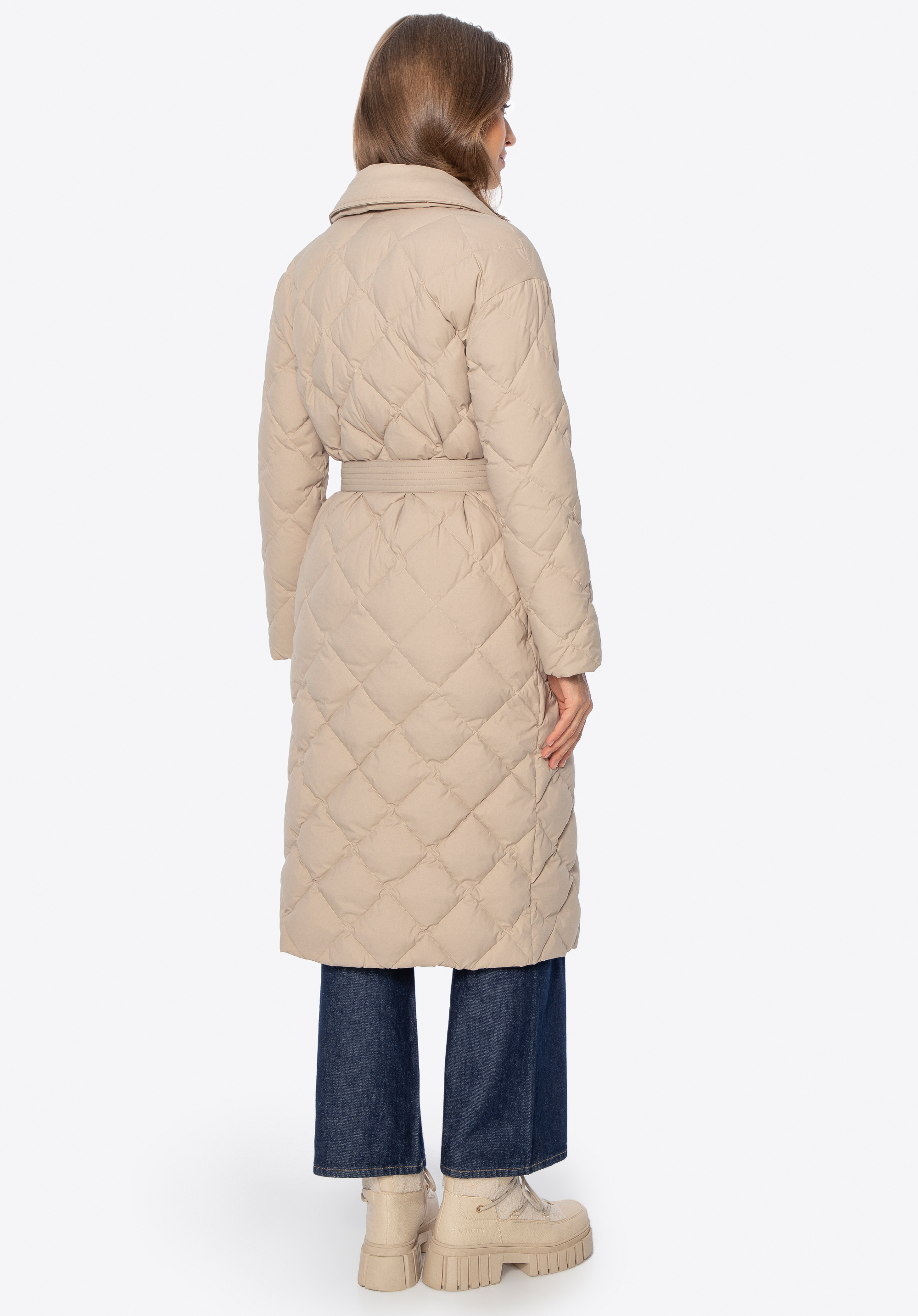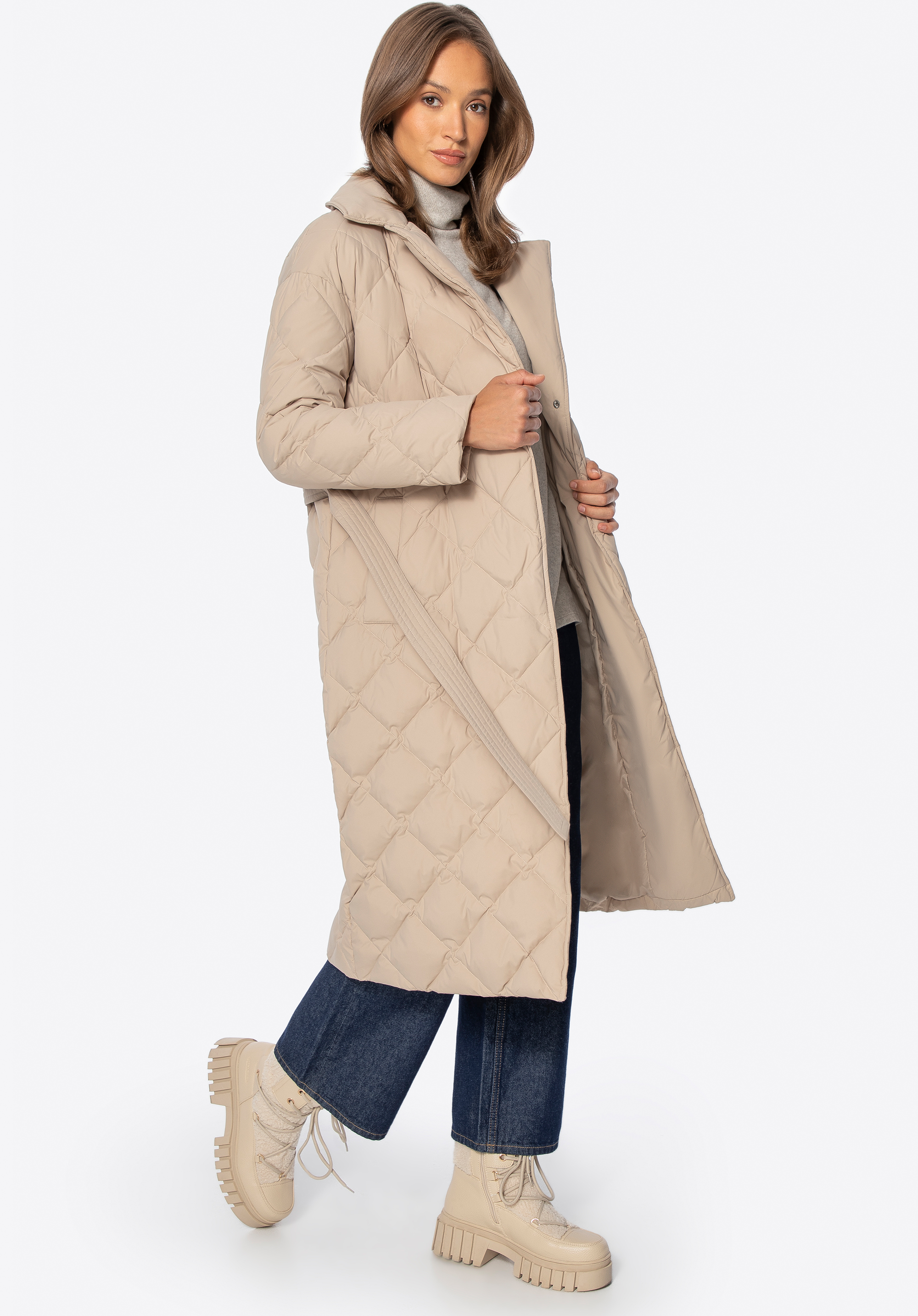Ten damski płaszcz puchowy łączy komfort, funkcjonalność i elegancki design. Wykonany z poliestru i wypełniony naturalnym puchem kaczym oraz pierzem, zapewnia optymalne ciepło nawet w najzimniejsze dni. Długi fason chroni sylwetkę, a pikowanie dodaje całości lekkości i nowoczesnego charakteru. Pasek w talii pozwala subtelnie dopasować płaszcz, podkreślając kobiecą sylwetkę i dodając elegancji.