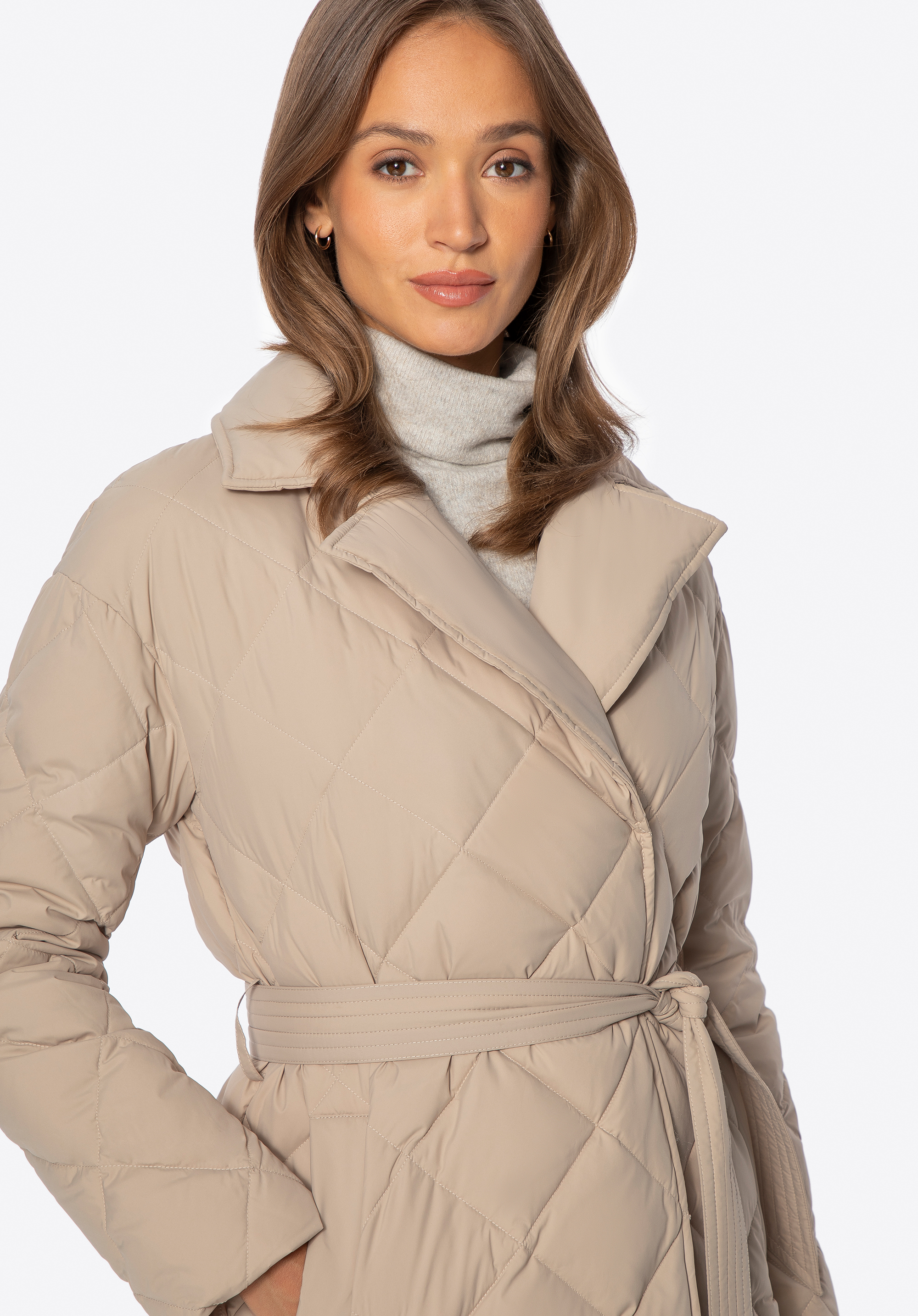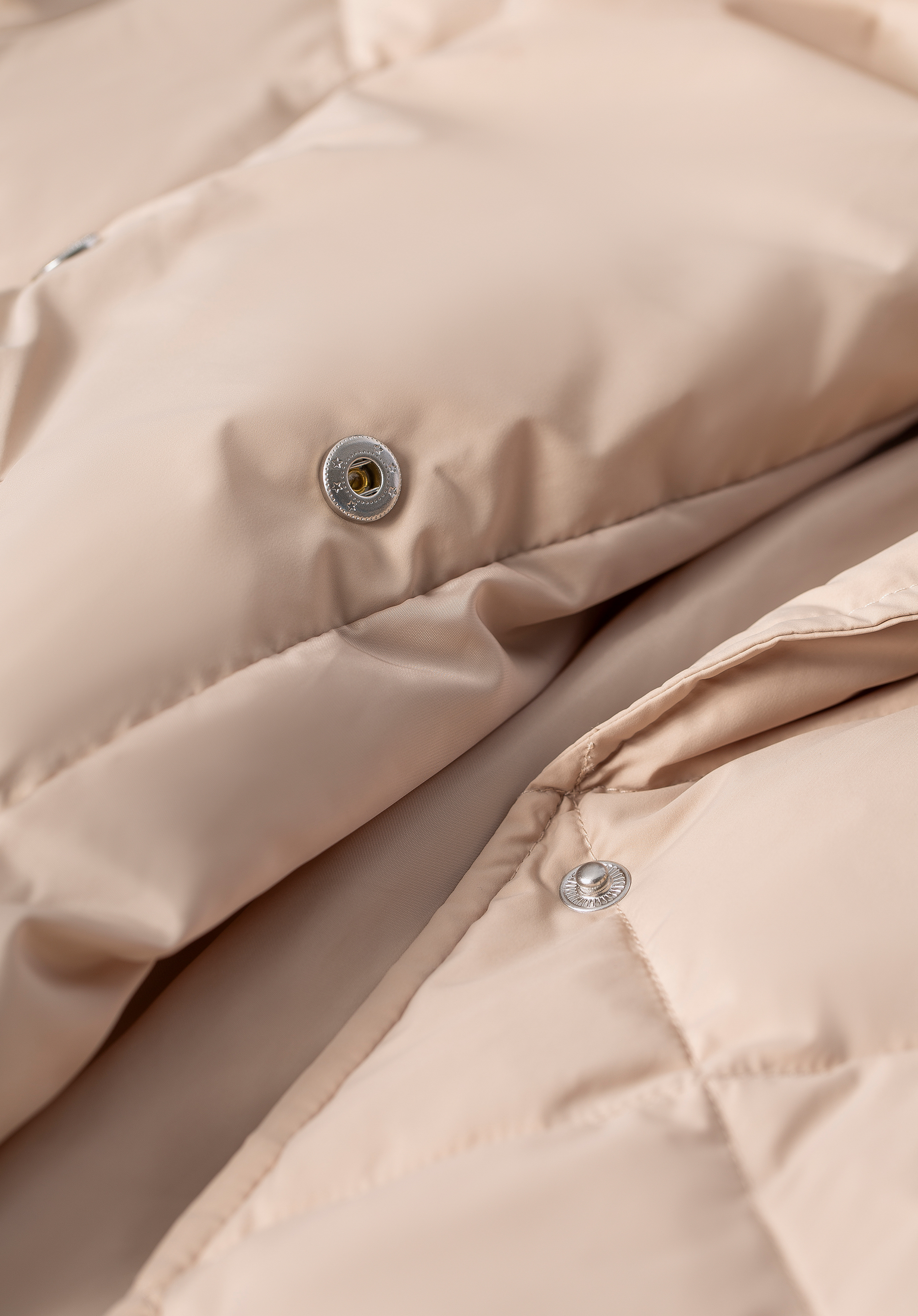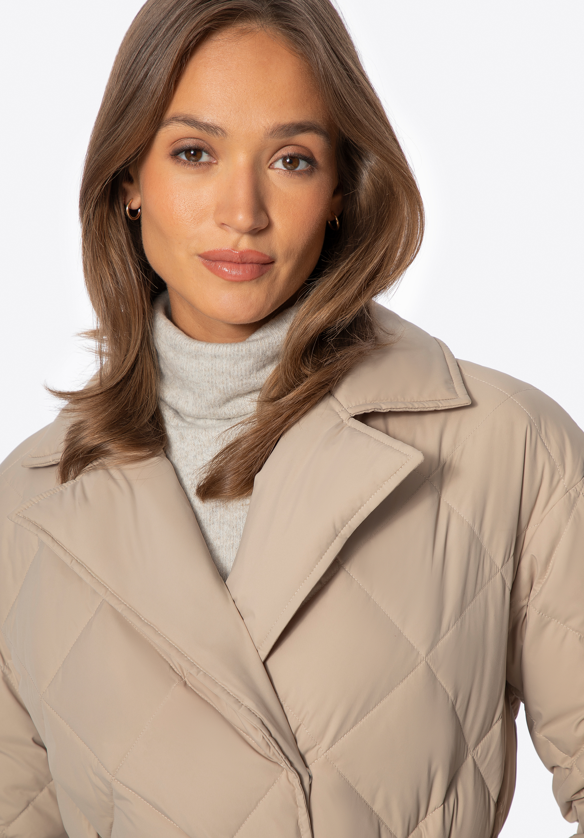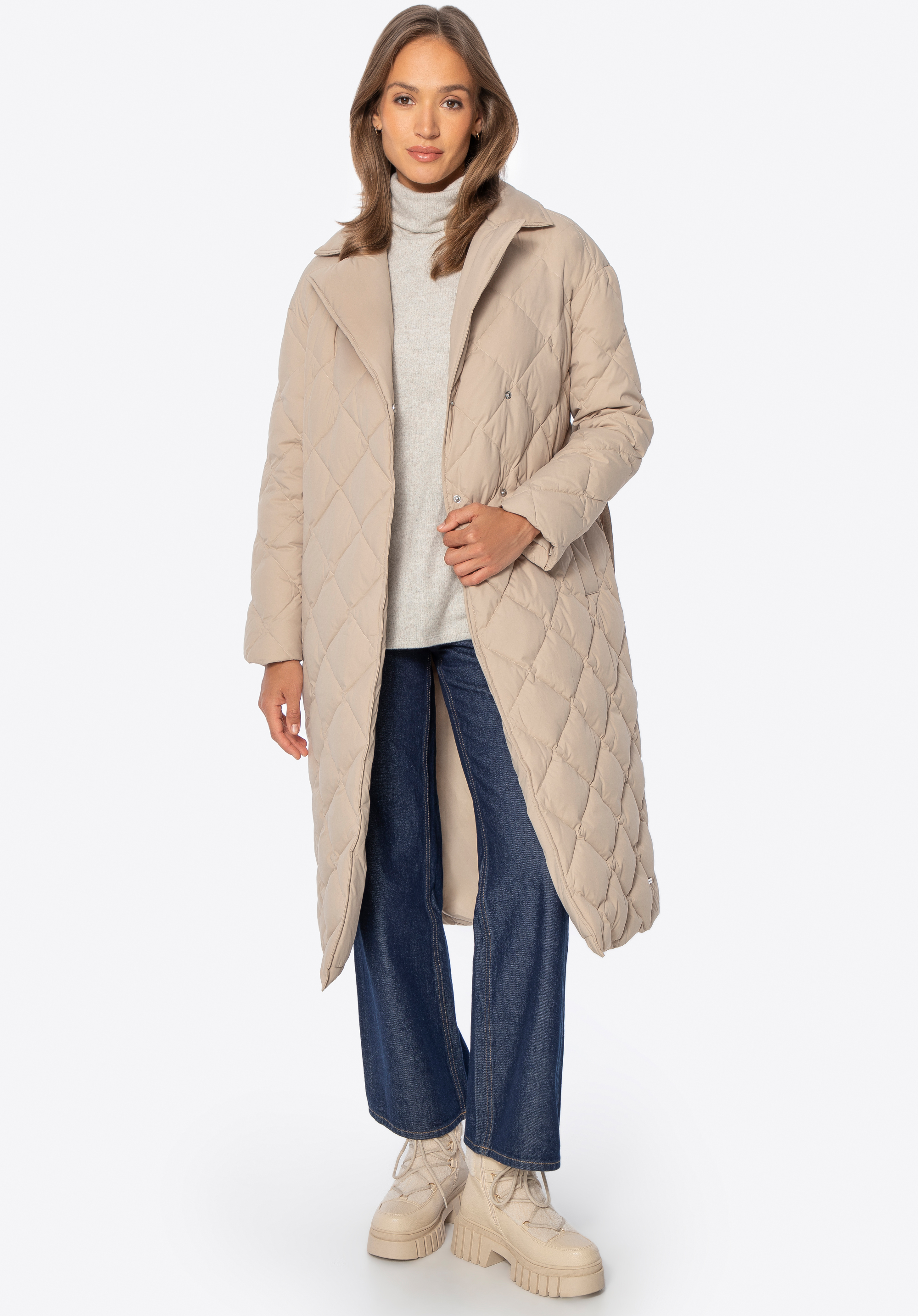 Ten damski płaszcz puchowy łączy komfort, funkcjonalność i elegancki design. Wykonany z poliestru i wypełniony naturalnym puchem kaczym oraz pierzem, zapewnia optymalne ciepło nawet w najzimniejsze dni. Długi fason chroni sylwetkę, a pikowanie dodaje całości lekkości i nowoczesnego charakteru. Pasek w talii pozwala subtelnie dopasować płaszcz, podkreślając kobiecą sylwetkę i dodając elegancji.