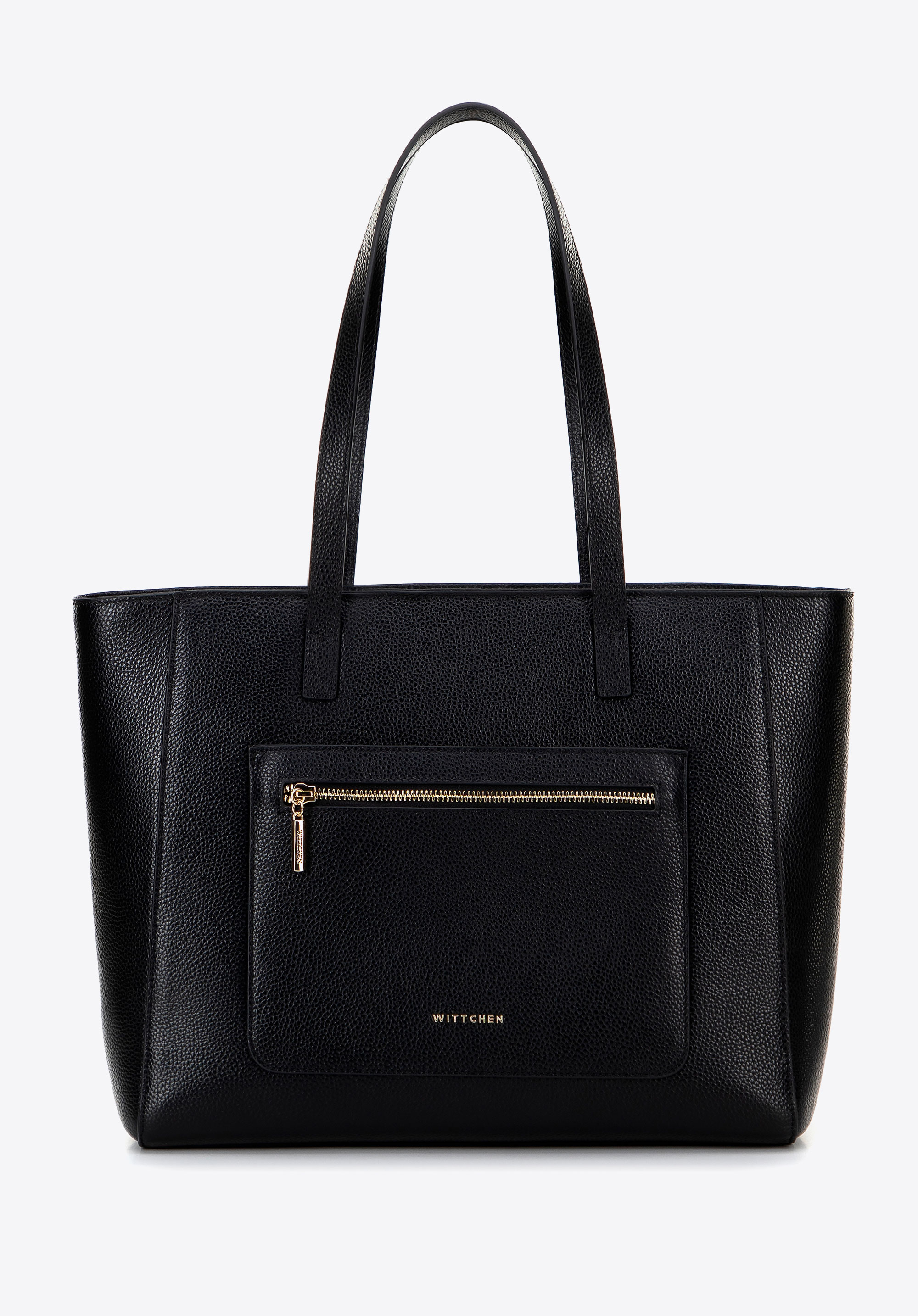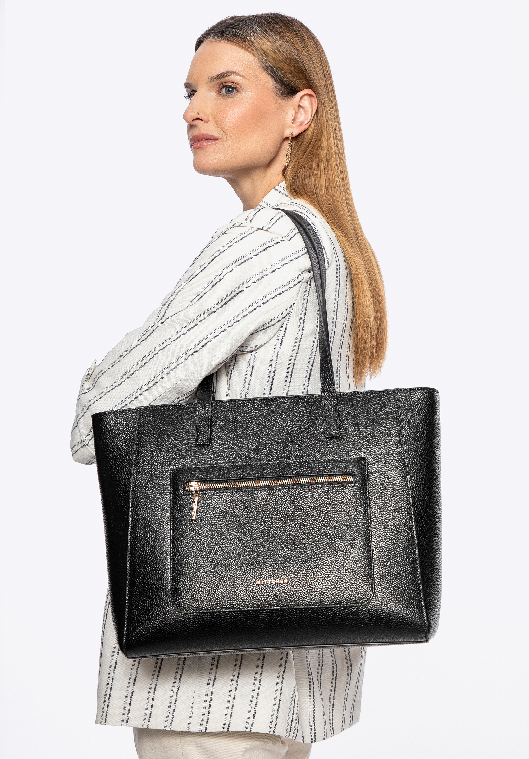 Skórzana torebka shopper z kieszenią na froncie odnajdzie się w pracy i w codziennym biegu, gdy chcesz połączyć pojemność z elegancką linią. Skóra naturalna, bezpieczny zamek i wnętrze mieszczące format A4 zapewniają komfort użytkowania, a przednie kieszenie pozwalają trzymać najpotrzebniejsze drobiazgi zawsze pod ręką.