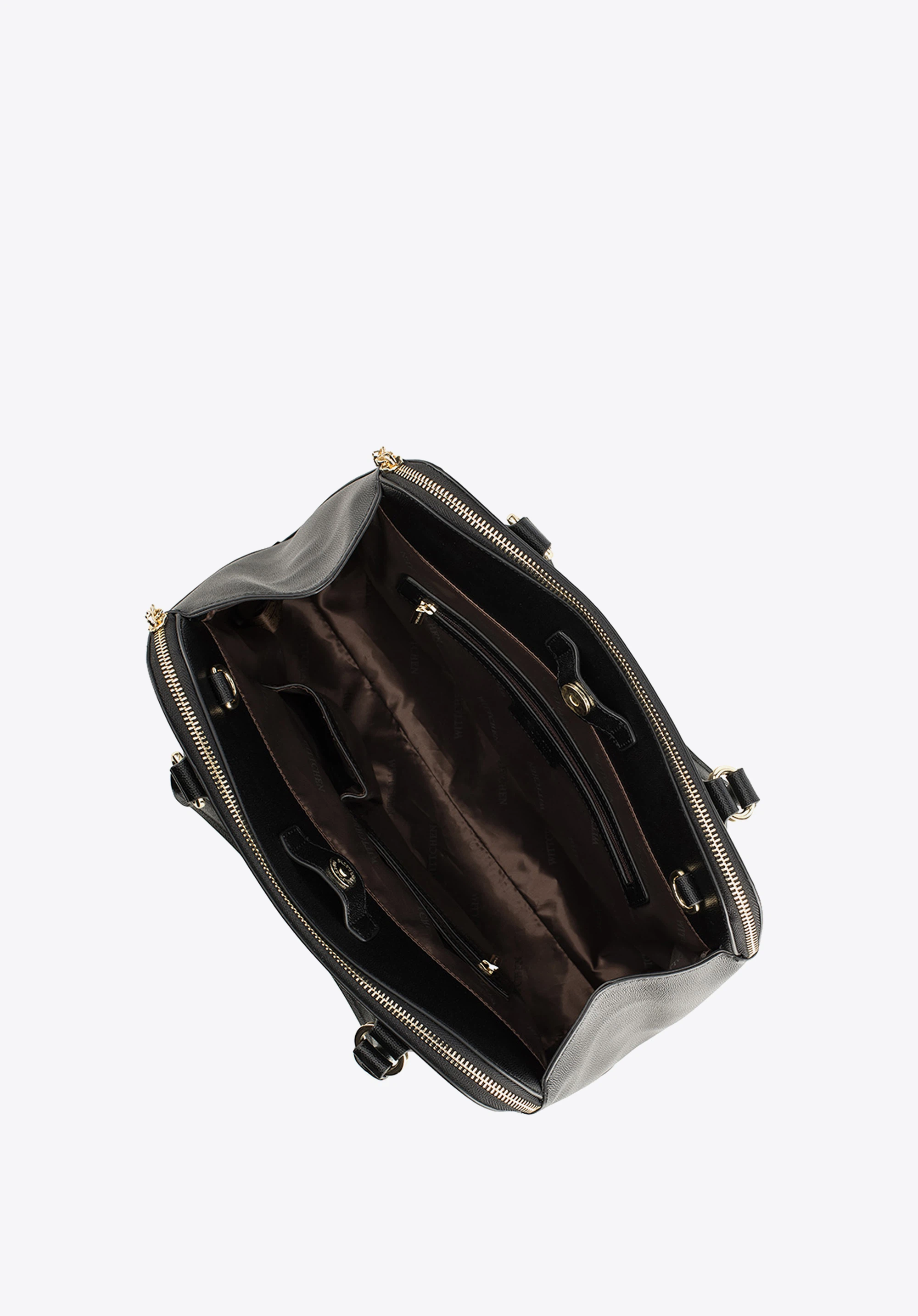 - wewnątrz dwie kieszenie zamykane na suwak, miejsce na telefon komórkowy oraz otwarta kieszeń na drobiazgi;