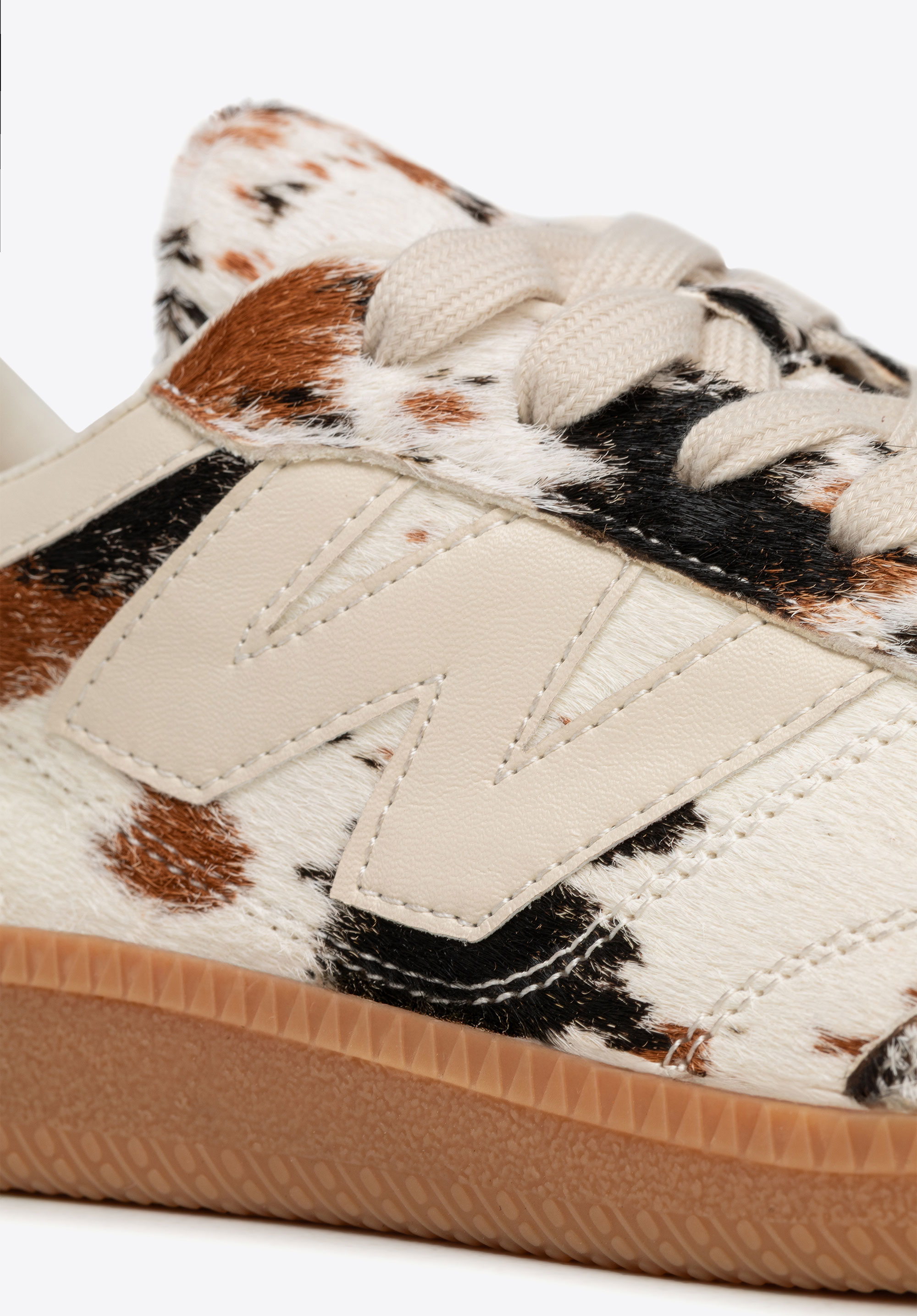 Odkryj sneakersy, które zachwycają nie tylko komfortem, lecz także oryginalnym, pełnym charakteru designem. Wykonane z naturalnej skóry z włosiem i zdobione zwierzęcym wzorem, przyciągają uwagę miękką fakturą i niebanalnym wyglądem, który od razu wyróżnia je na tle klasycznych modeli. Po bokach umieszczono literę W, dodając obuwiu nowoczesności i podkreślając jego unikatowy styl. Okrągły nosek zapewnia swobodę palców, a sznurowanie umożliwia idealne dopasowanie do stopy, gwarantując stabilność i wygodę przez cały dzień. To model dla kobiet, które chcą połączyć miejski luz z odrobiną modowej odwagi i cenią obuwie podkreślające indywidualny charakter.