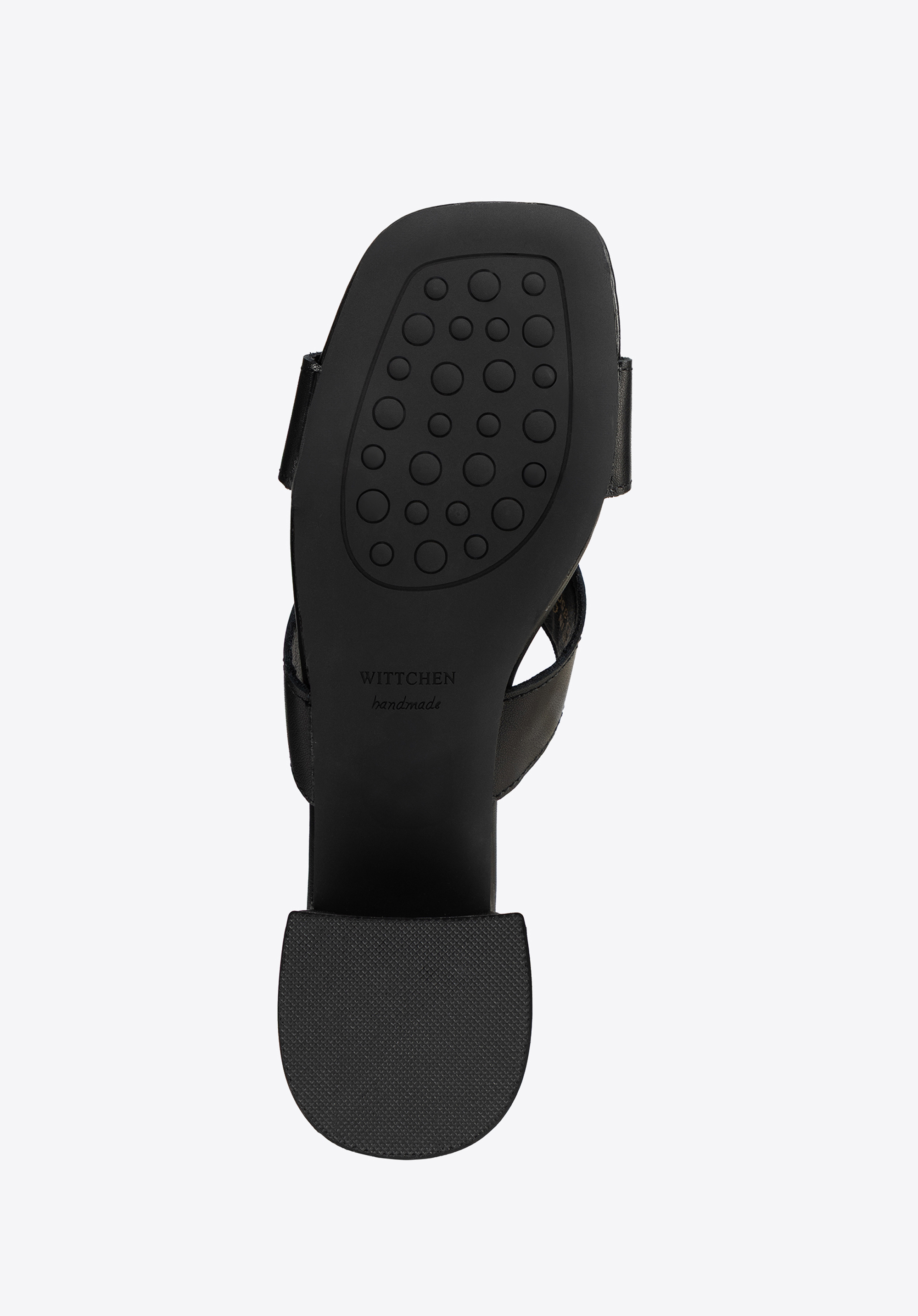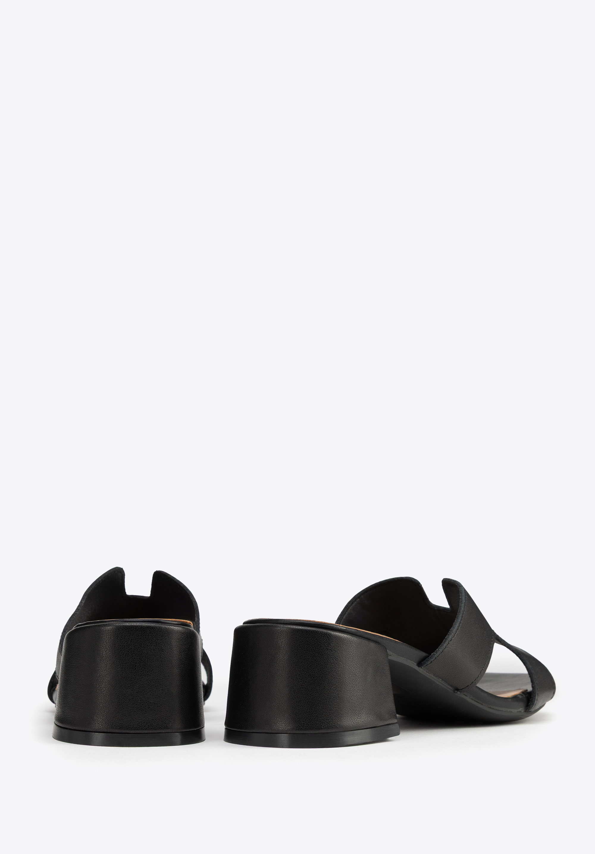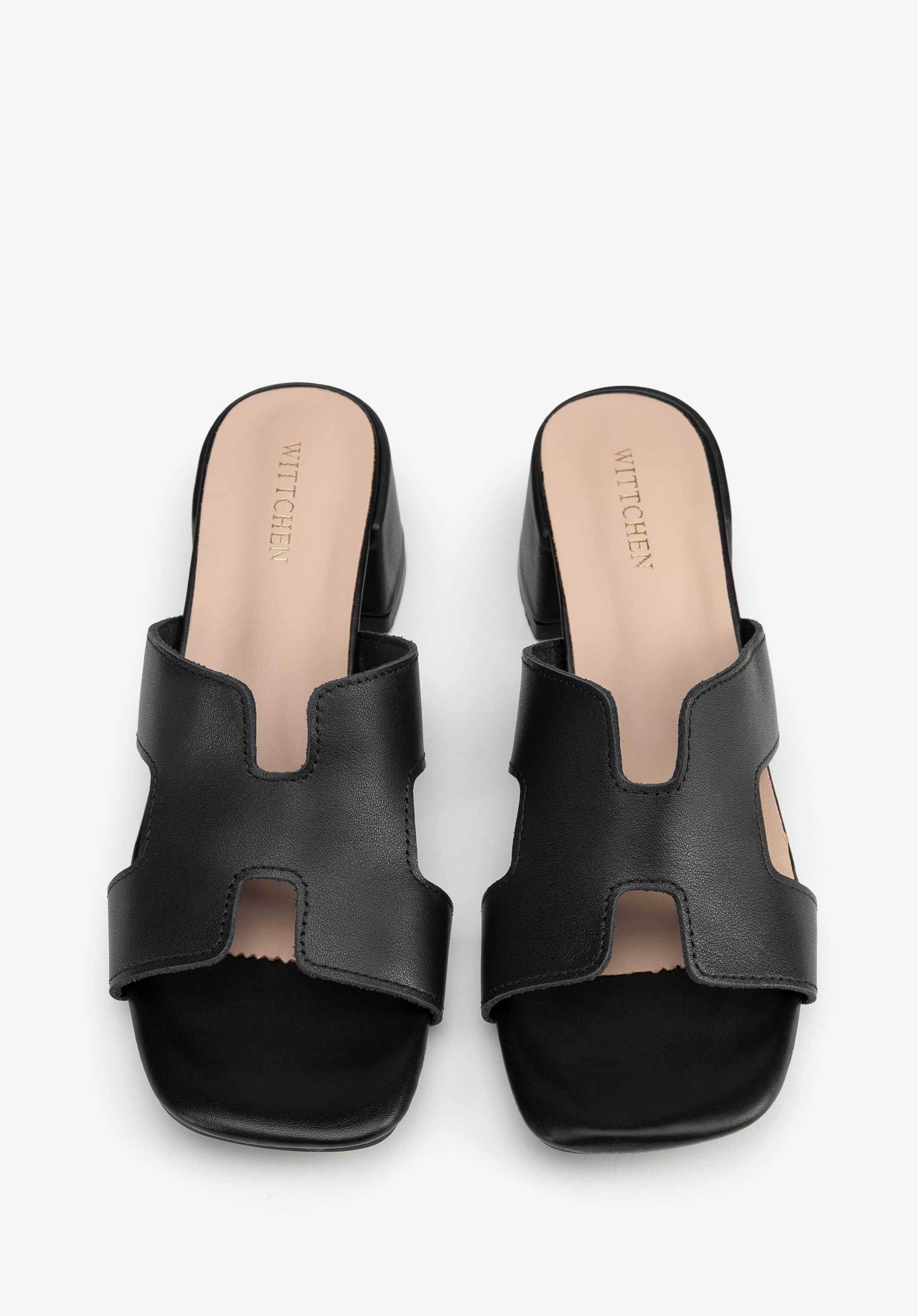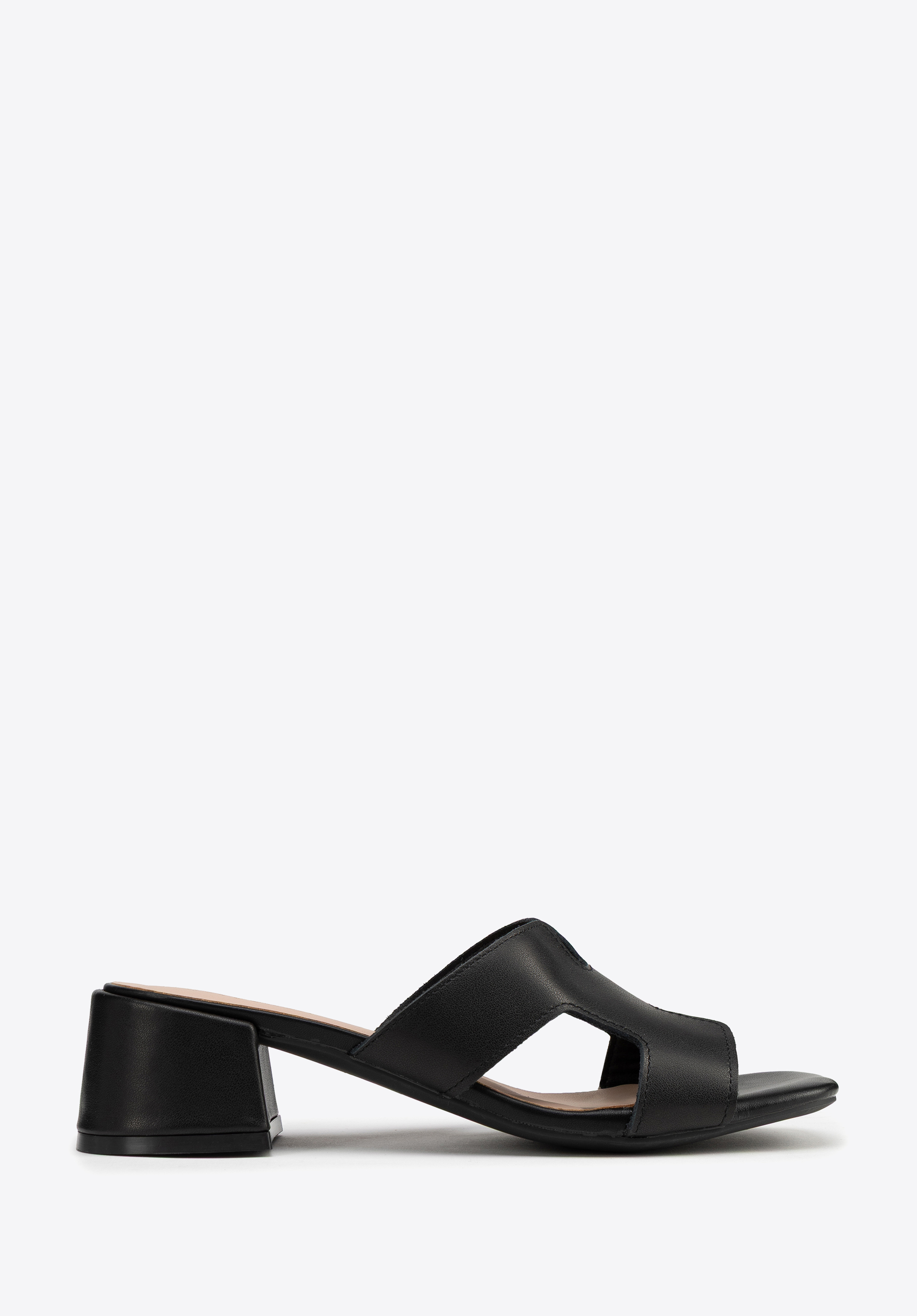Połączenie nowoczesnego designu i ponadczasowej elegancji – te skórzane klapki na słupku to synonim luksusu, który łączy komfort z modnym stylem. Wycięcie w kształcie litery „H” subtelnie eksponuje stopę, nadając jej smukły wygląd, a jednocześnie wprowadza do projektu odrobinę geometrycznej dynamiki. Wysokiej jakości naturalna skóra otula stopy miękkością, zapewniając wygodę przez cały dzień, a precyzyjne wykończenie dodaje eleganckiego charakteru. Obcas słupek łączy stabilność z odrobiną wysokości, podkreślając nowoczesny, ale elegancki wygląd.