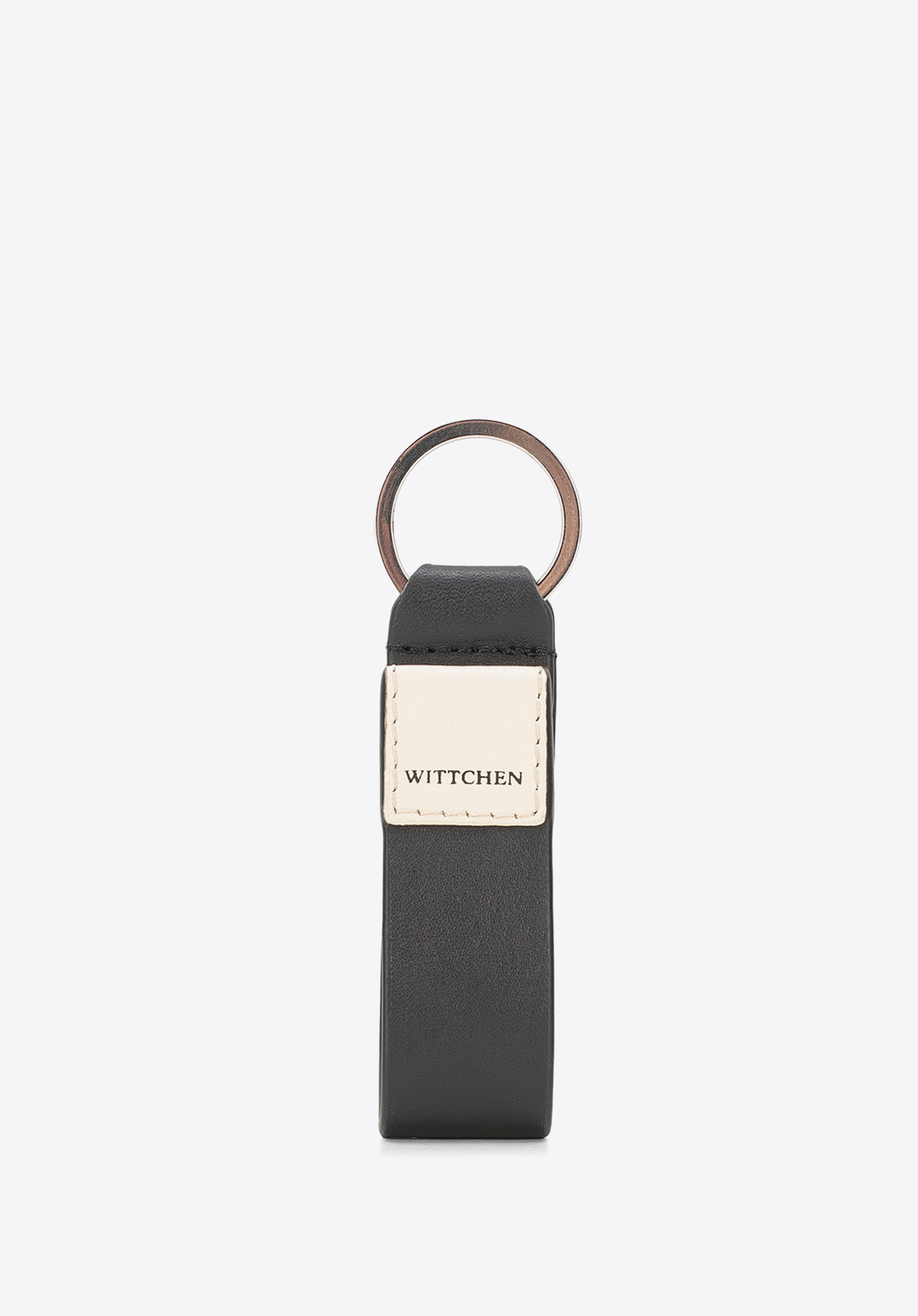 Brelok ze skóry zdobiony eleganckim, naszytym logo.