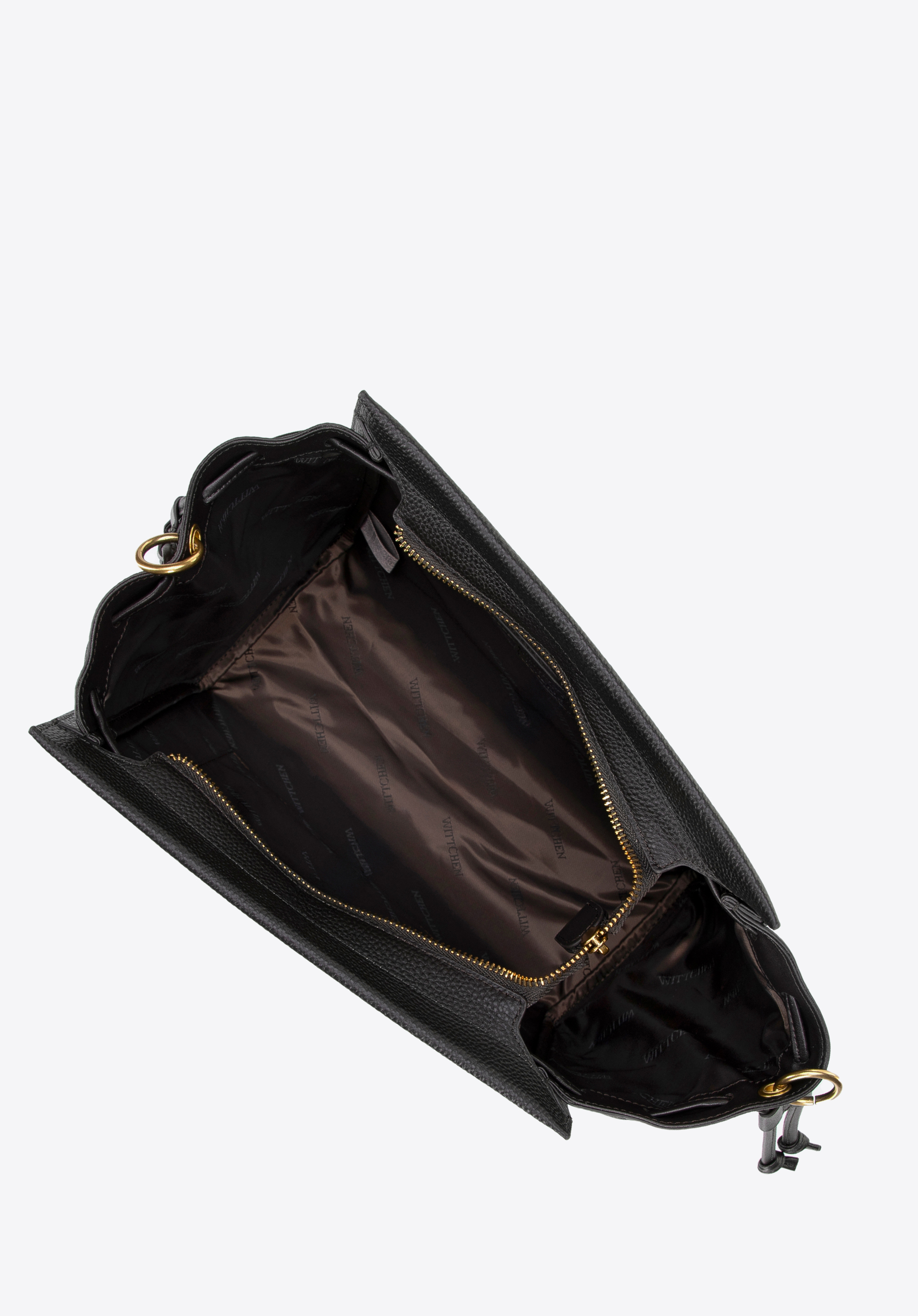 - Materiał: Korpus torebki został wykonany ze skóry naturalnej, co zapewnia jej trwałość i elegancki wygląd przez wiele lat.