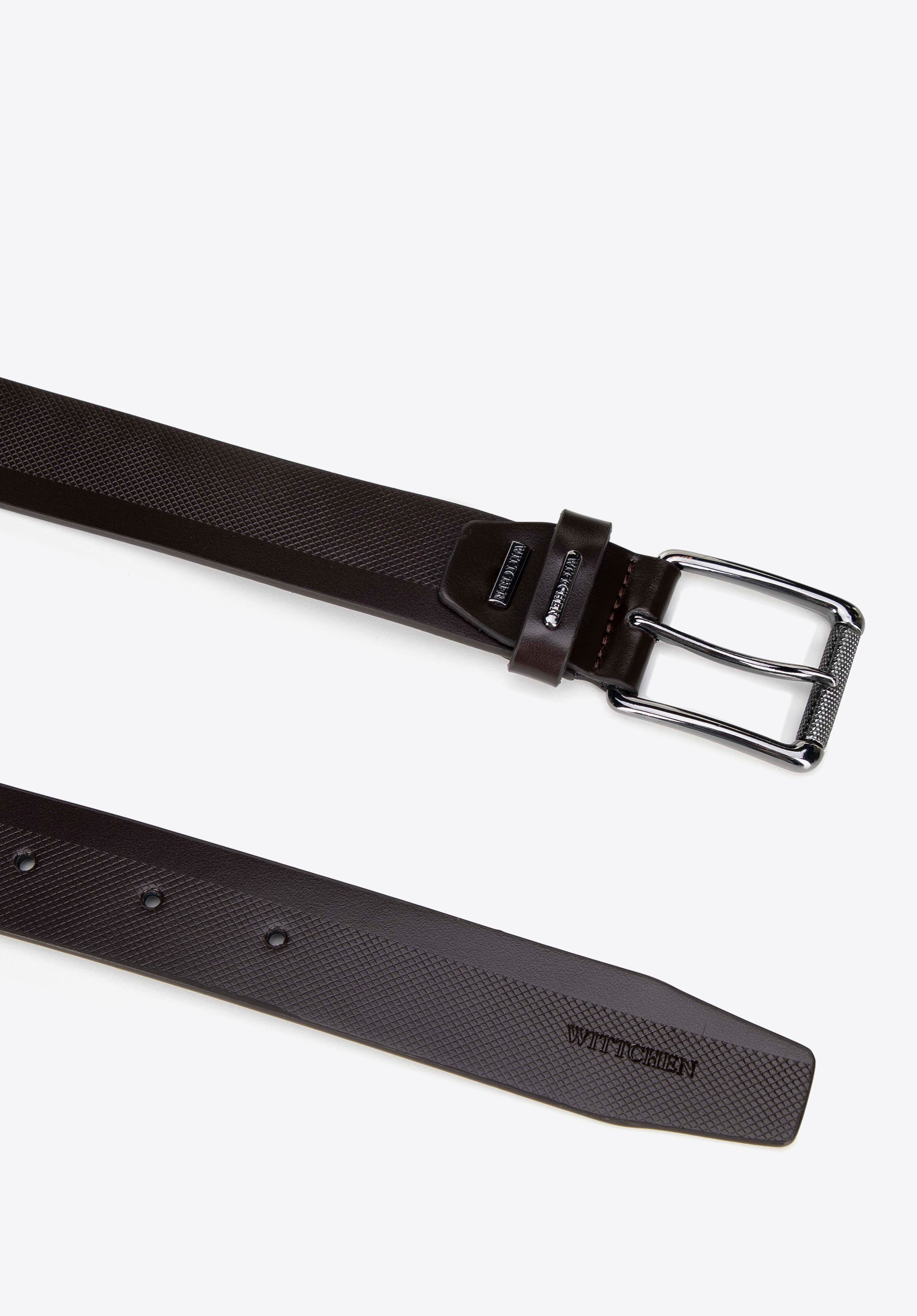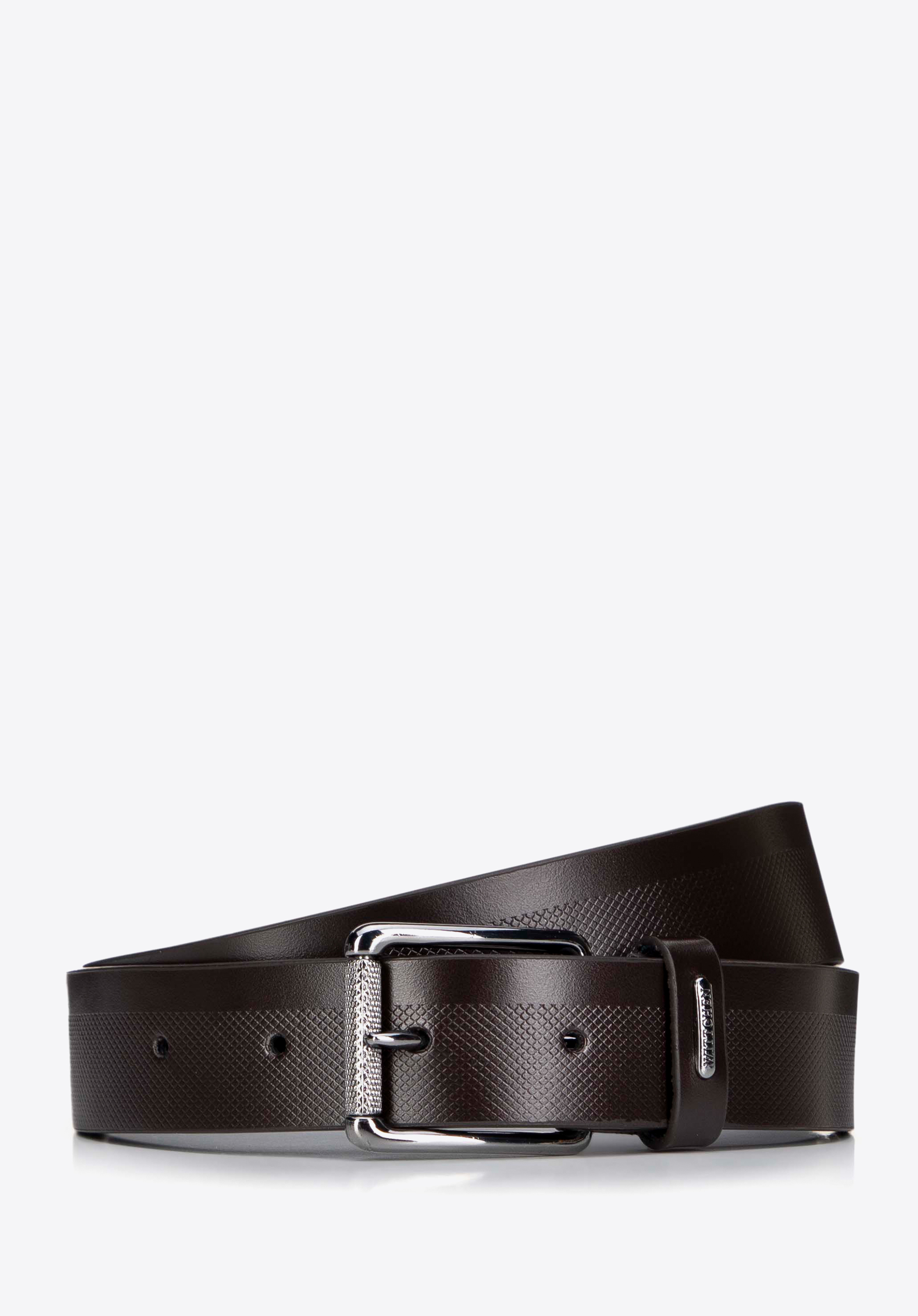 Skórzany męski pasek z geometrycznym wzorem dopełni stylizacje osób, które cenią klasykę przełamaną dyskretnym detalem, zarówno w biurze, jak i po godzinach. Naturalna skóra, regulowane dopasowanie i prostokątna klamra zapewniają wygodę, a subtelny wzór oraz tłoczone logo dodają całości nowoczesnej elegancji.