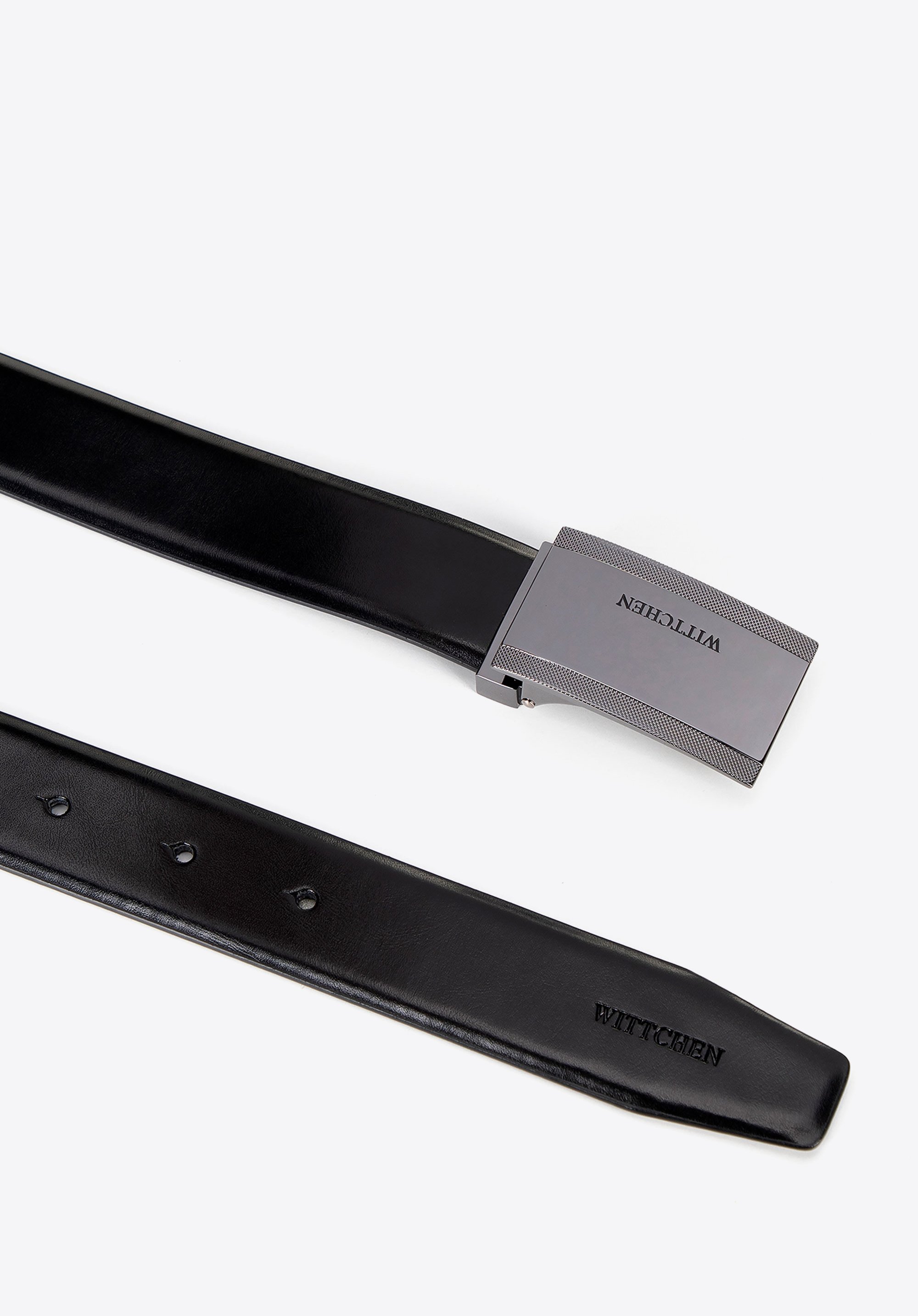 - Prostokątna klamra: Błyszcząca klamra z logo producenta to element wyróżniający pasek i nadający mu charakteru.
