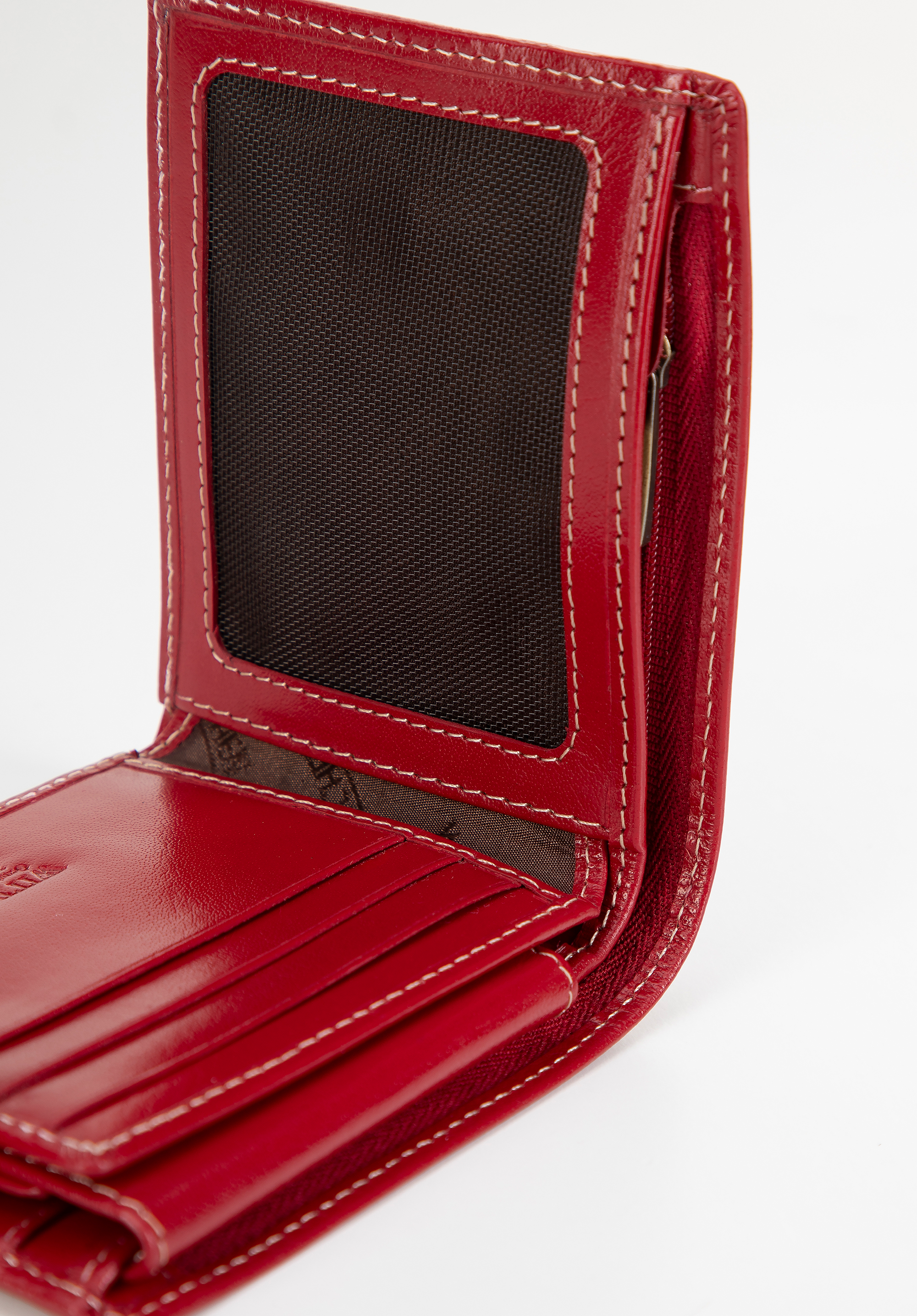 - Wnętrze: Dwie kieszenie na banknoty, w tym jedna na zamek błyskawiczny oraz miejsce na bilon zamykane na napę.
