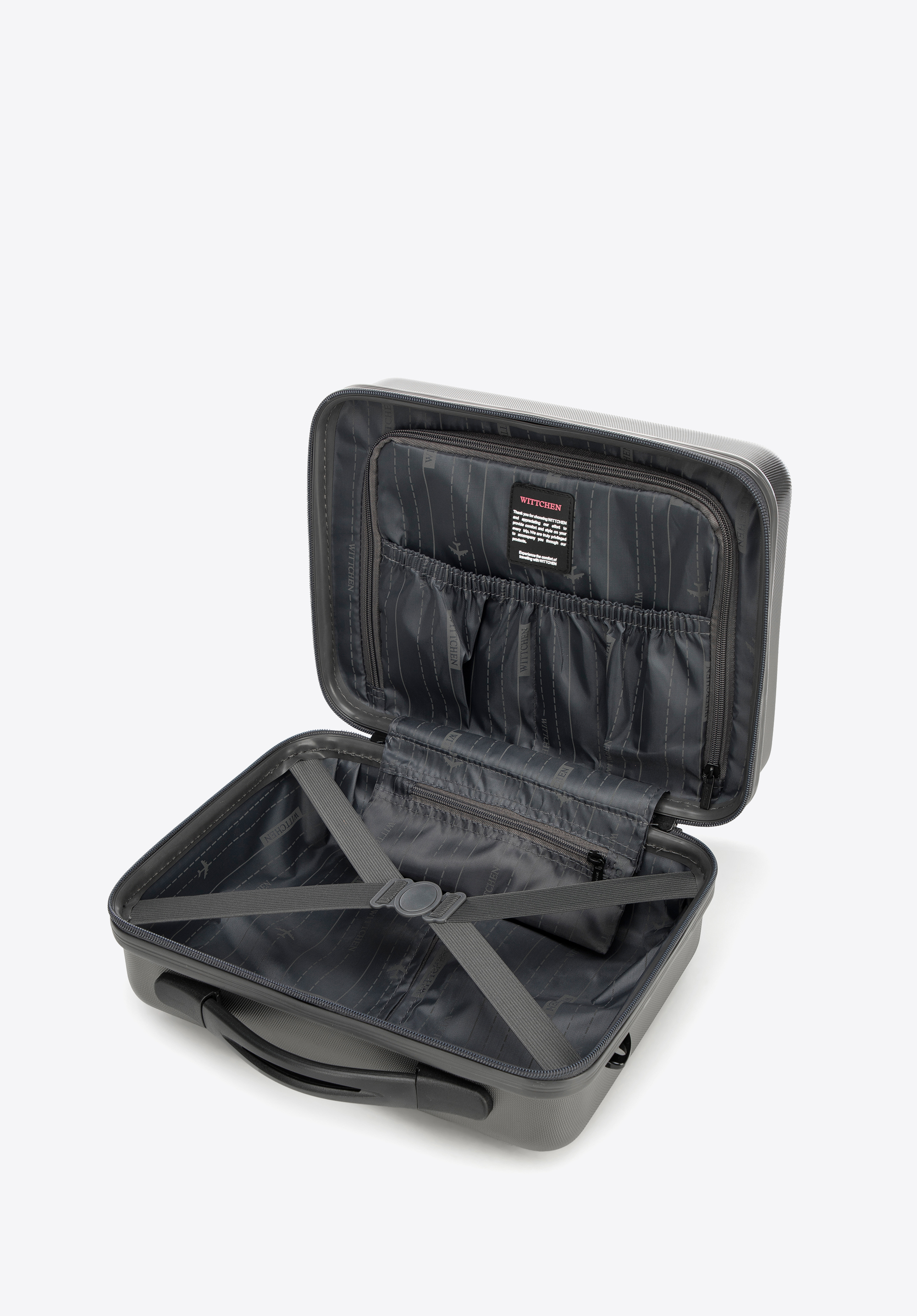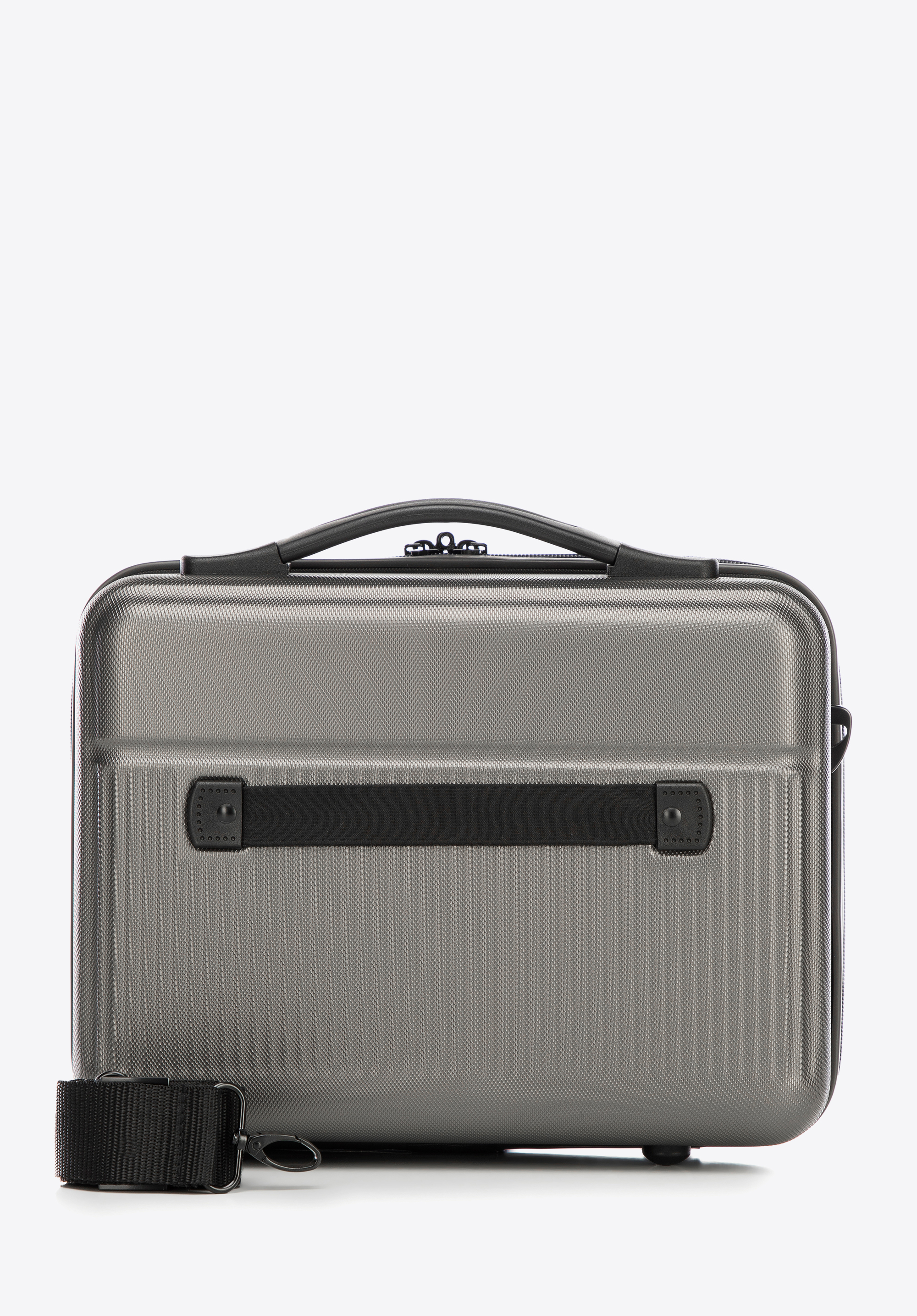- Kosmetyczka: Wyposażona w uchwyt do przenoszenia, odpinany i regulowany pasek na ramię oraz elastyczny pasek do mocowania na rączce walizki.