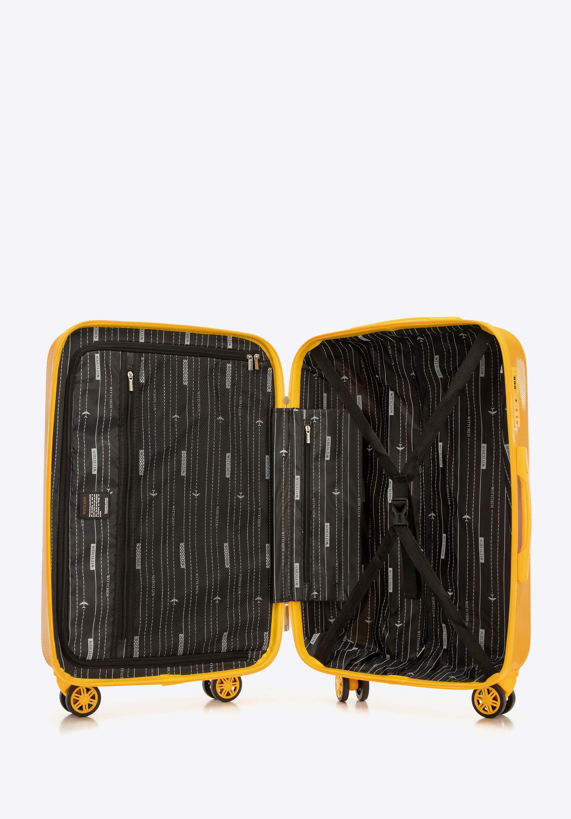 - Wnętrze walizki: Posiada dwie komory – jedną z elastycznymi pasami mocującymi ubrania, drugą zamykaną na suwak z siatkową kieszenią i dodatkową kieszonką na drobiazgi.