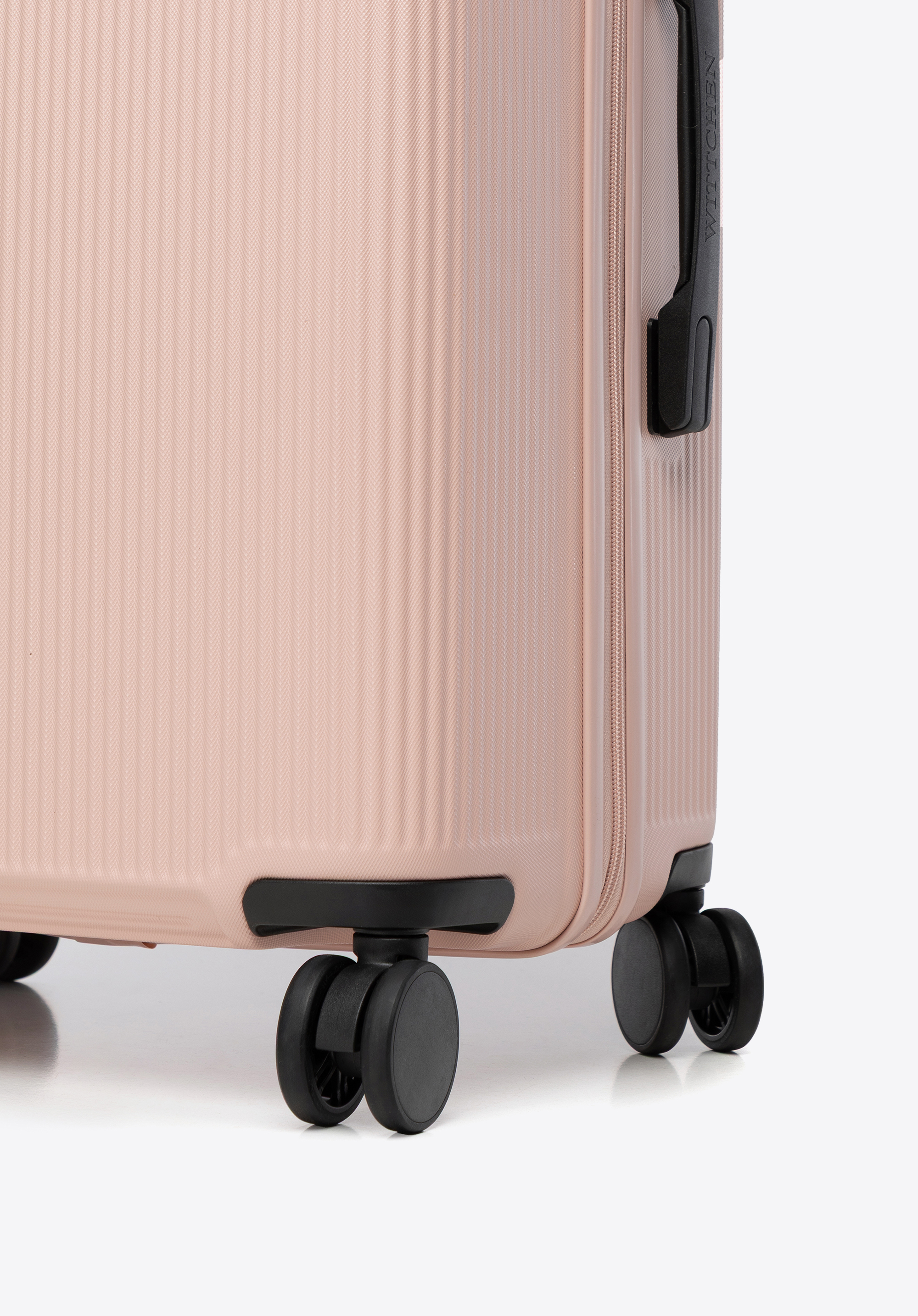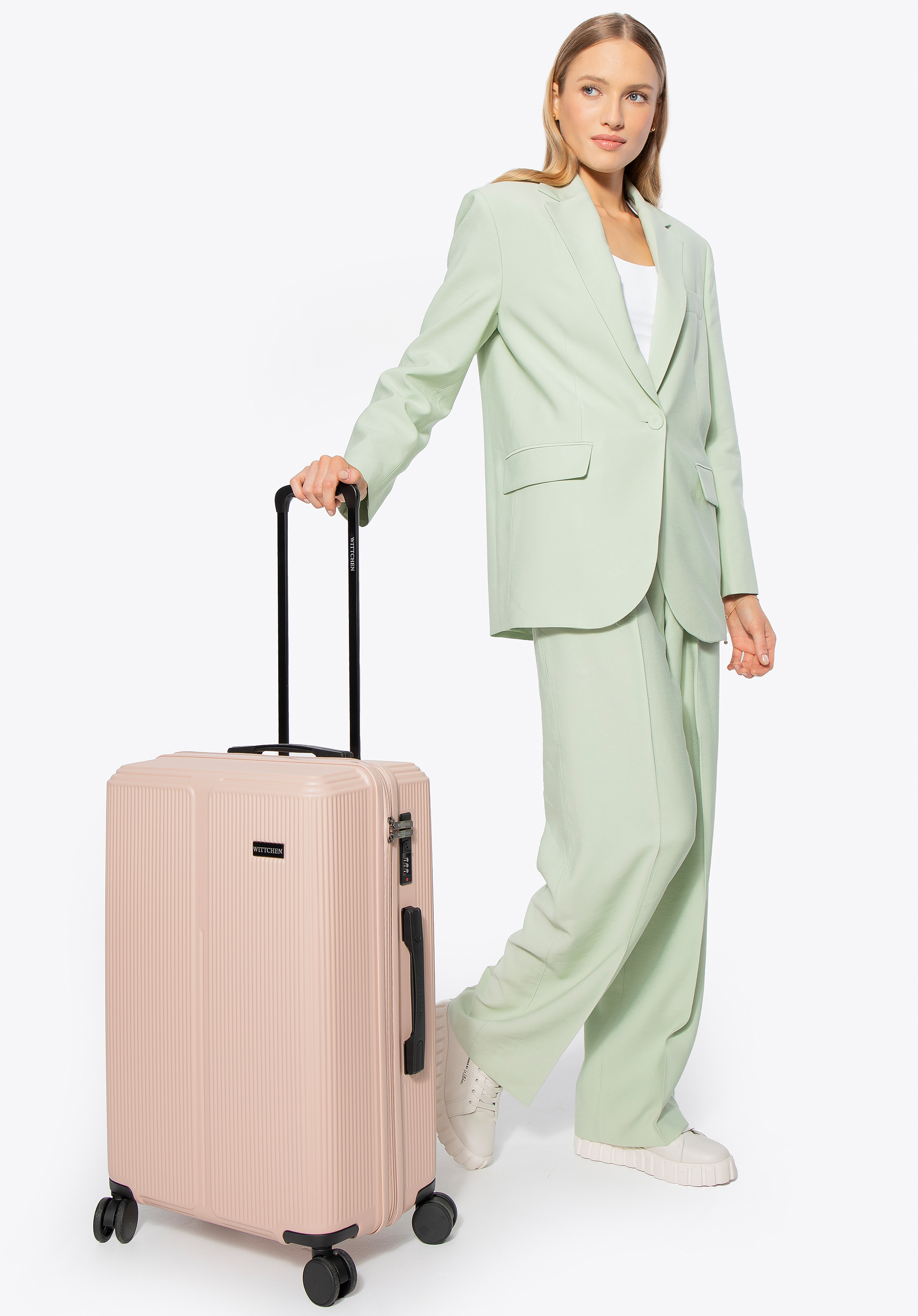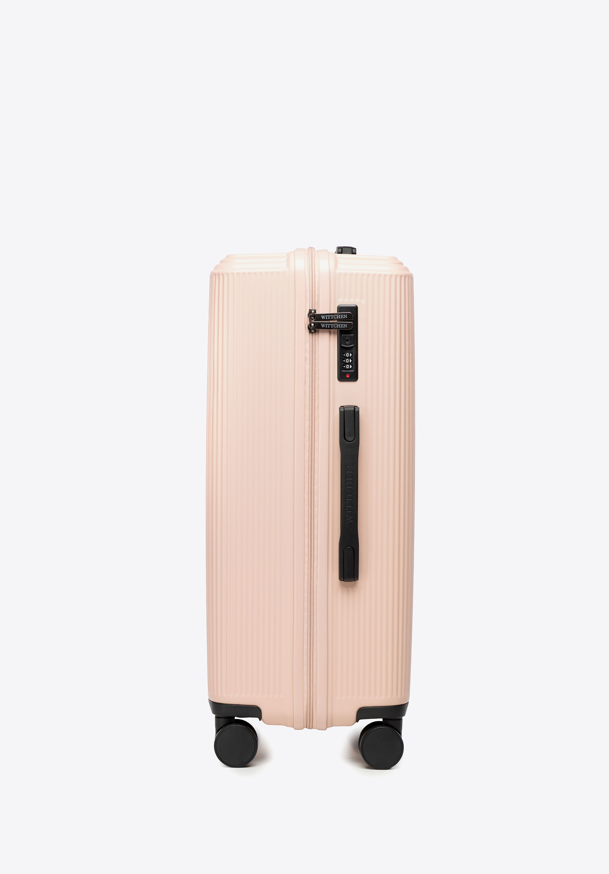 - Design: Pionowe żłobienia i czarne detale nadają walizce nowoczesny wygląd.