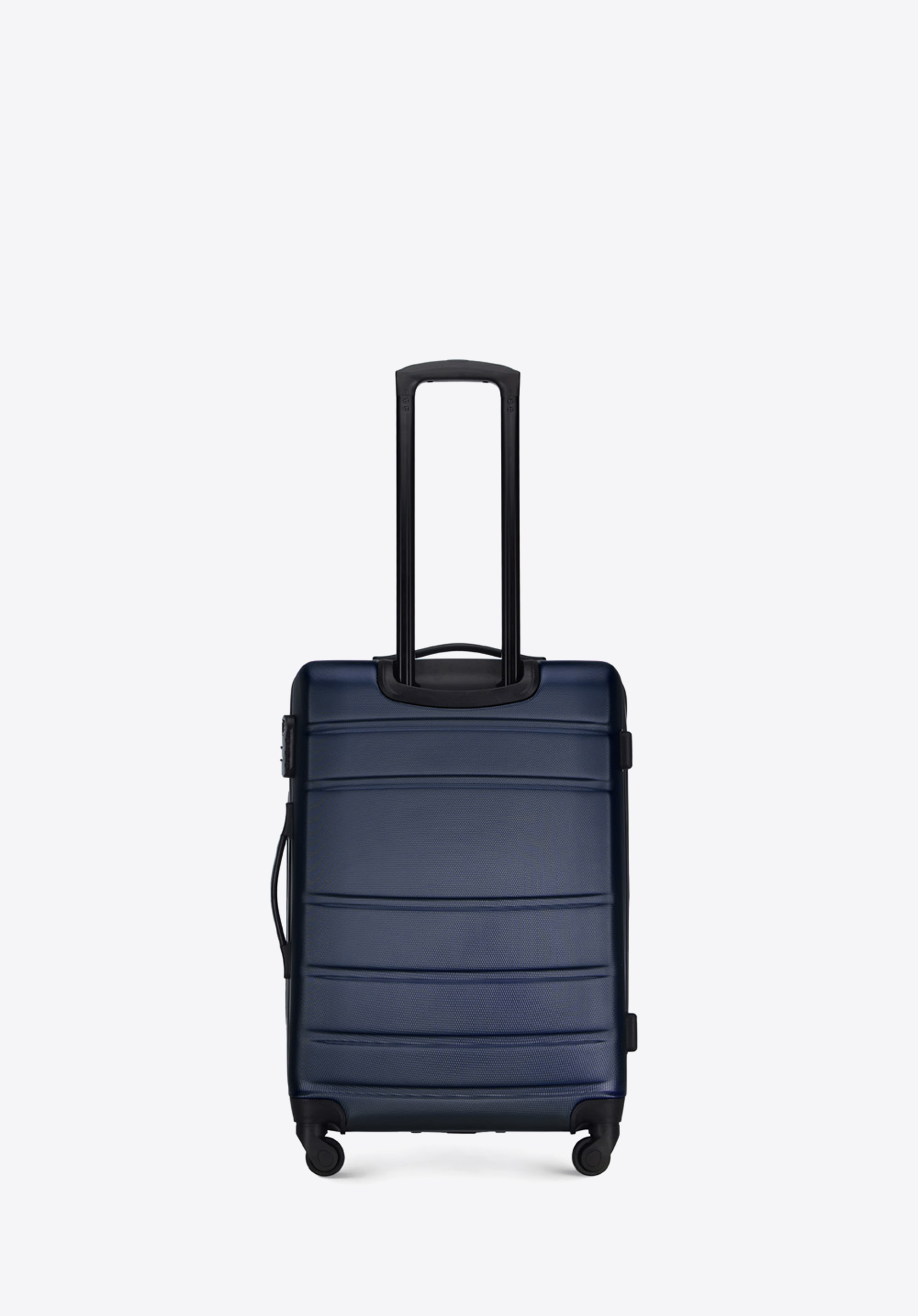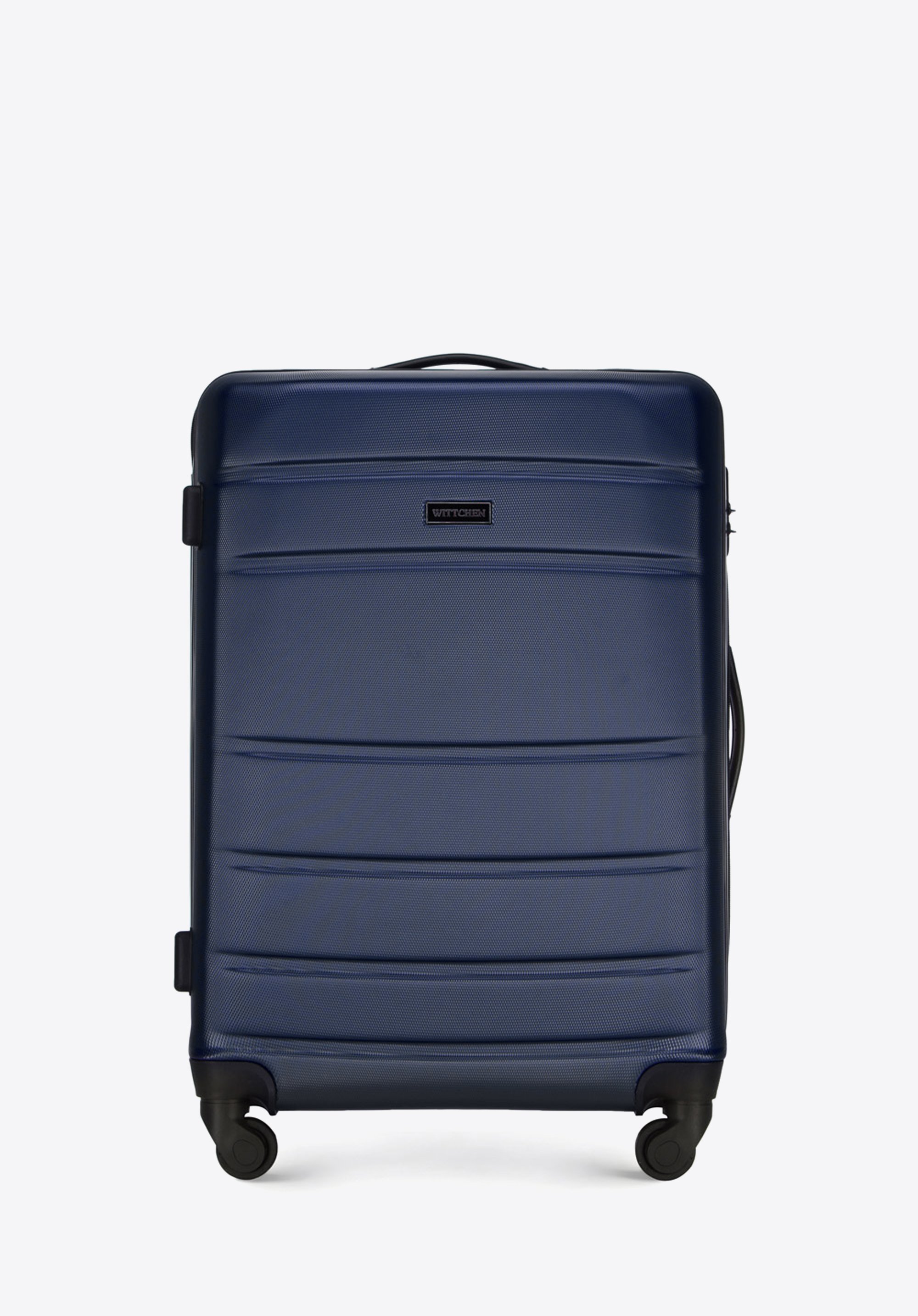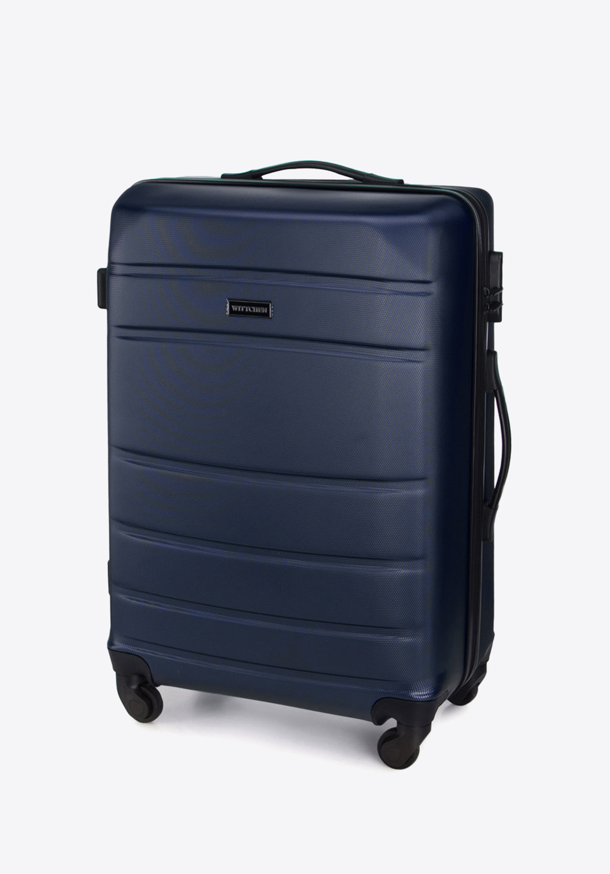 zamek szyfrowany, aluminiowy, wysuwany teleskopowy uchwyt i dwie gumowe rączki, które ułatwiają przenoszenie walizki. Pionowe tłoczenia dodają walizce ciekawego charakteru.