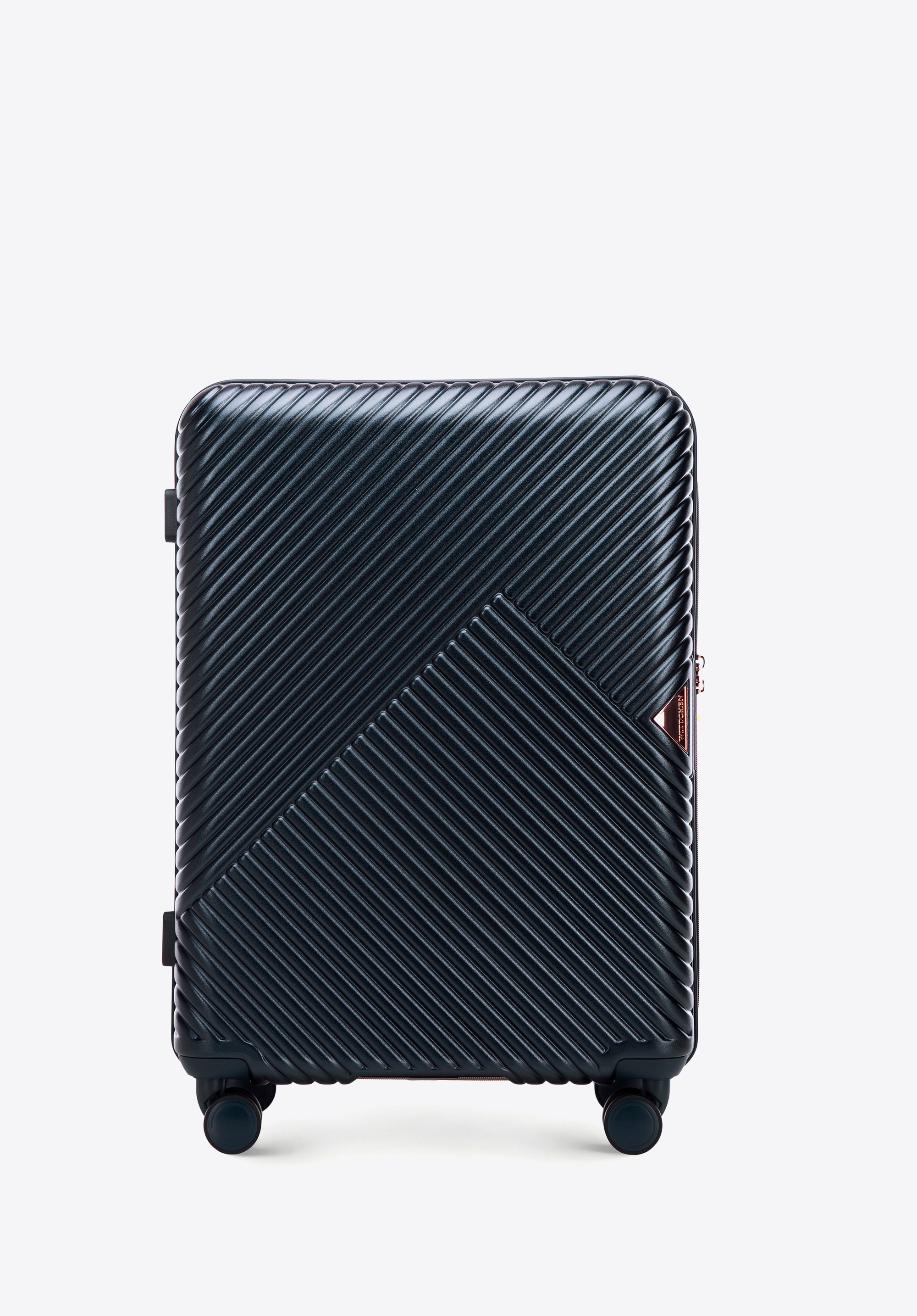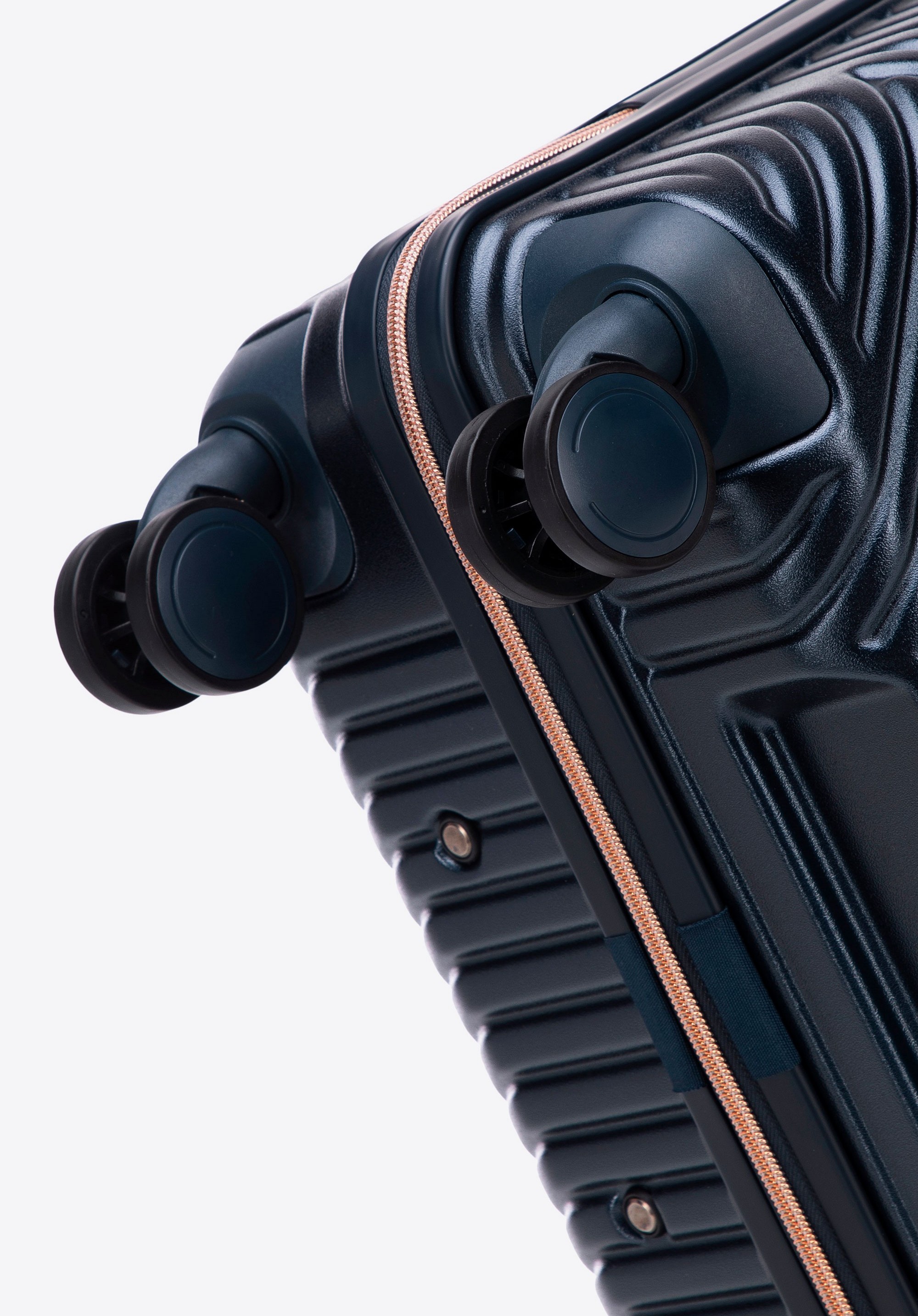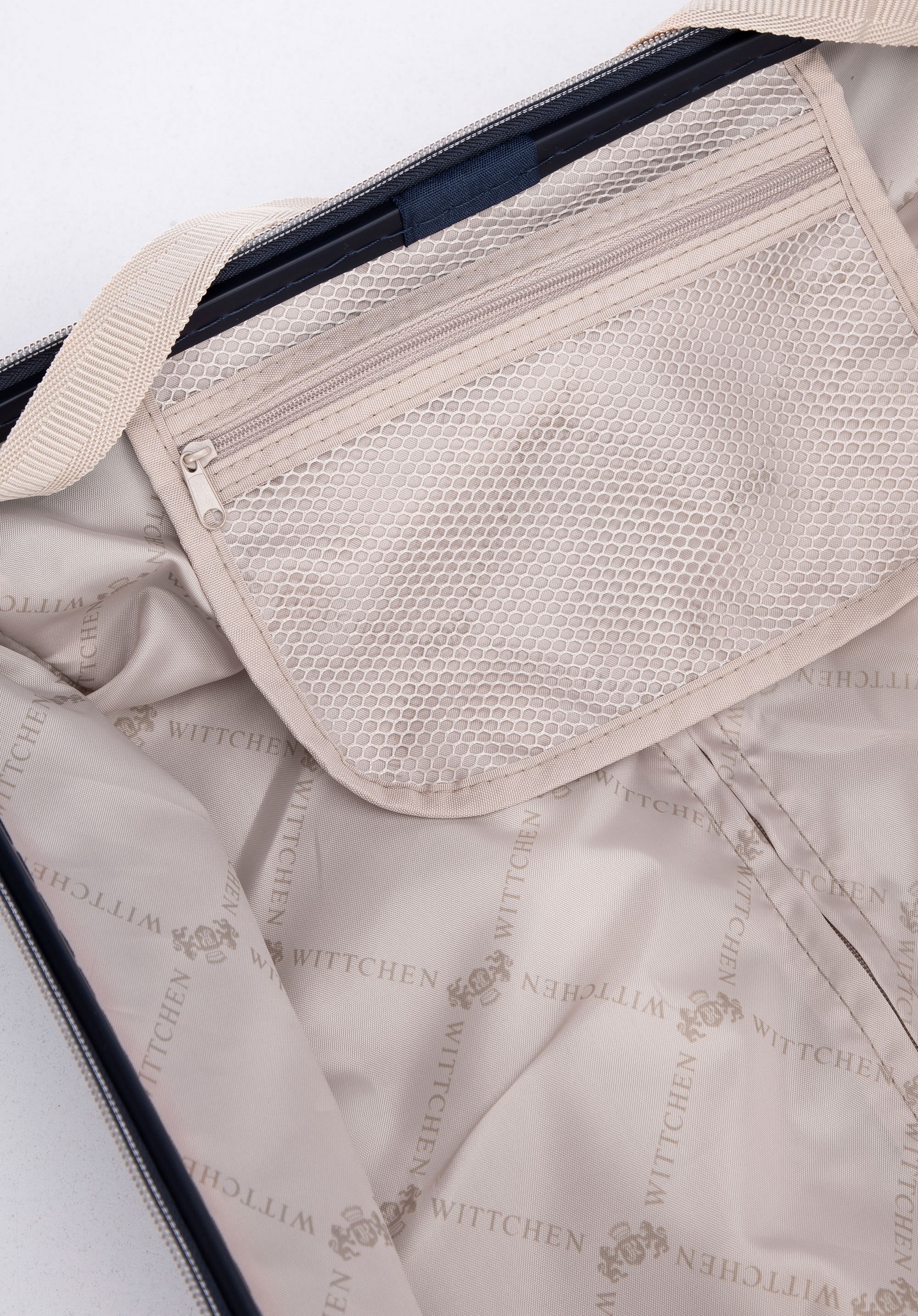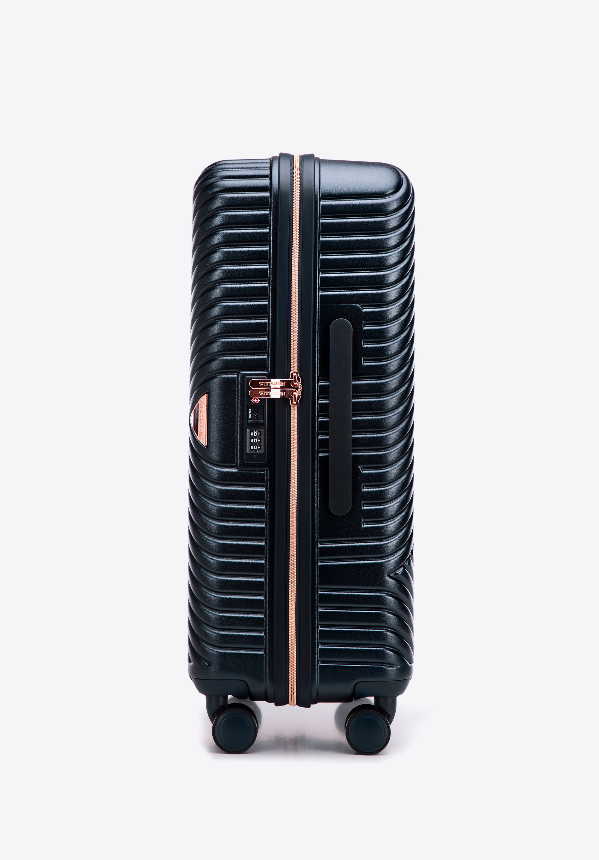 Walizka o średniej wielkości stworzona z polikarbonu z matowym wykończeniem. To designerski projekt z lśniącymi okuciami w kolorze różowego złota. Kółka wykonane z tworzywa sztucznego ABS z elastyczną powłoką. Wnętrze walizki pokrywa beżowa podszewka z logo WITTCHEN.