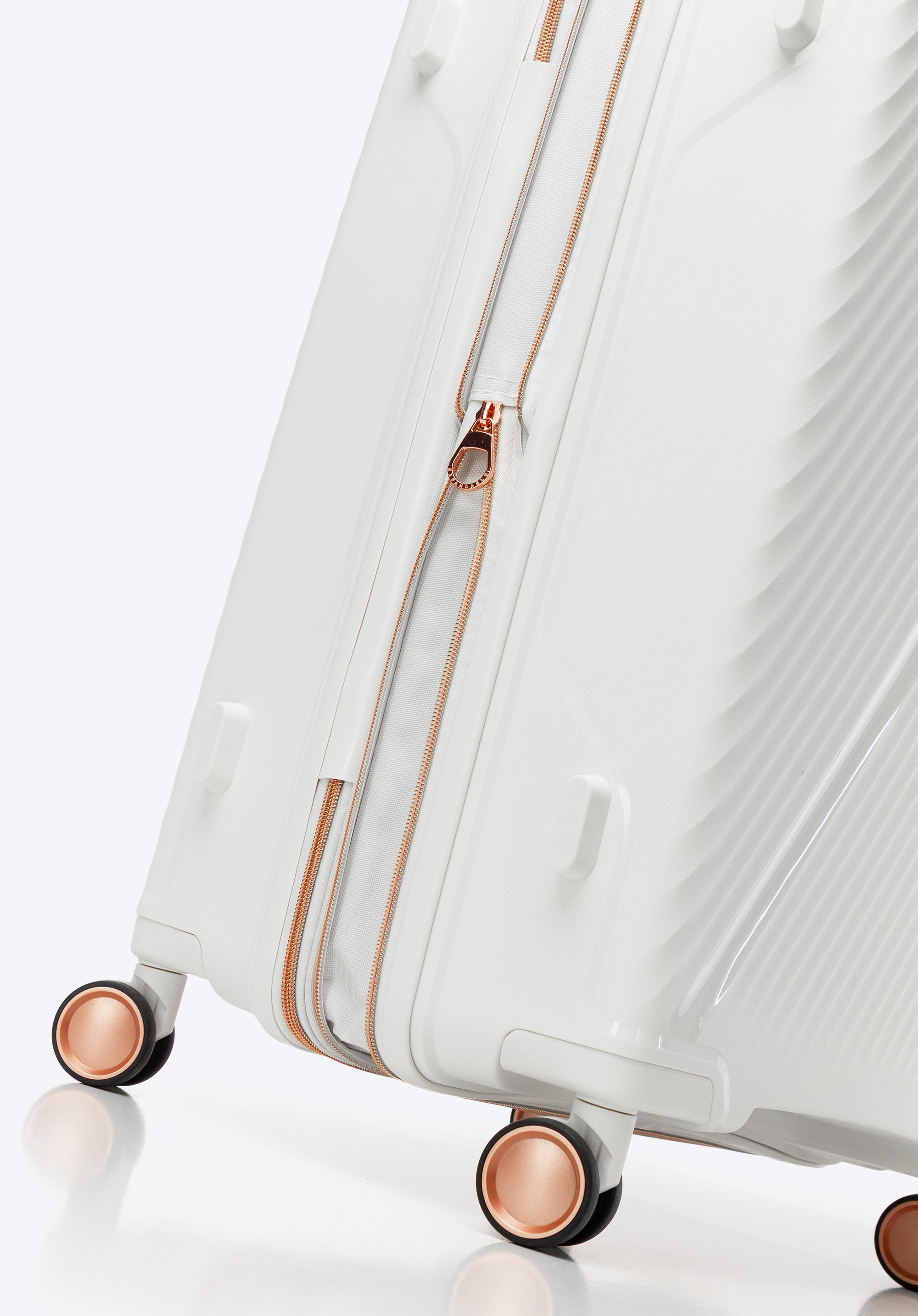 - Stabilność: Cztery boczne nóżki zapewniają stabilne postawienie walizki na boku.