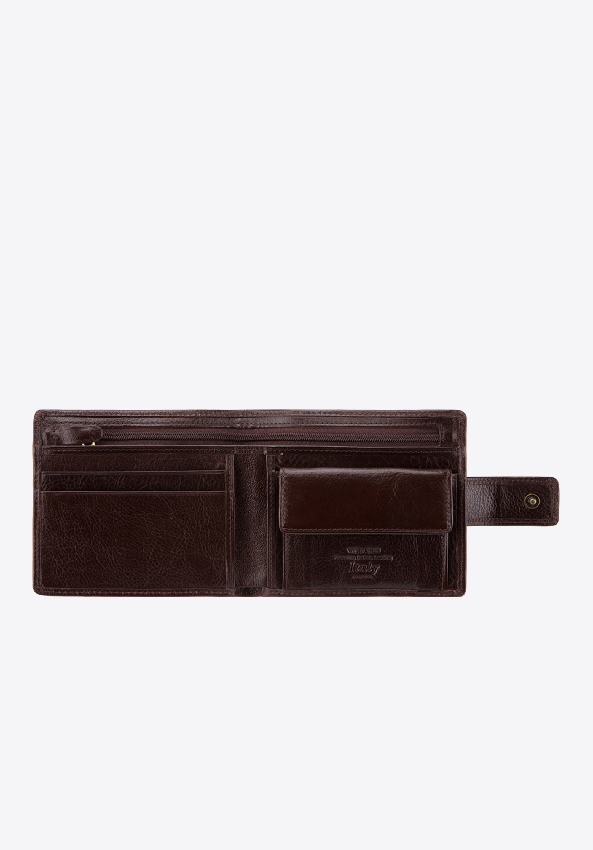 Skórzany portfel męski wyposażony w wygodne zapięcie na napę pozwoli bezpiecznie przechowywać pieniądze i karty kredytowe. Uszyty ręcznie, z dużą dbałością o szczegóły charakteryzuje się wyjątkową elegancją.