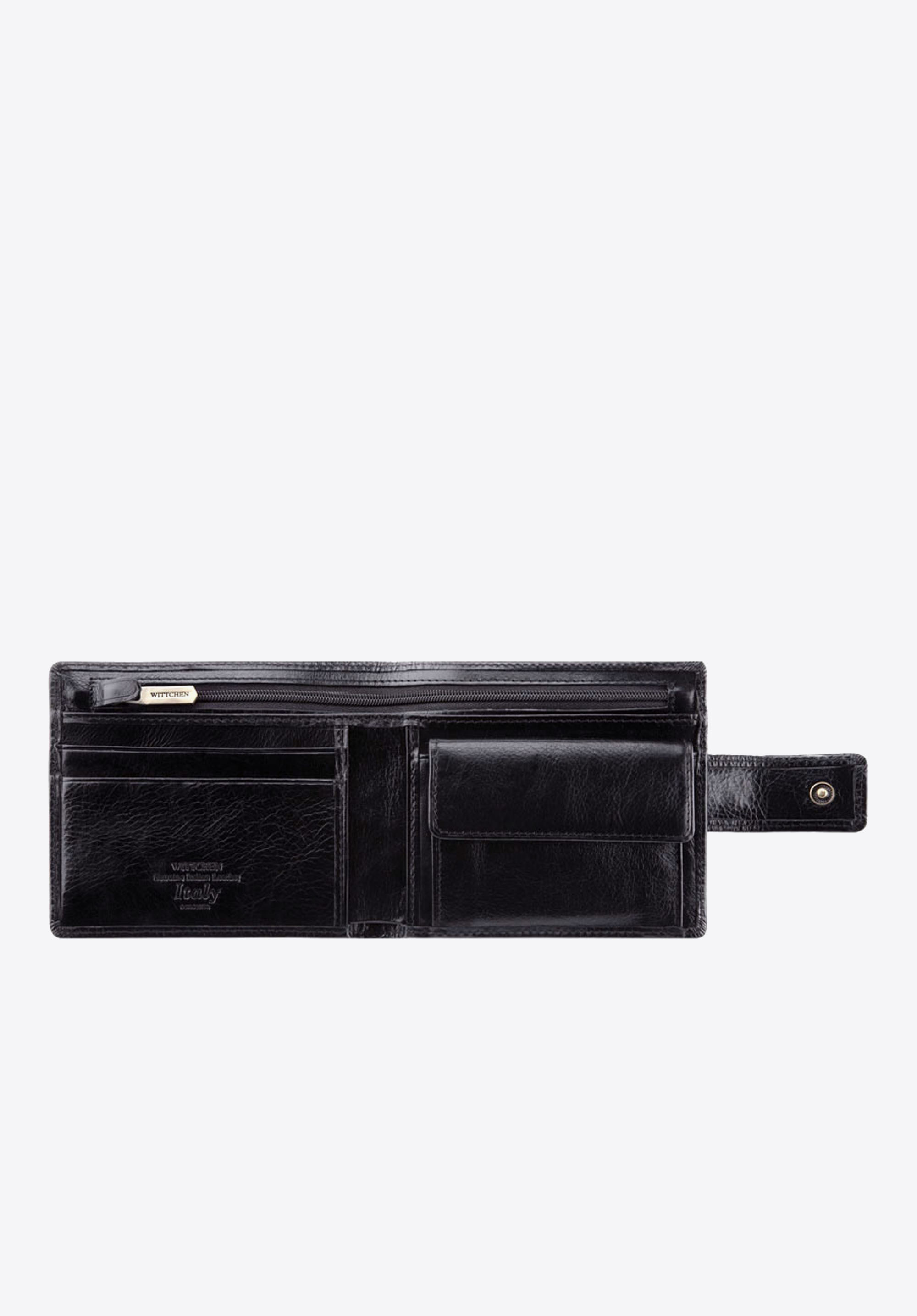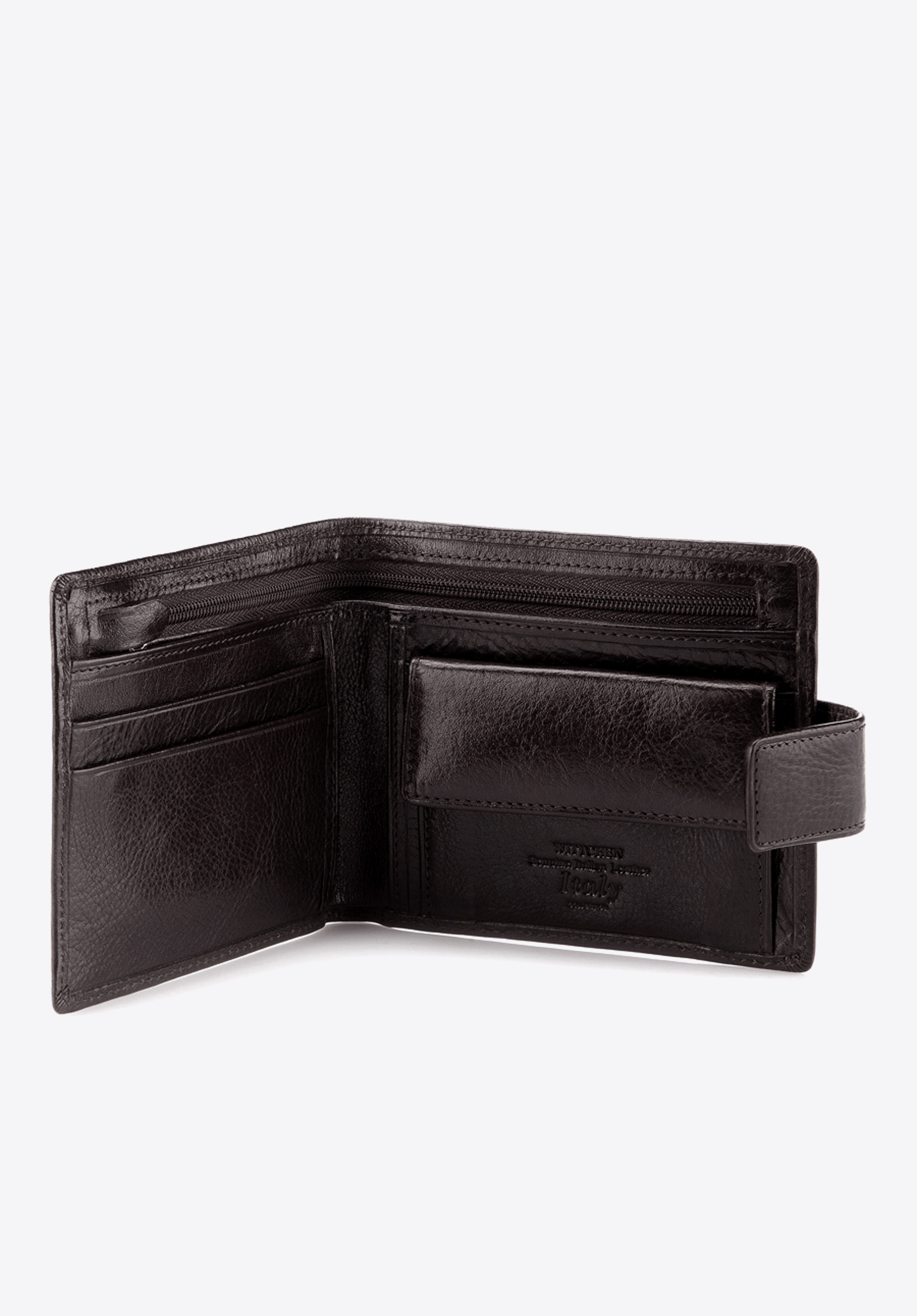 Skórzany portfel męski wyposażony w wygodne zapięcie na napę pozwoli bezpiecznie przechowywać pieniądze i karty kredytowe. Uszyty ręcznie, z dużą dbałością o szczegóły charakteryzuje się wyjątkową elegancją.