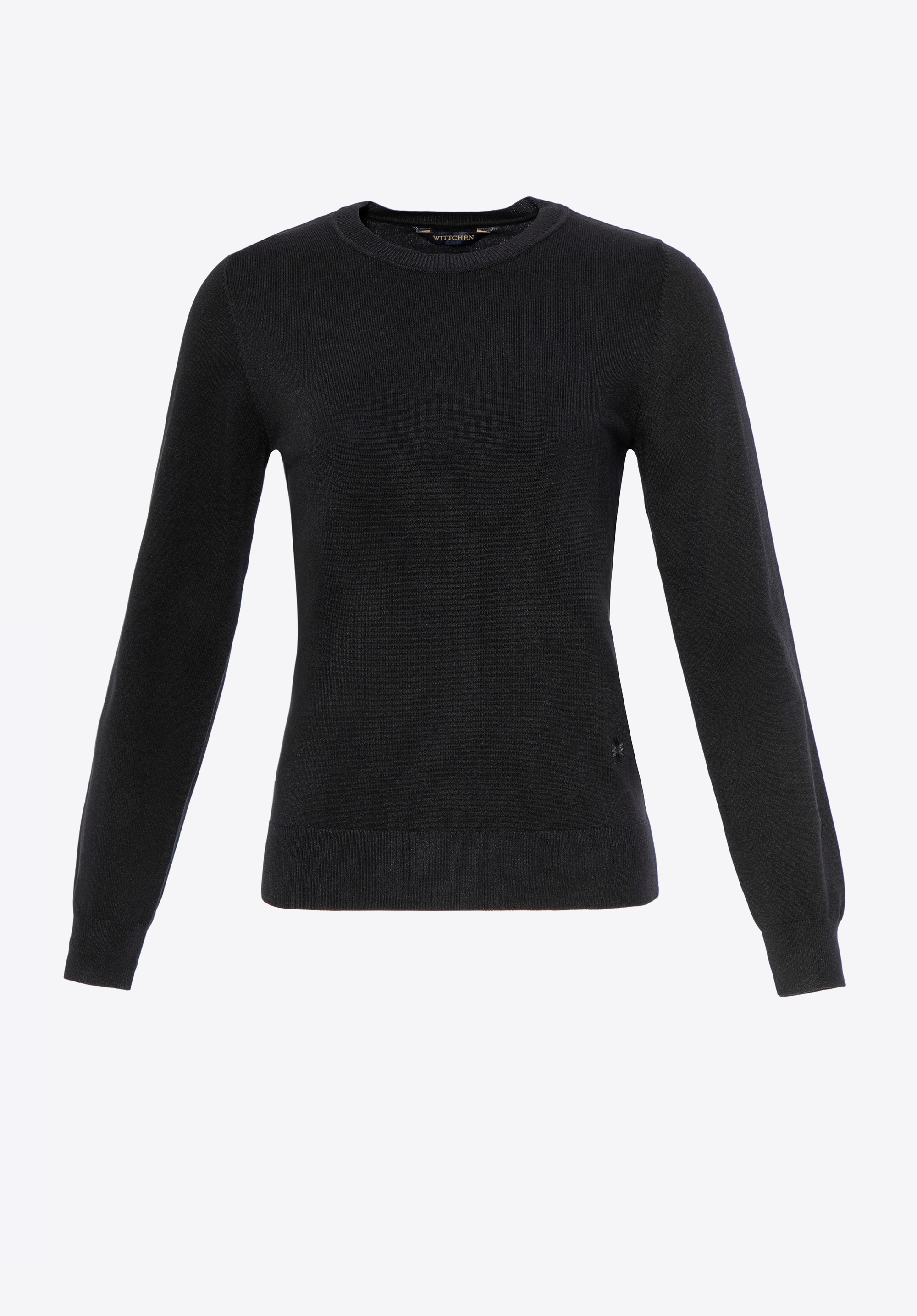 Ten sweter to idealny wybór, jeśli szukasz czegoś wygodnego, ale z klasą. Wykonany z cienkiej, miękkiej wiskozy i nylonu, zapewnia komfort noszenia przez cały dzień – niezależnie od okazji. Długie rękawy zakończone ściągaczami sprawiają, że całość dobrze leży i zachowuje formę, a prążkowany dekolt podkreśla prosty, ale dopracowany charakter swetra. Haftowane logo producenta w dolnym rogu to subtelny akcent, który dopełnia całość.