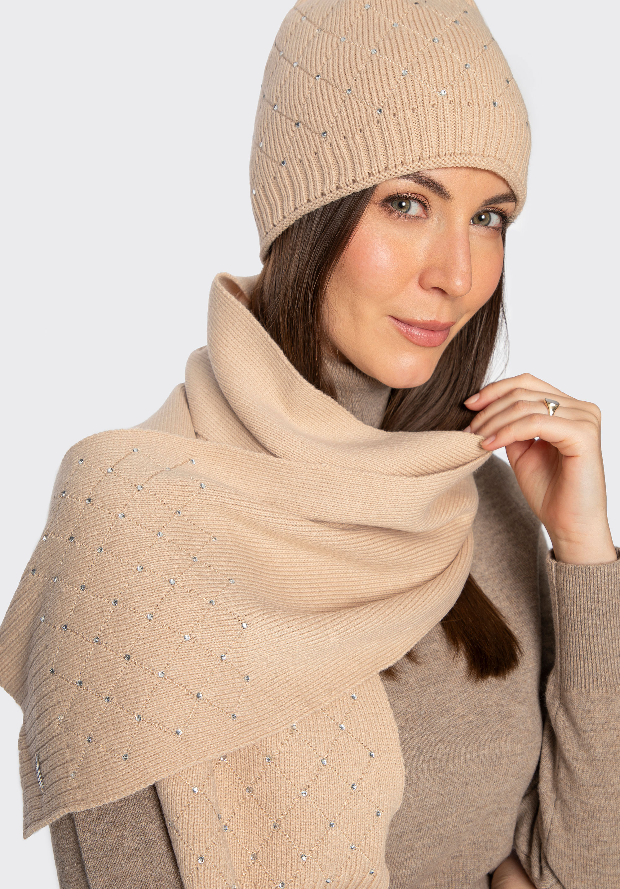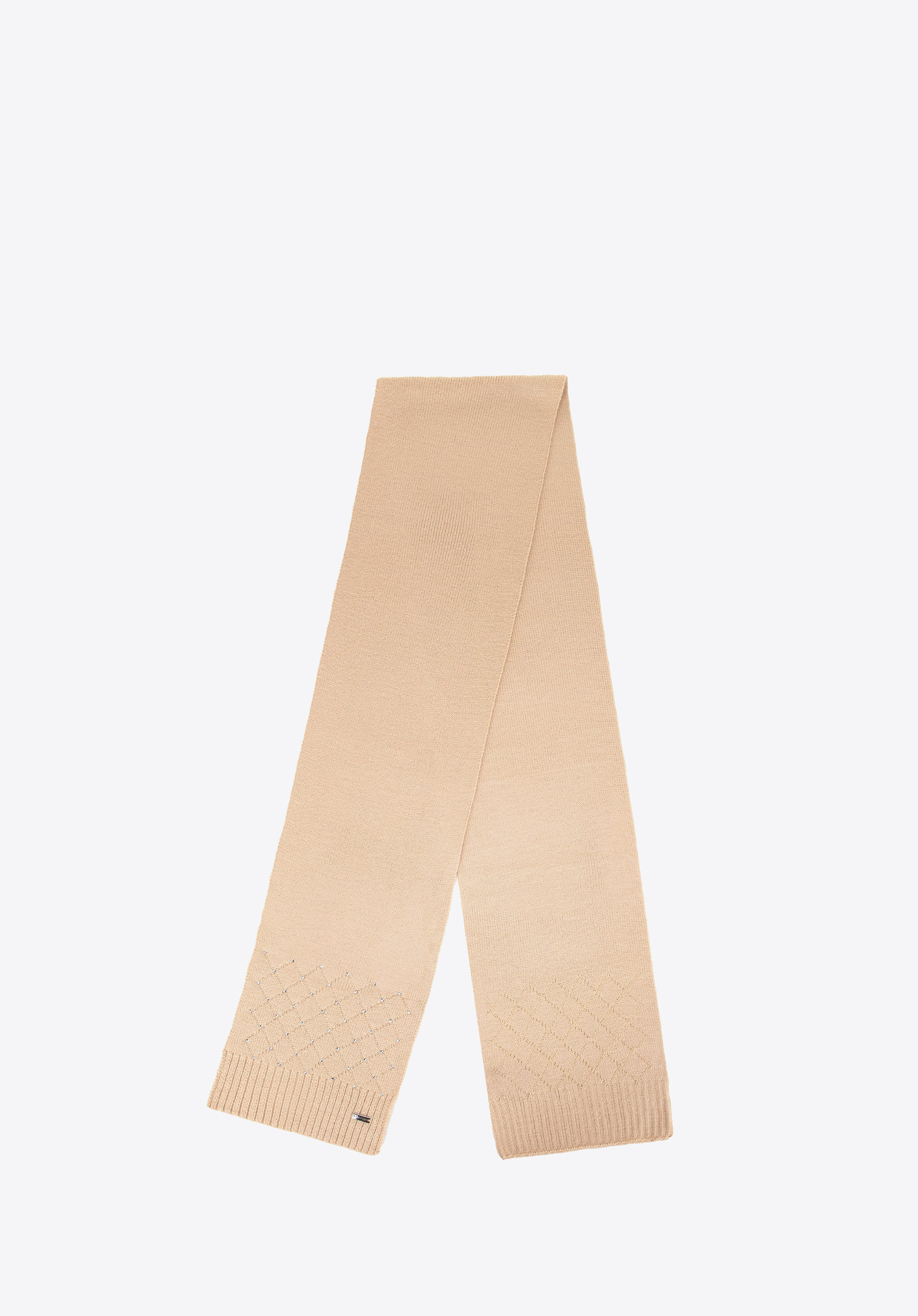Dodaj swojej zimowej stylizacji odrobinę wyjątkowego szyku dzięki naszemu damskiemu szalikowi ozdobionemu geometrycznym wzorem oraz delikatnymi cyrkoniami. Ten miękki, akrylowy szalik nie tylko skutecznie otuli Cię w chłodne dni, ale także podkreśli Twój wyrafinowany gust i doda każdemu look’owi eleganckiego charakteru.
