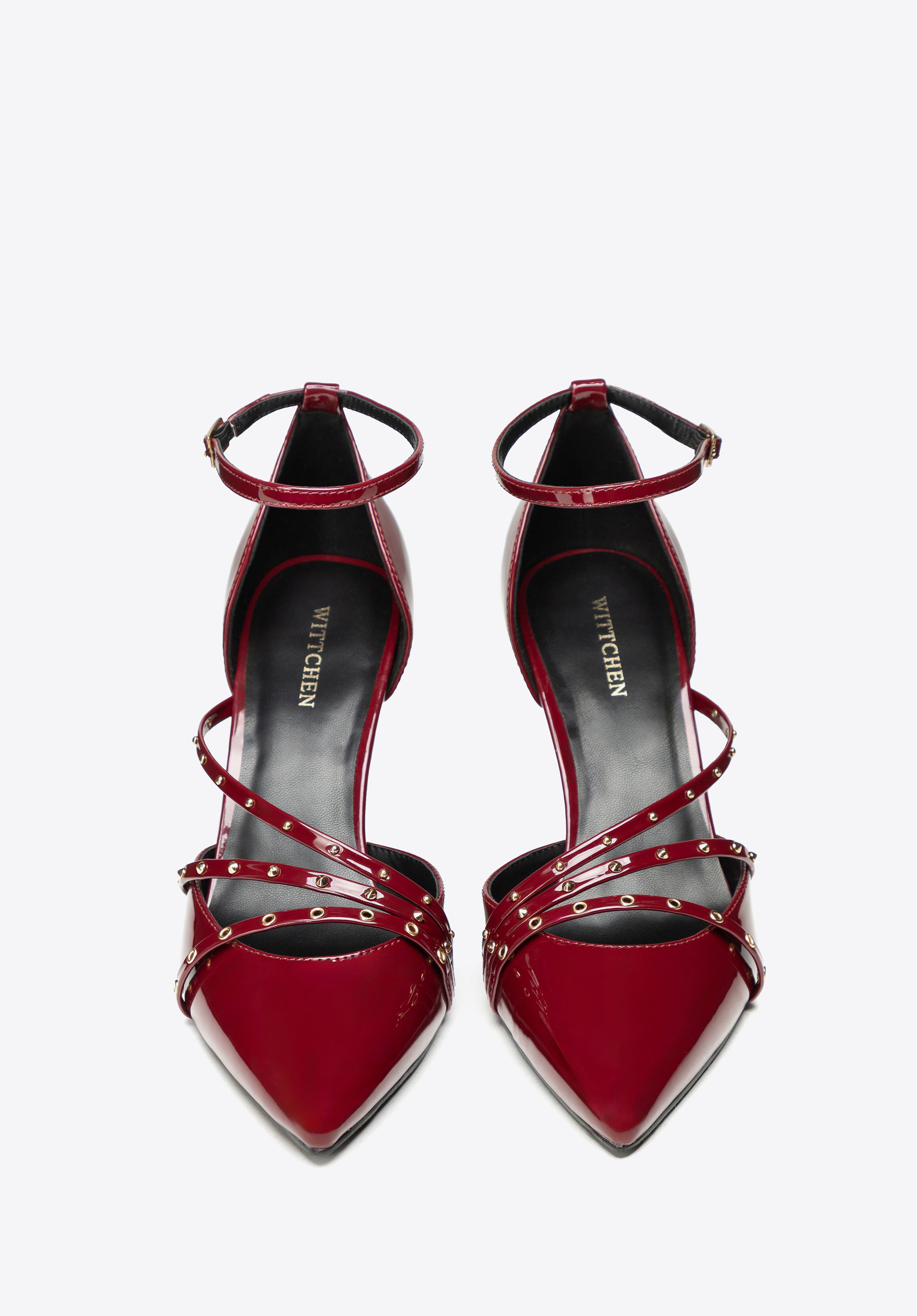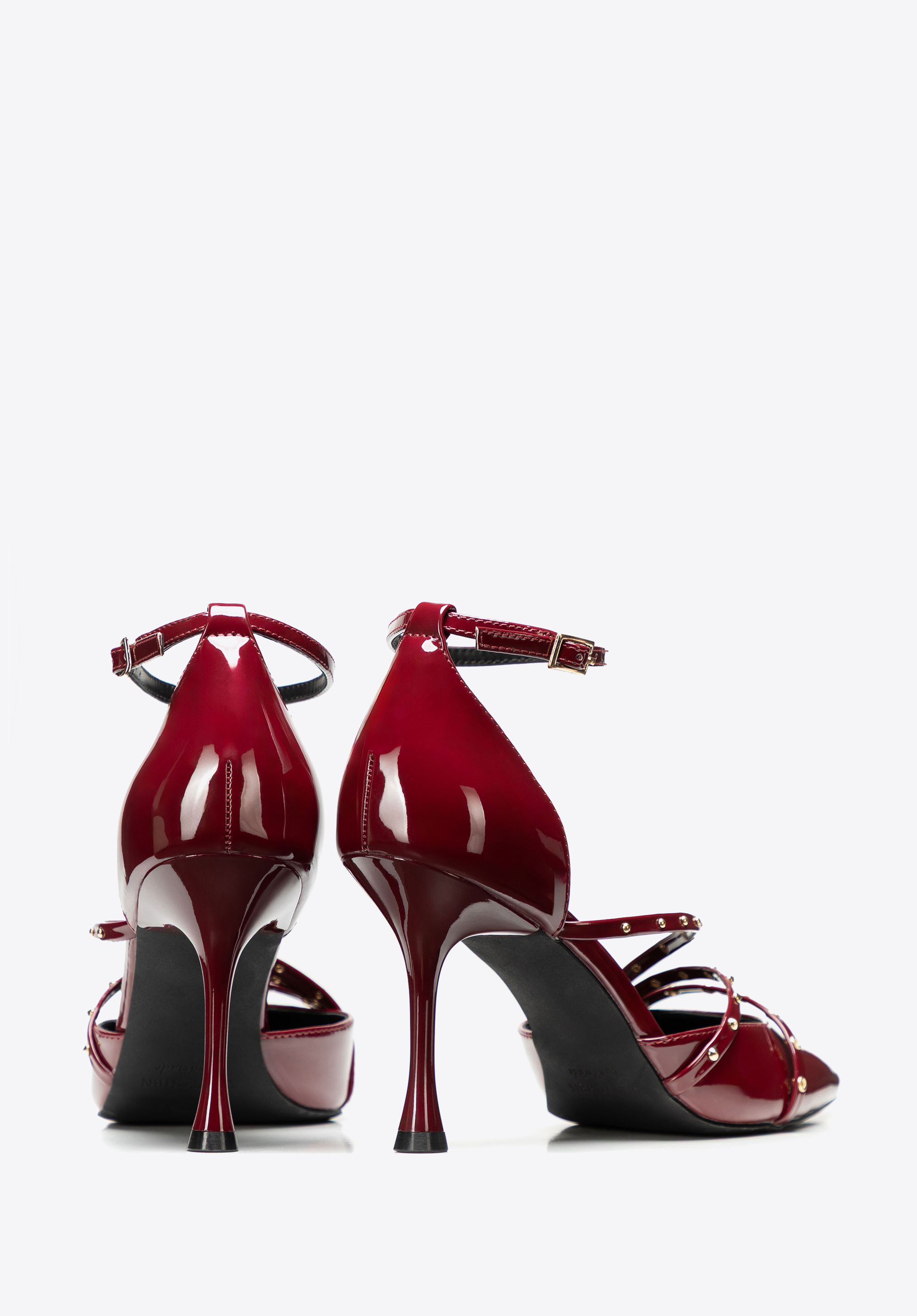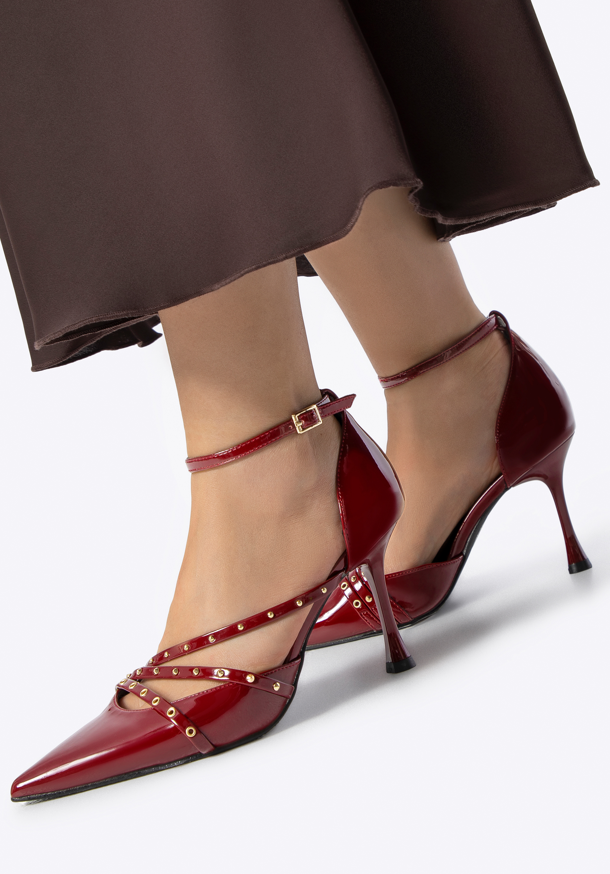 Szpilki damskie z lakierowanej ekoskóry z ćwiekami są dla kobiet, które chcą połączyć klasyczną formę ze zdecydowanym, modowym akcentem. Lakierowany połysk przyciąga wzrok, szpic wysmukla stopę, a ćwieki i pasek przy kostce dodają stylizacji charakteru i pewności.