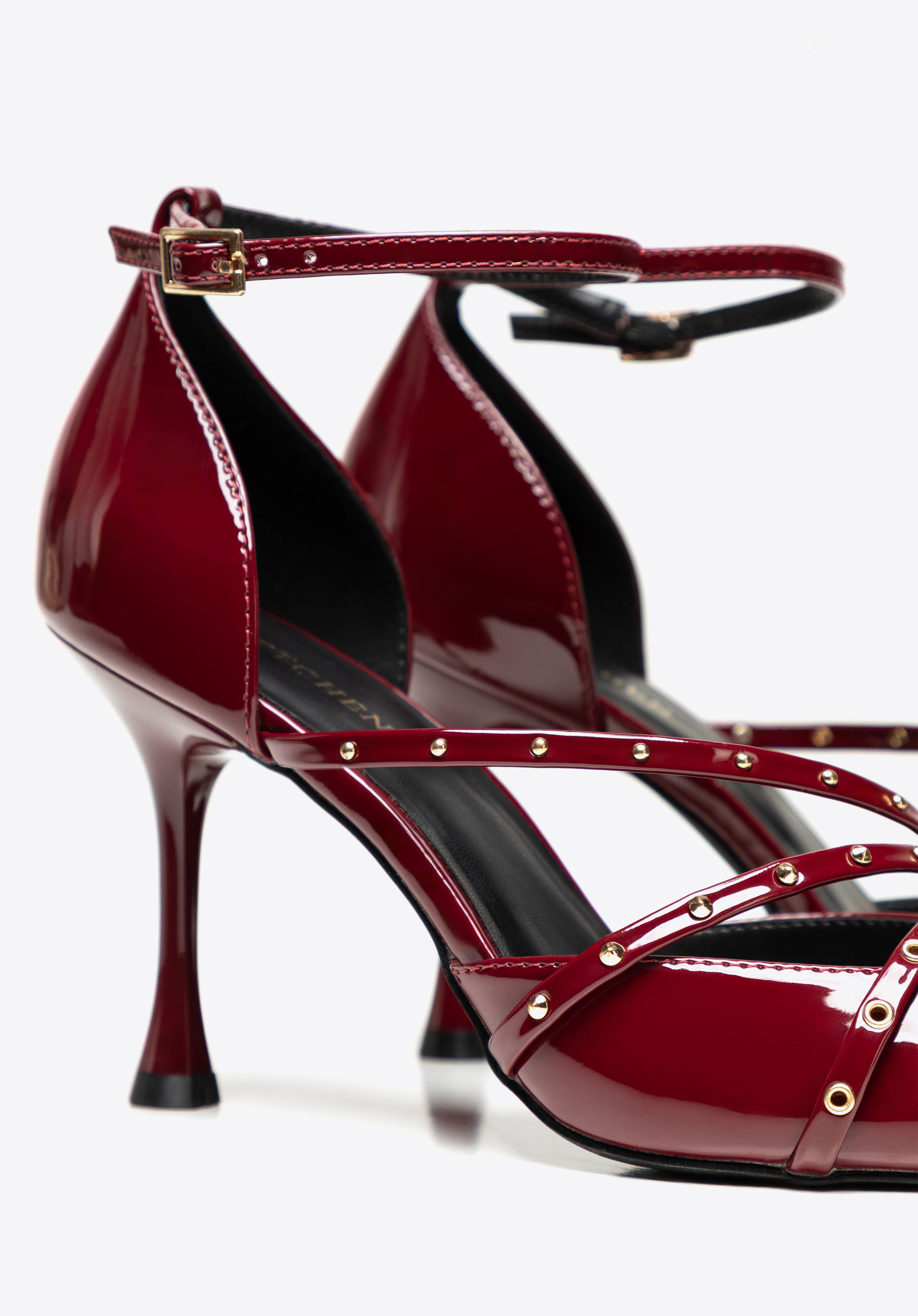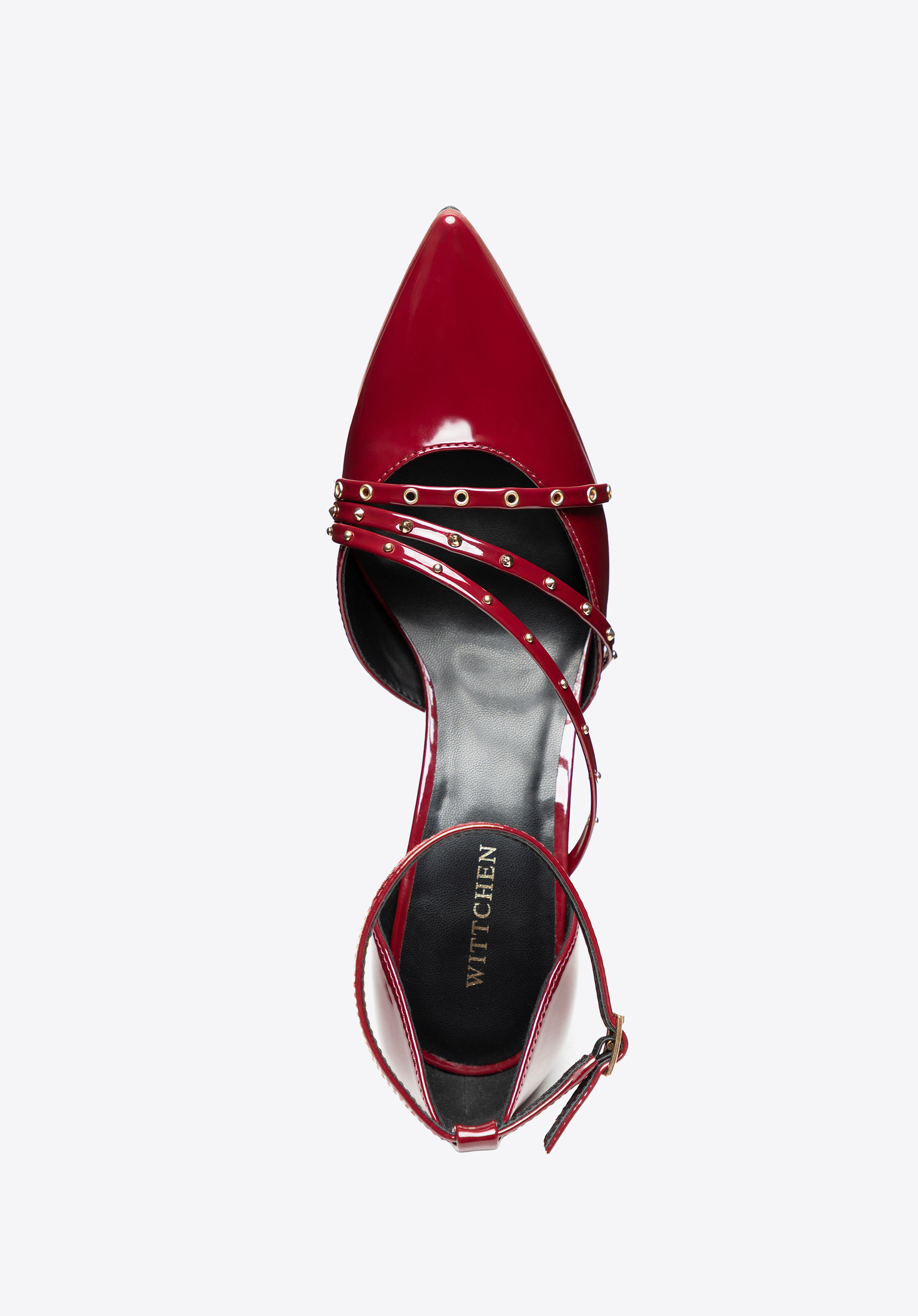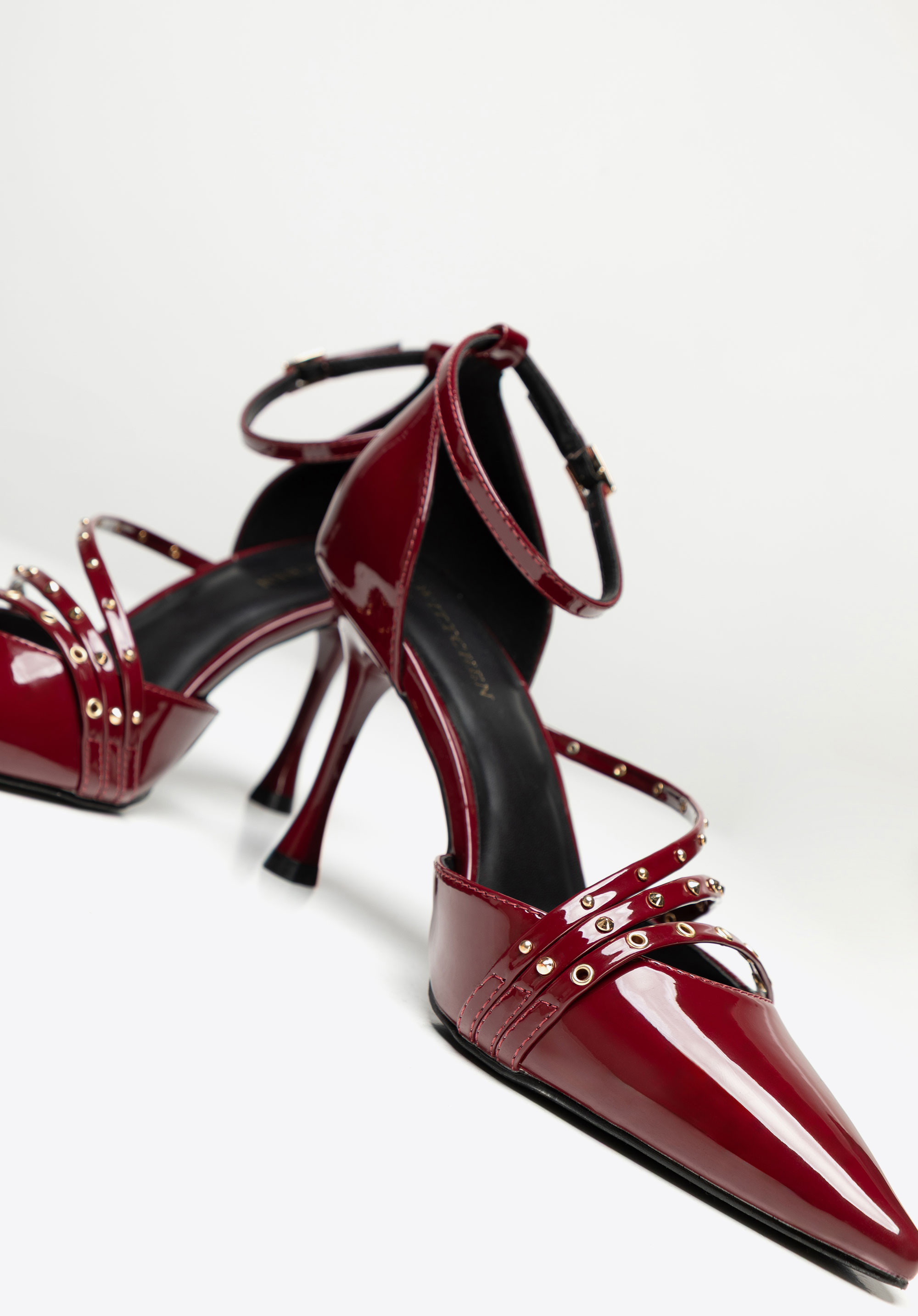 Szpilki damskie z lakierowanej ekoskóry z ćwiekami są dla kobiet, które chcą połączyć klasyczną formę ze zdecydowanym, modowym akcentem. Lakierowany połysk przyciąga wzrok, szpic wysmukla stopę, a ćwieki i pasek przy kostce dodają stylizacji charakteru i pewności.