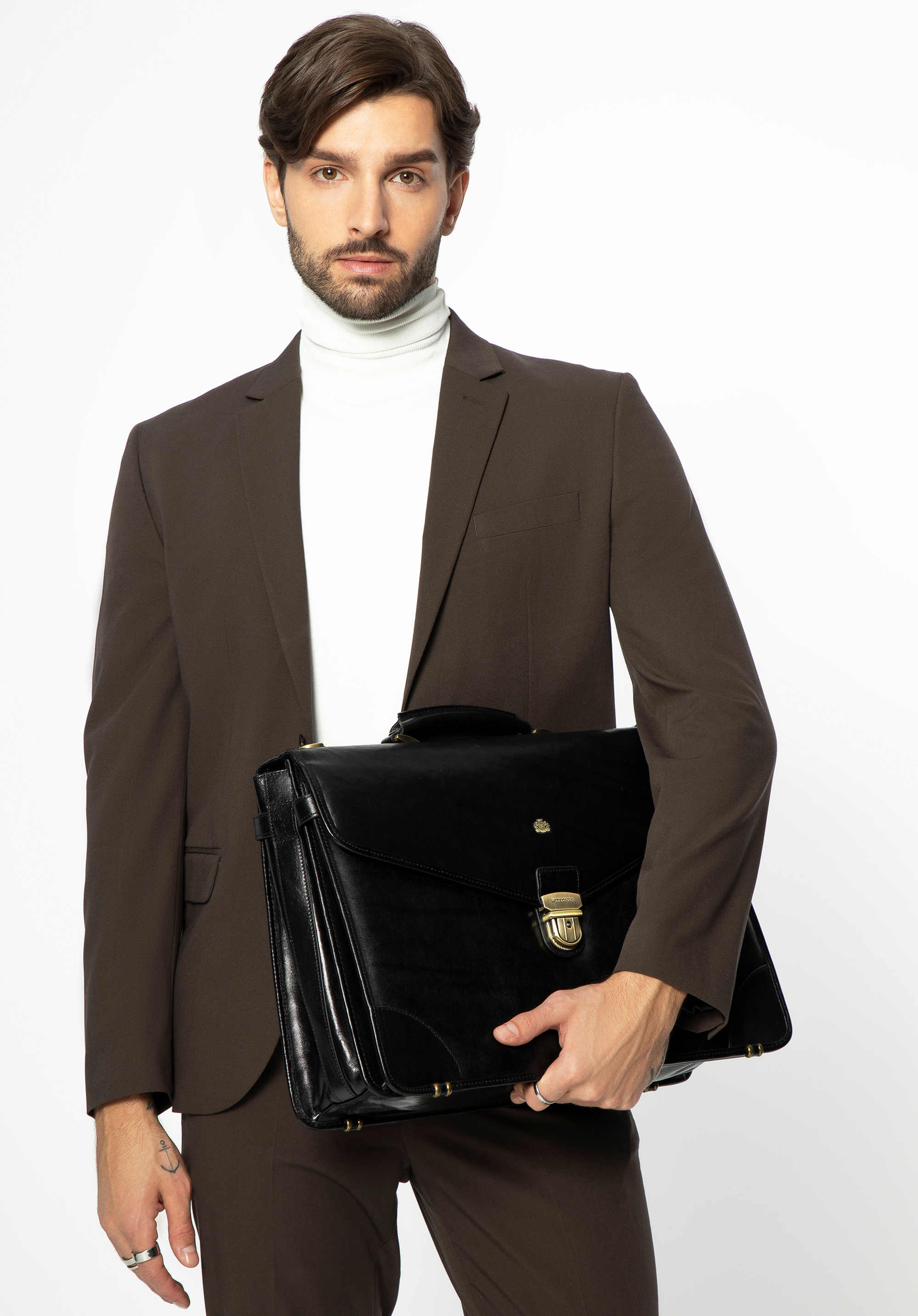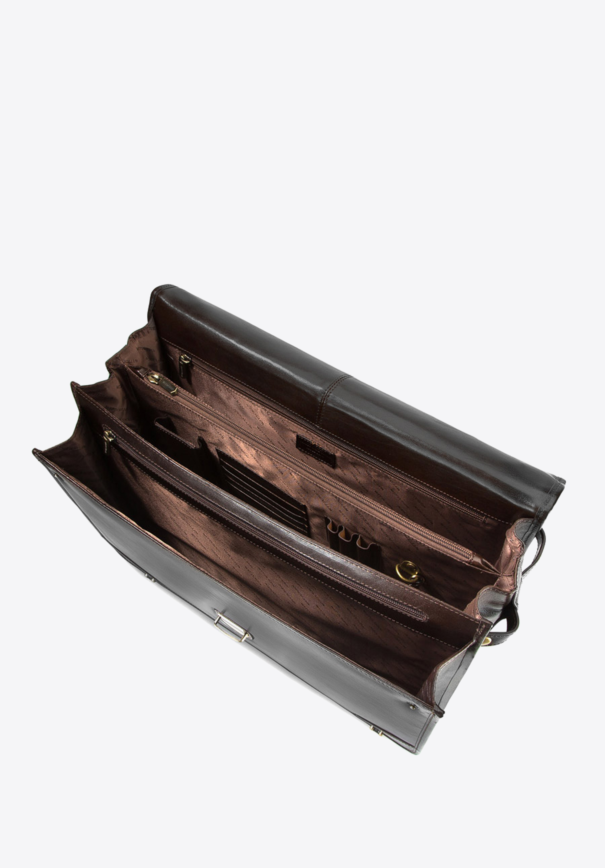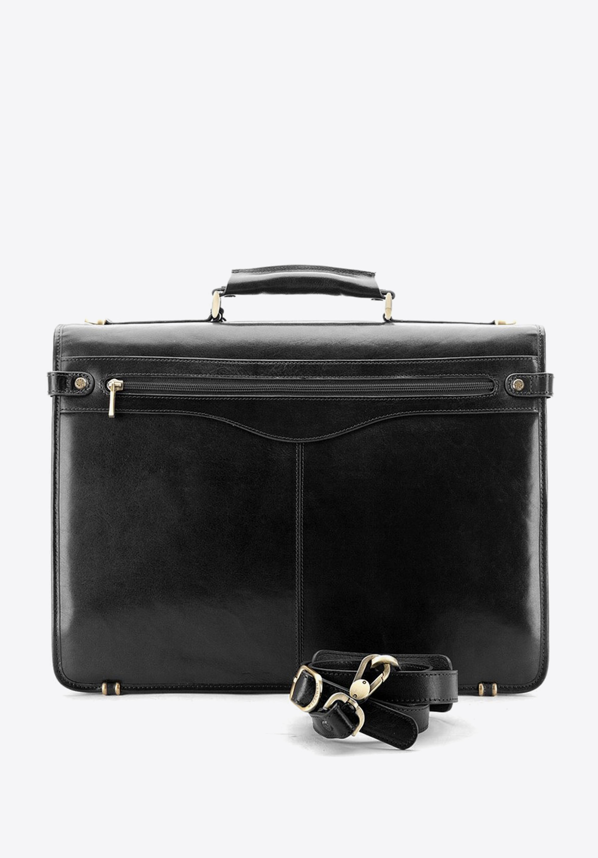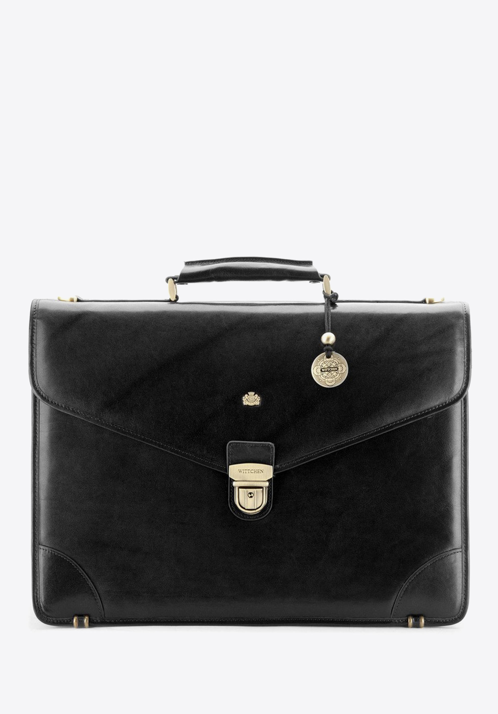 Klasyczna, skórzana teczka z okuciami w kolorze złota to funkcjonalny i niezwykle elegancki dodatek. Teczka została wykonana ręcznie z wytrzymałej, subtelnie połyskującej skóry cielęcej.