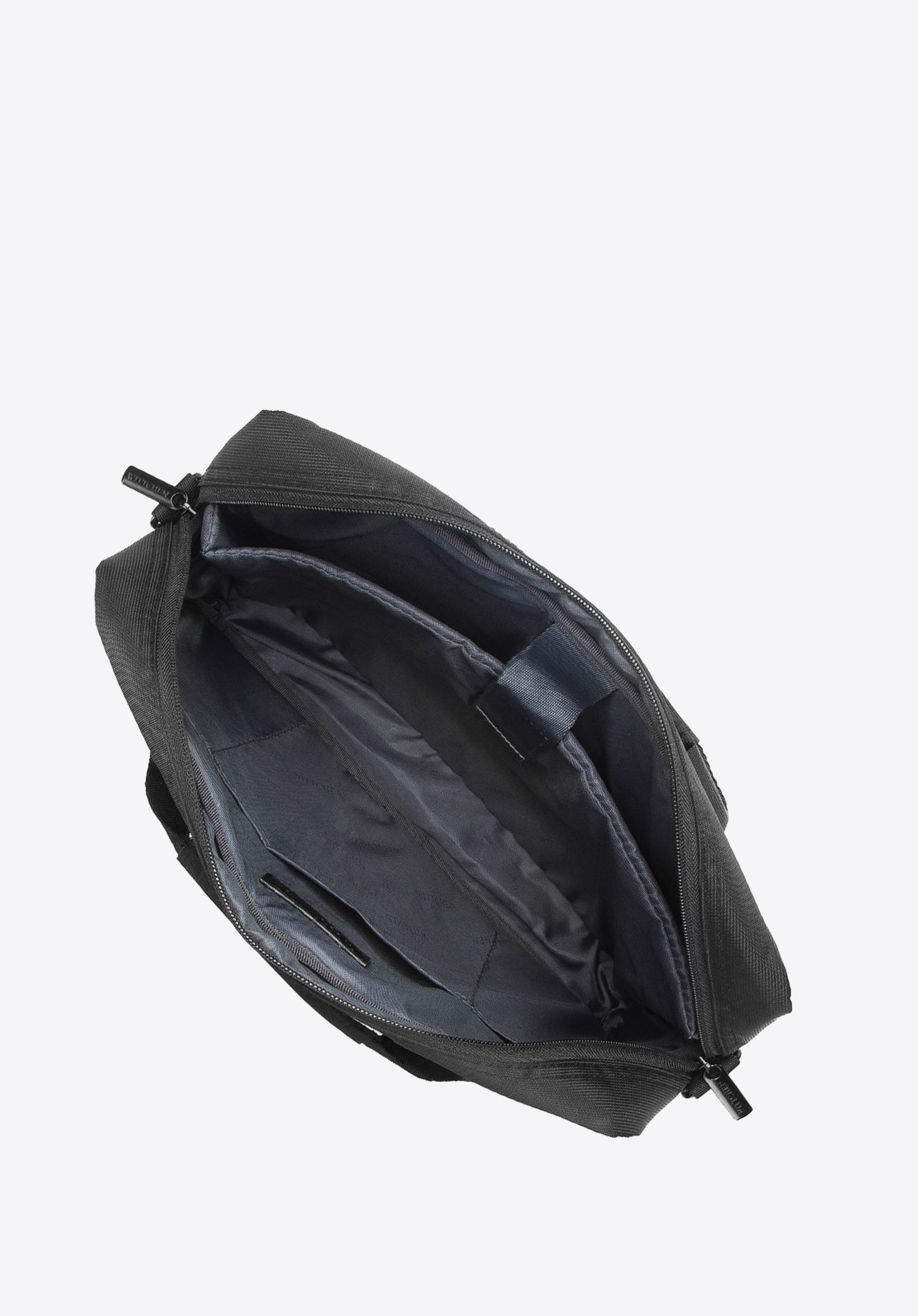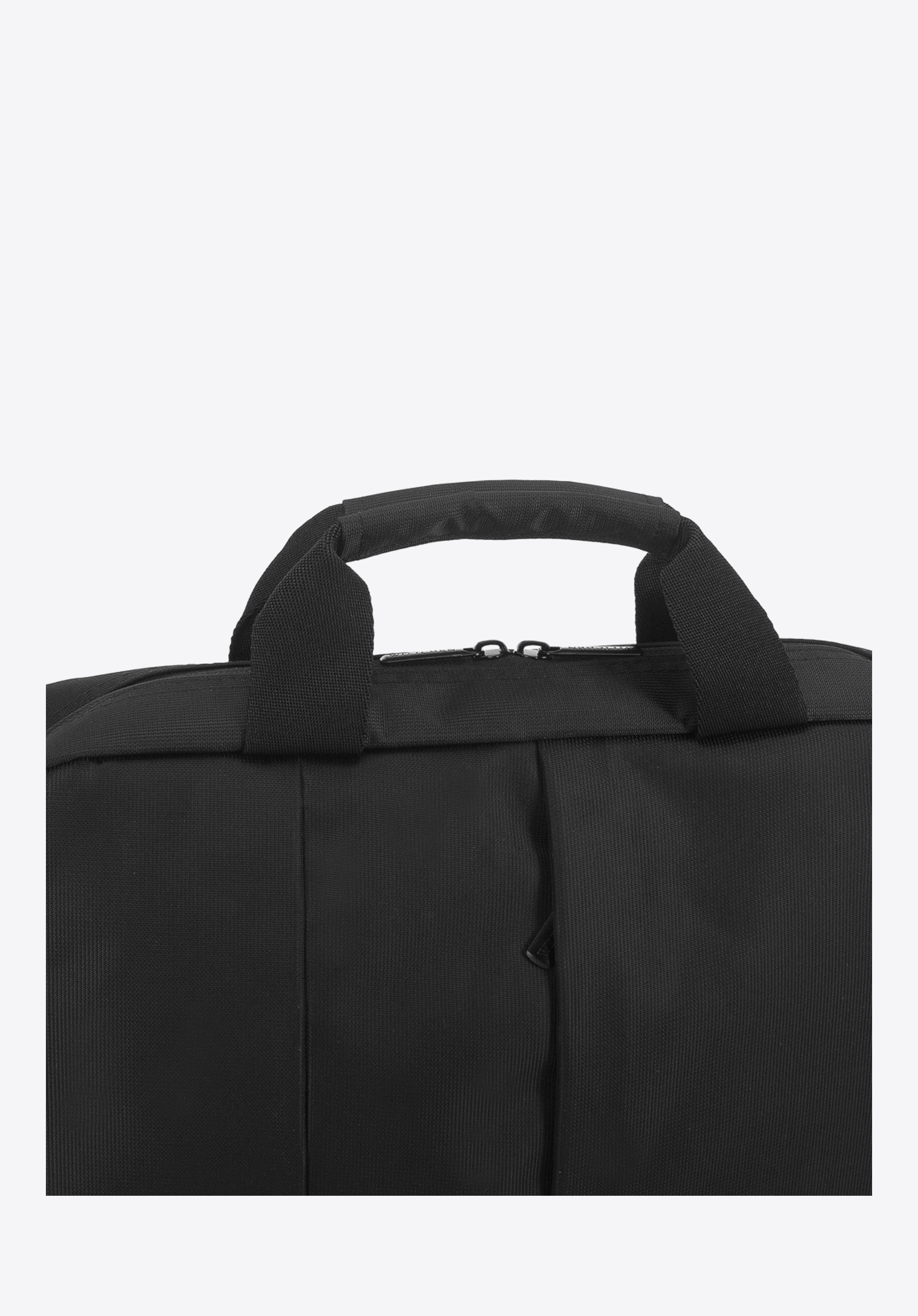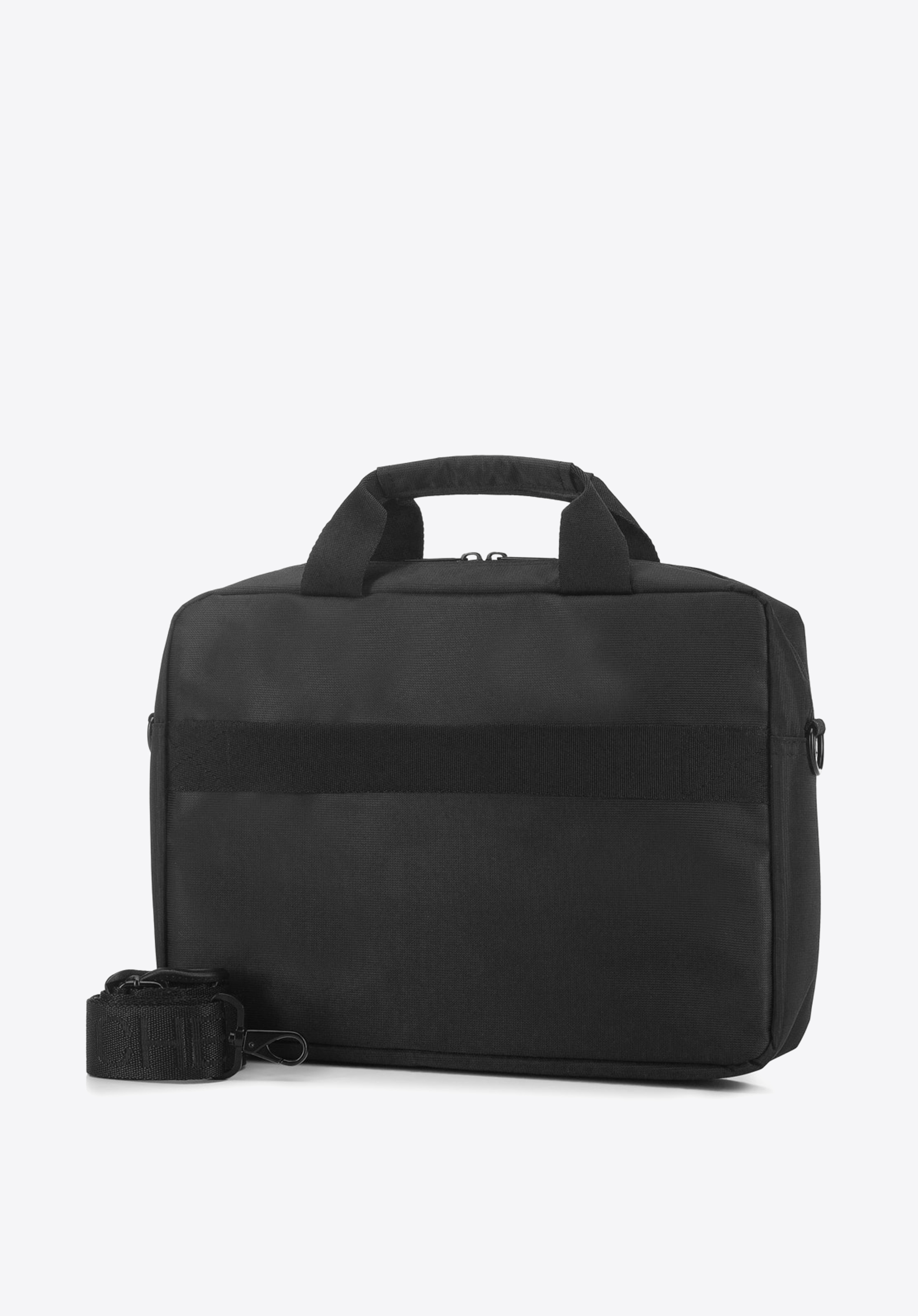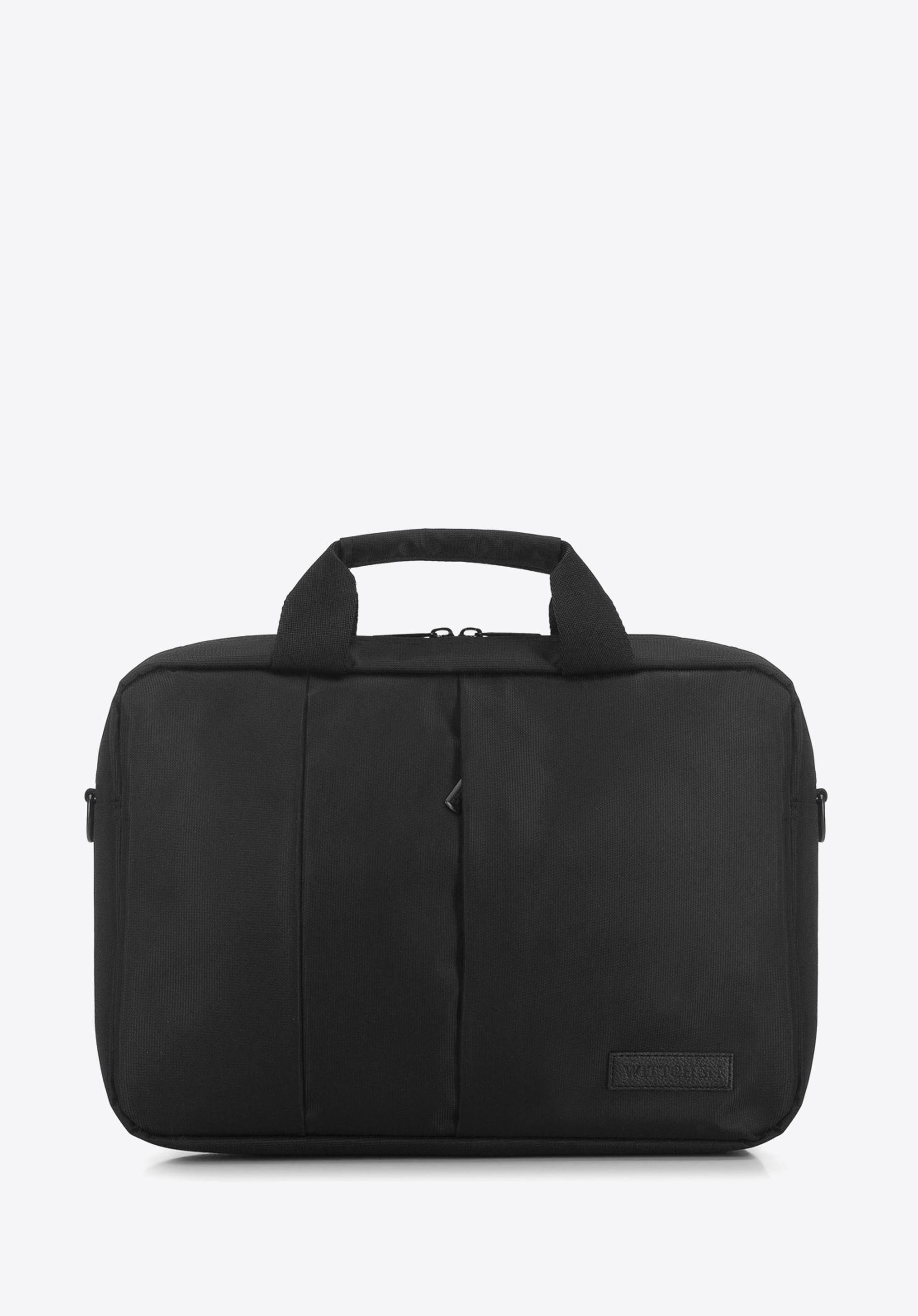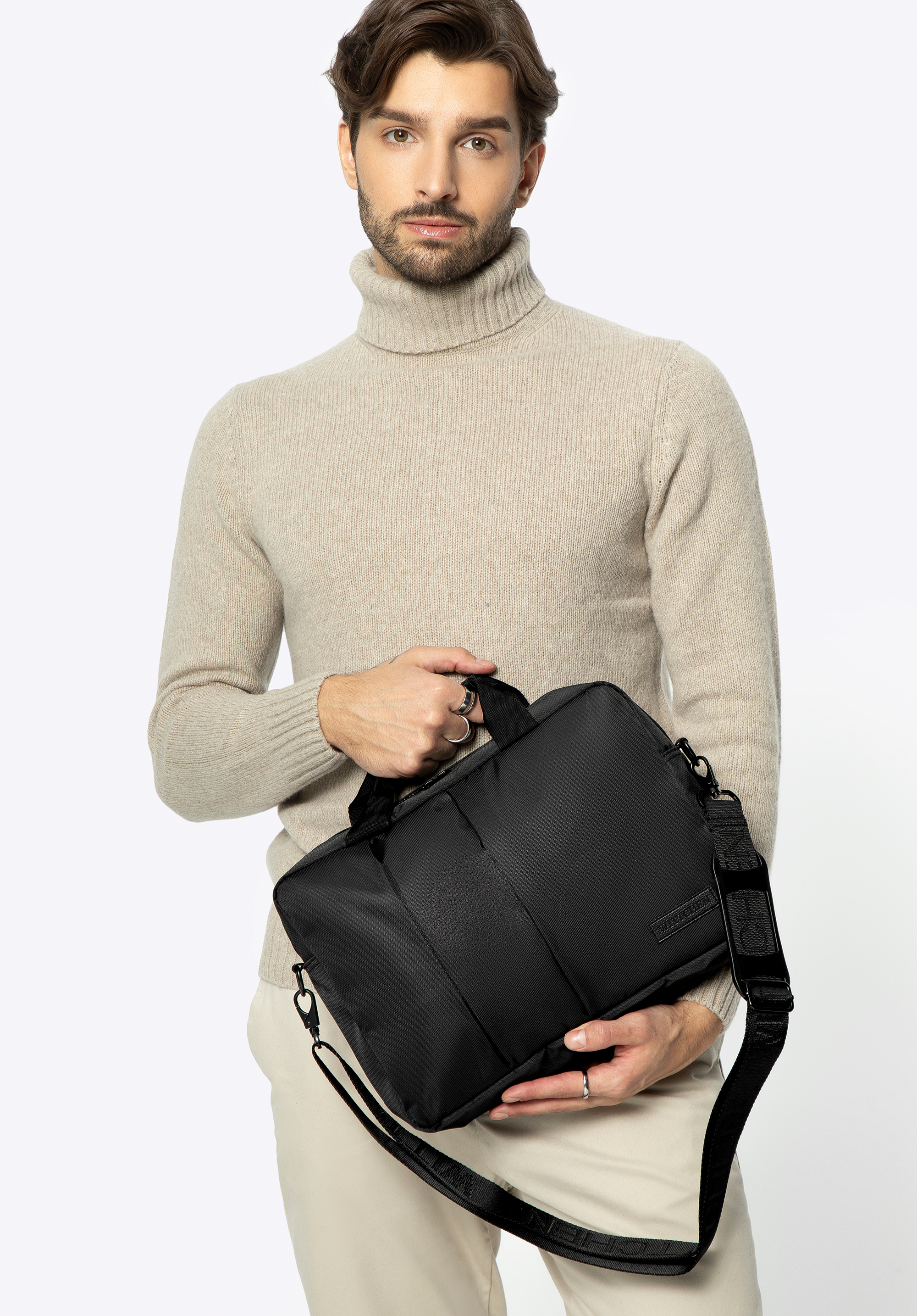 Poręczna torba na laptopa z kieszenią z przodu to dodatek, który doskonale wpasuje się w miejskie życie. Ma klasyczny kształt, dzięki któremu będzie pasowała do wielu stylizacji, począwszy od biznesowych, aż do mniej formalnych. W środku posiada pojemną komorę wyściełaną gąbką i przedzieloną na dwie części, a także trzy kieszenie. Ta torba na laptopa ma dwa miękkie uchwyty oraz odpinany pasek z logo. Na zewnątrz posiada funkcjonalną kieszeń zamykaną na suwak. Jako model unisex spodoba się zarówno kobiecie, jak i mężczyźnie.