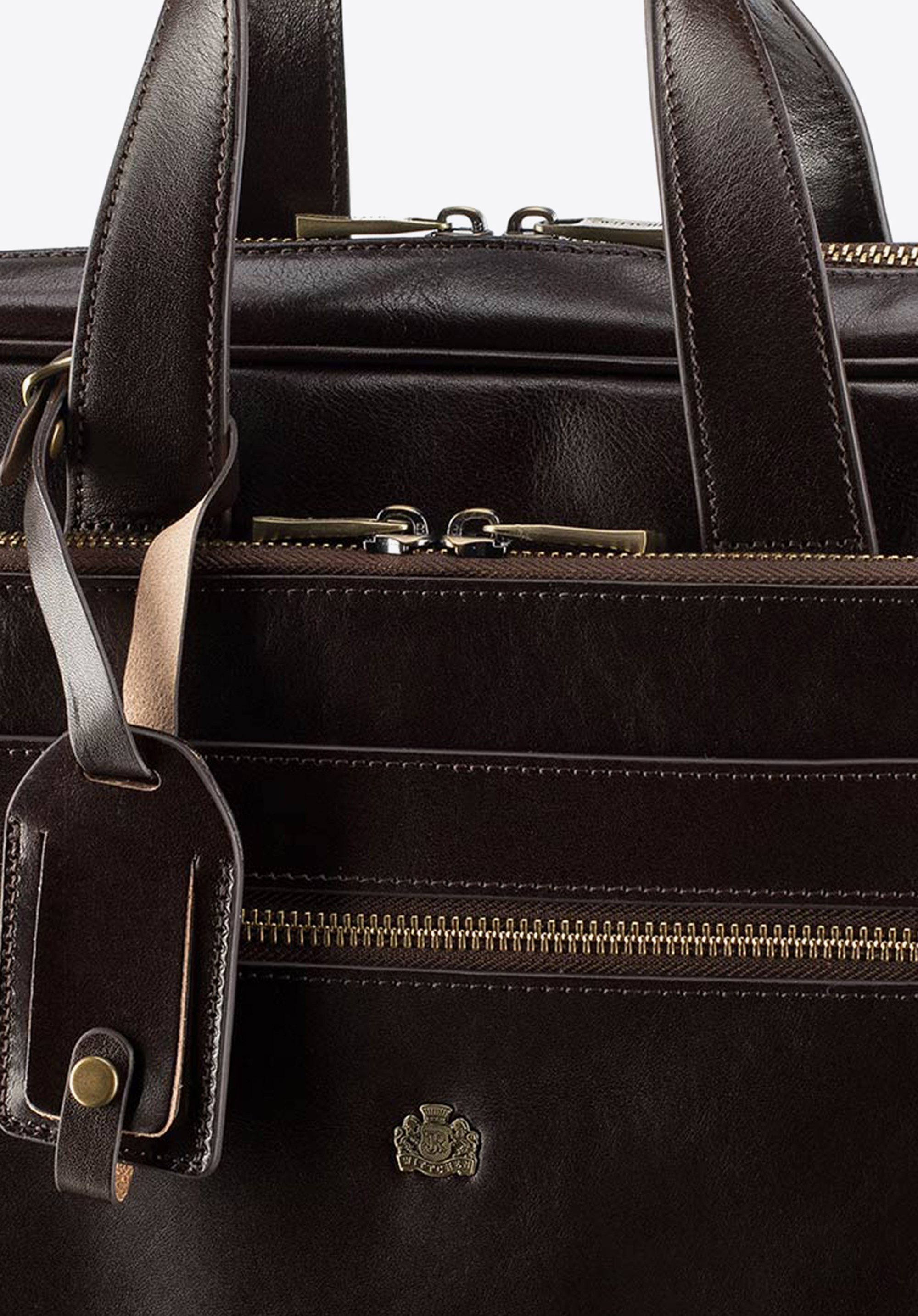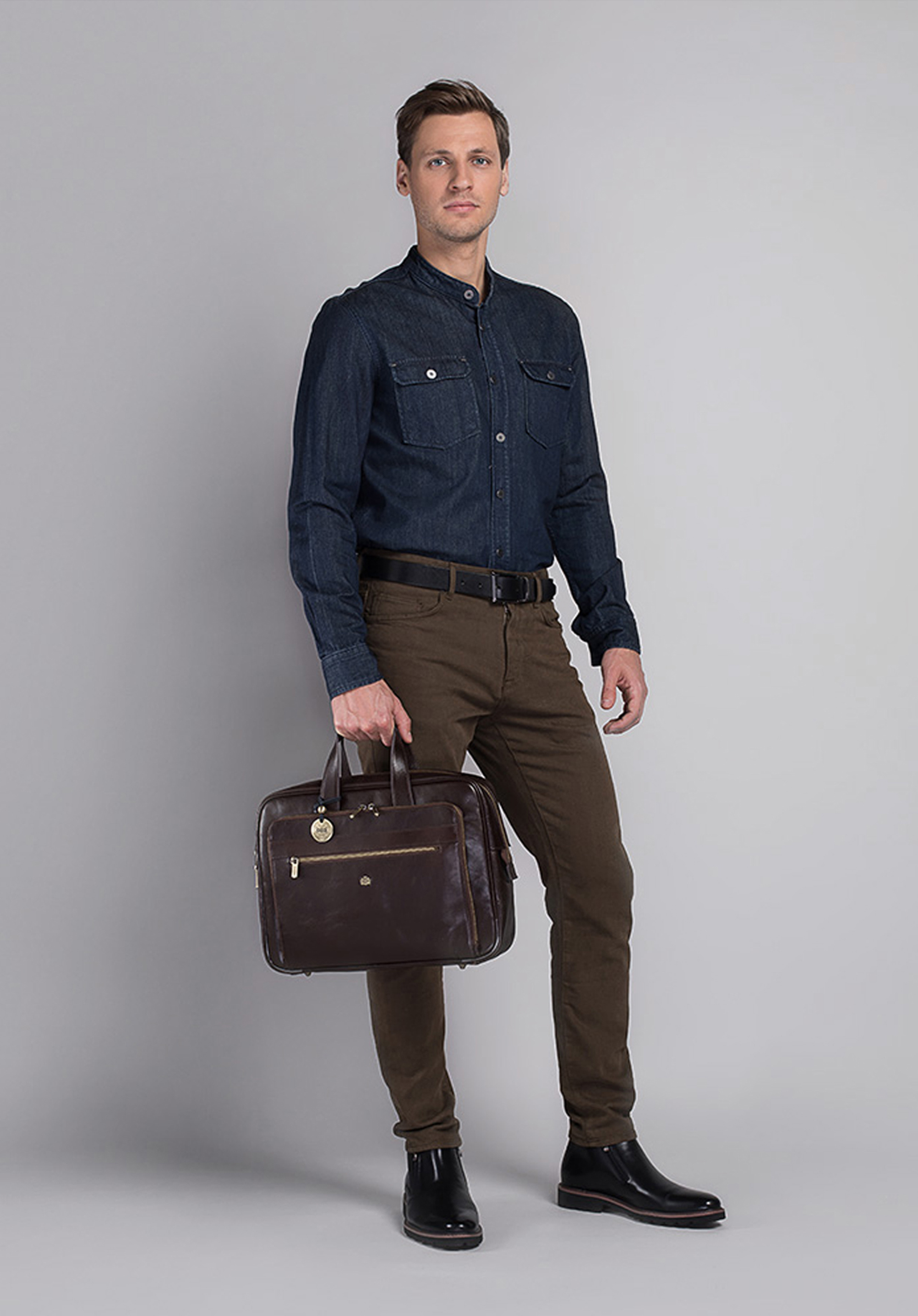 Szykowna torba, doskonała zarówno dla kobiet, jak i mężczyzn. Klasyczny fason, skóra naturalna z widocznym jarzmowaniem oraz okucia w kolorze stergo złota składają się na ponadczasowy charakter z nutą retro. Do torby dołączony jest bardzo przydatny identyfikator.