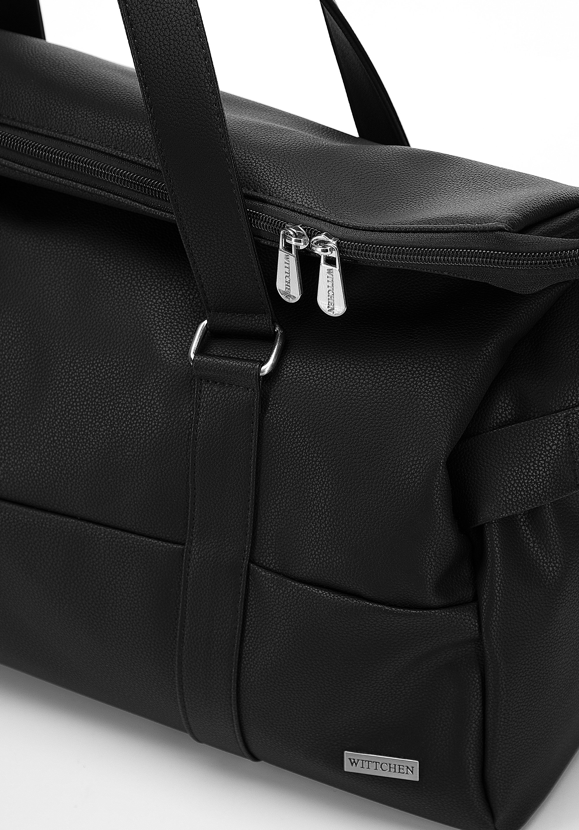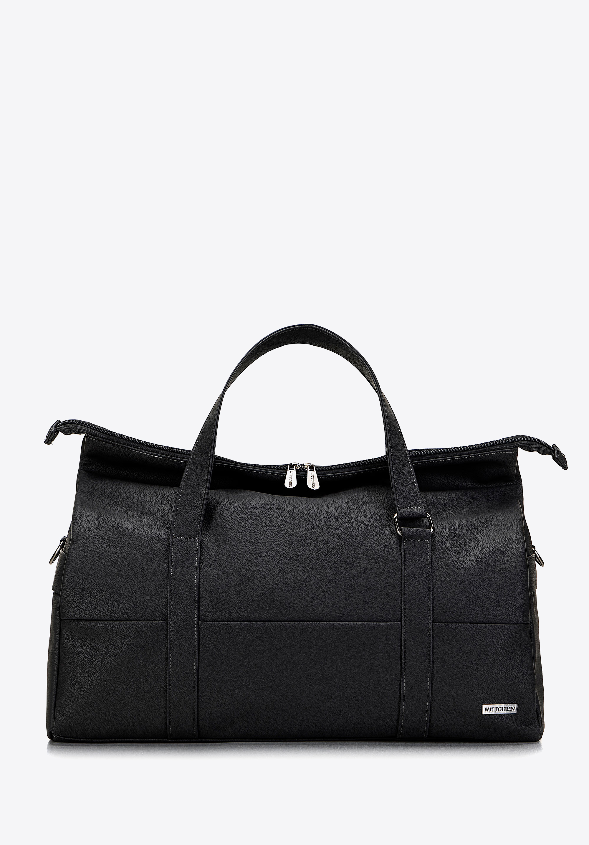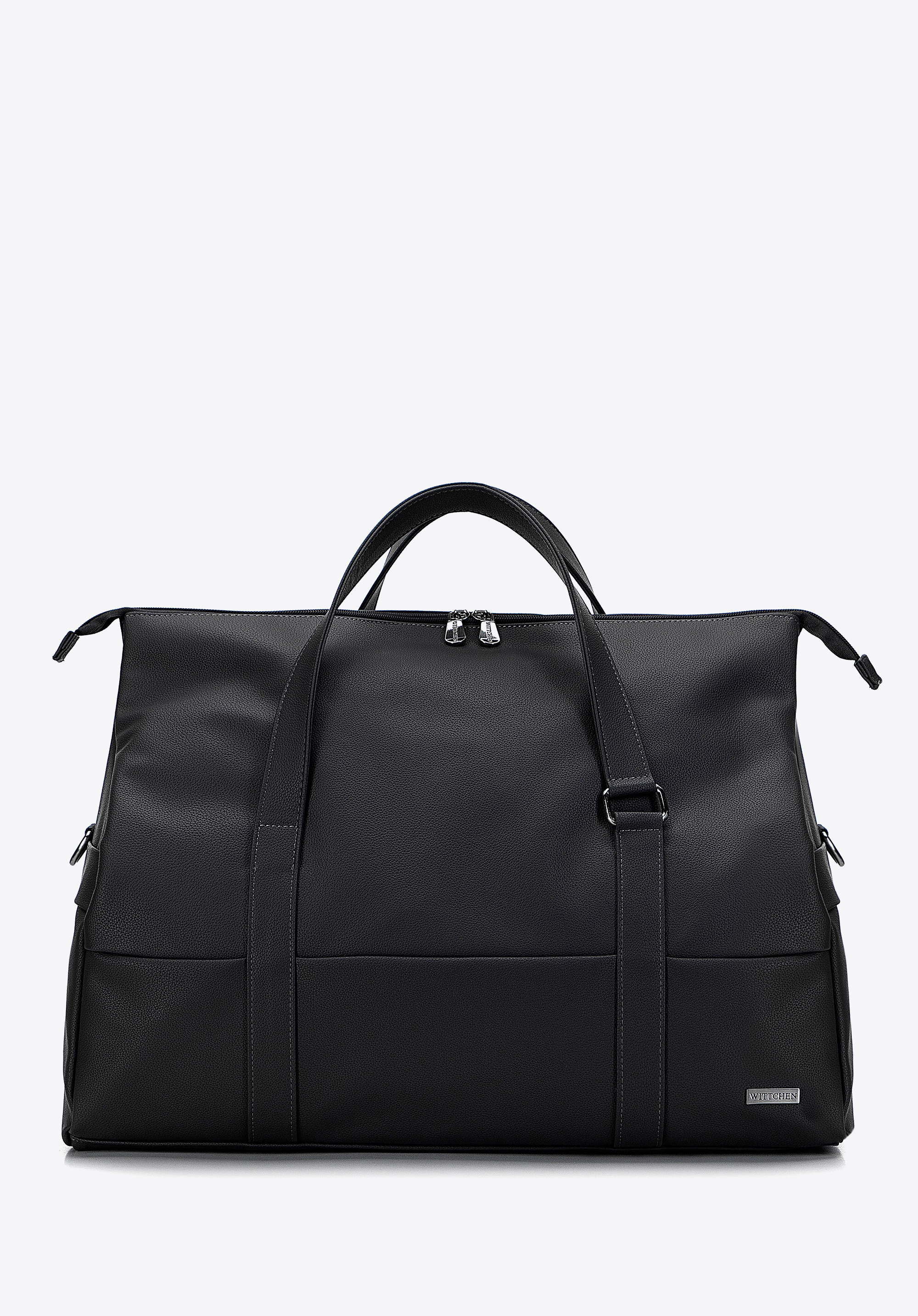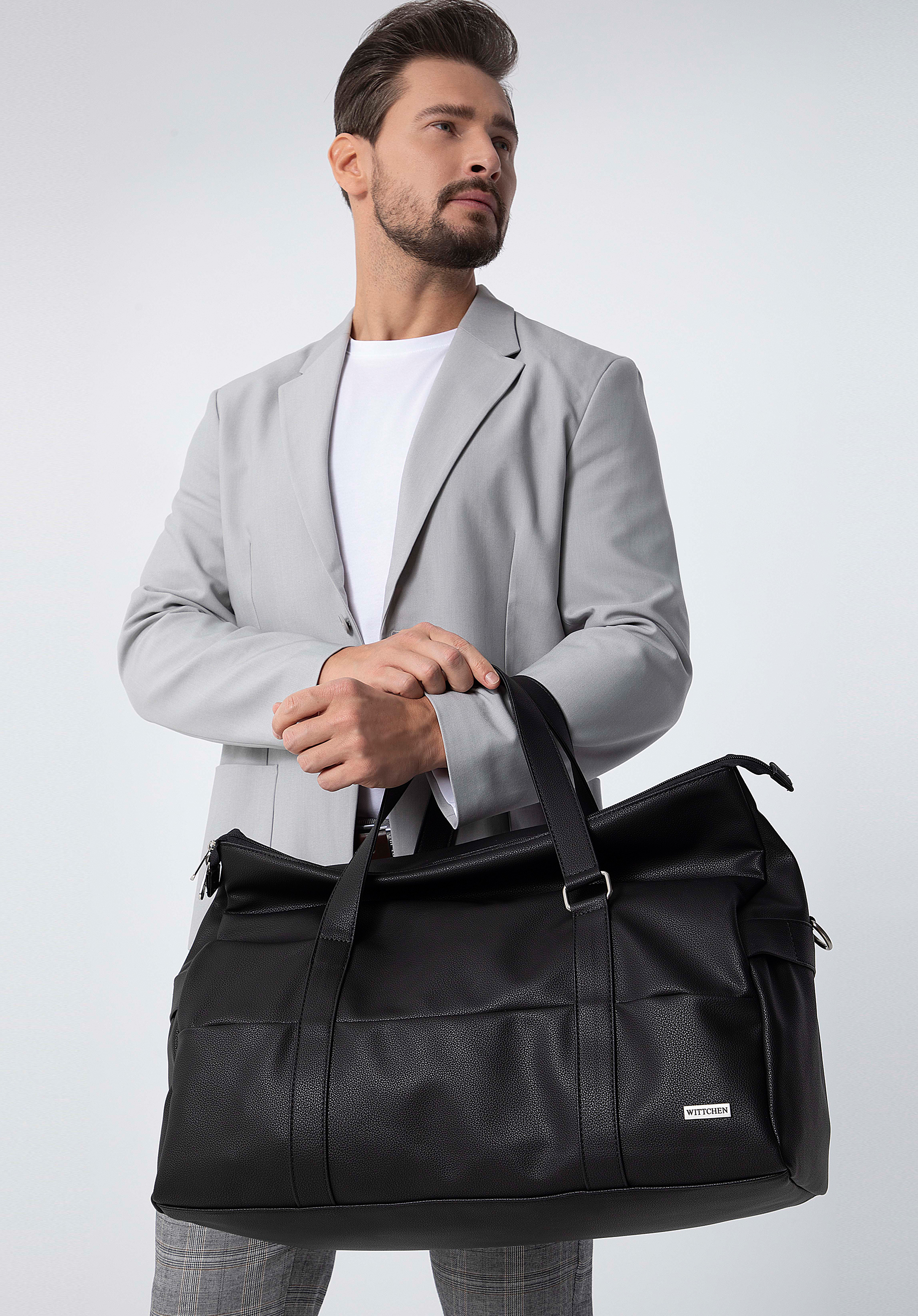 zgrabny trapezowy kształt, a w środku dużej komory znajdują się trzy kieszonki, które pomogą Ci w utrzymaniu porządku. Możesz ją nosić klasycznie – do ręki lub przewiesić przez ramię na dołączonym pasku. Nowoczesna torba podróżna z ekoskóry to ponadczasowy dodatek, który przyda się w Twojej szafie.