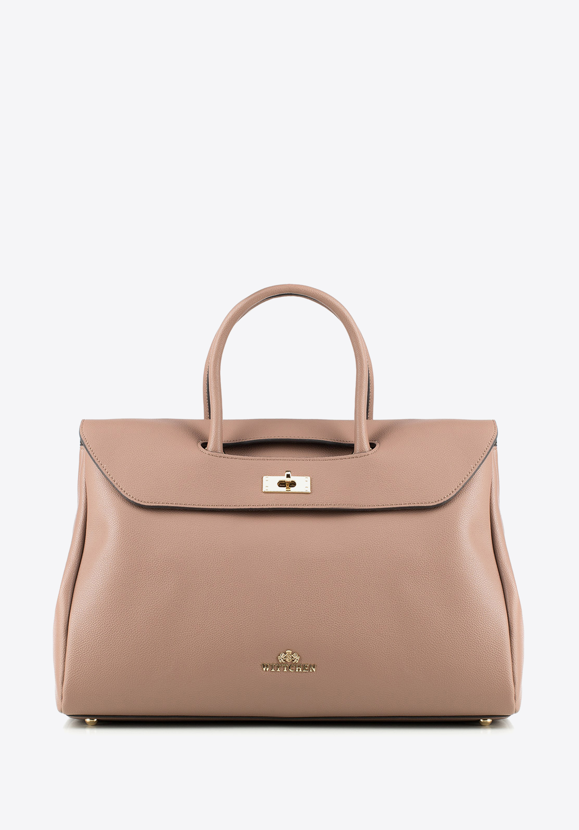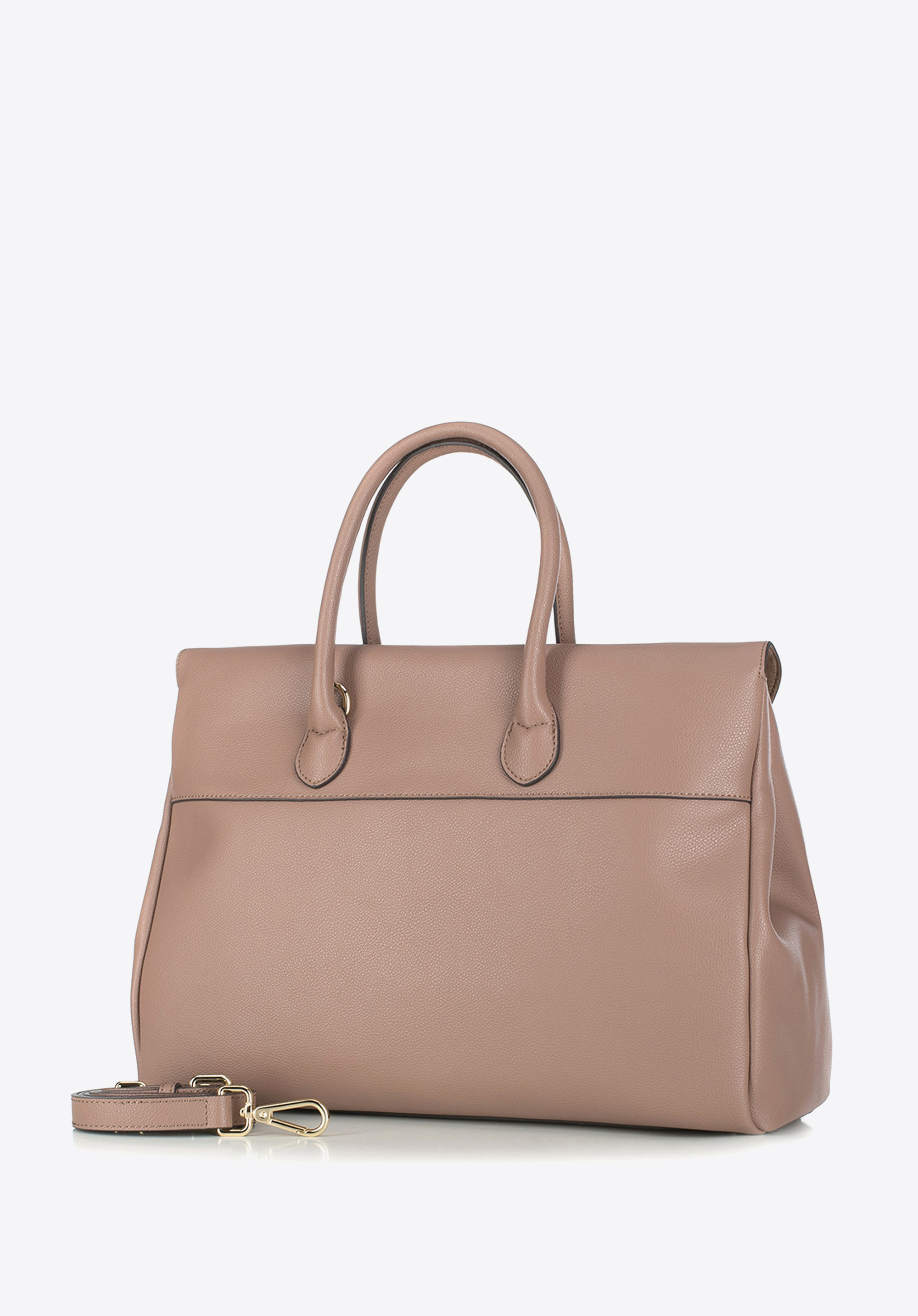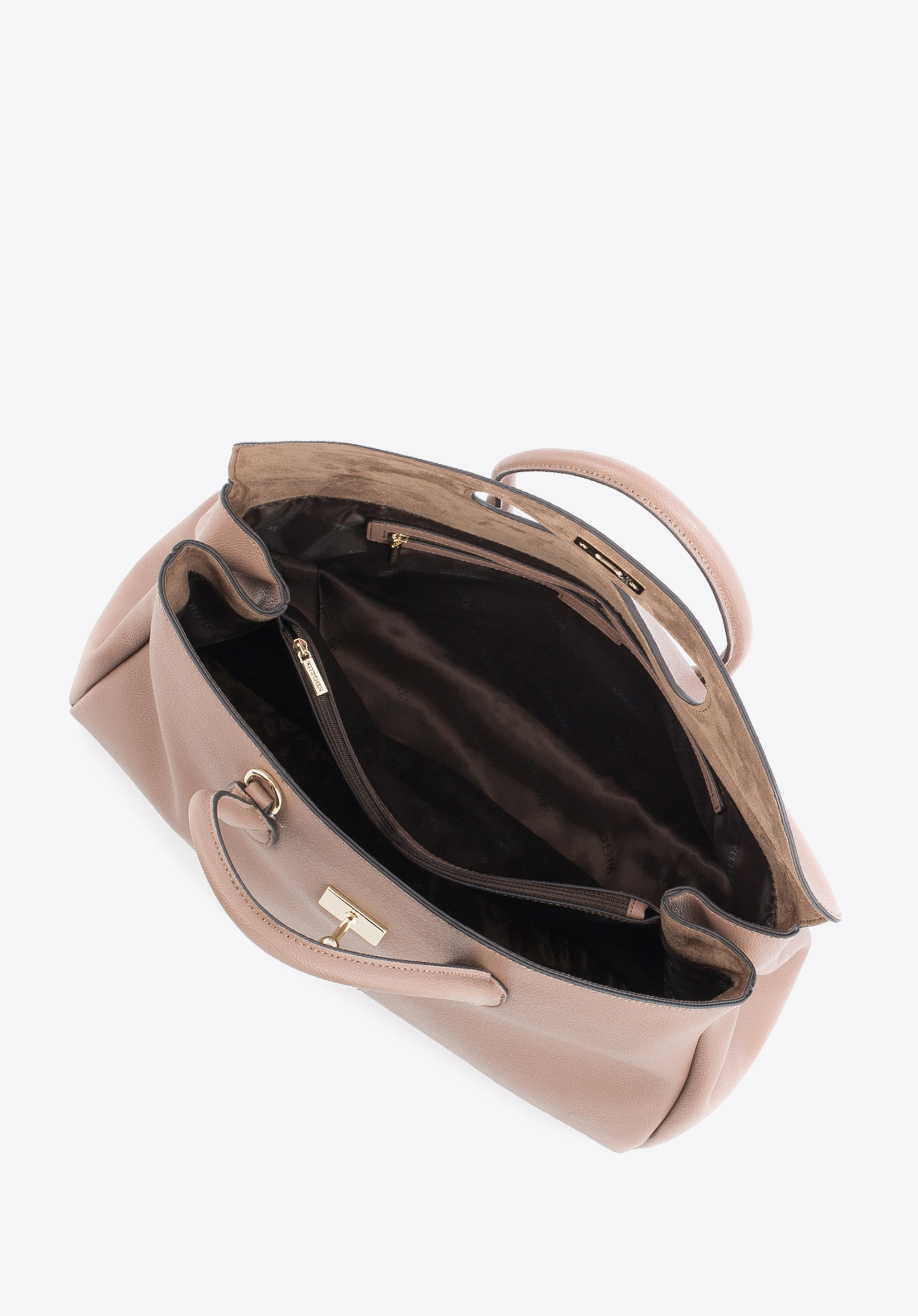 zaokrąglone uchwyty lub na ramię dzięki dopinanemu paskowi. Model, mimo że wykonany z miękkiego materiału trzyma fason. Modna kolorystyka modelu współgra z delikatnie groszkowaną fakturą i złotymi okuciami, tworząc szykowną, a zarazem kobiecą całość.