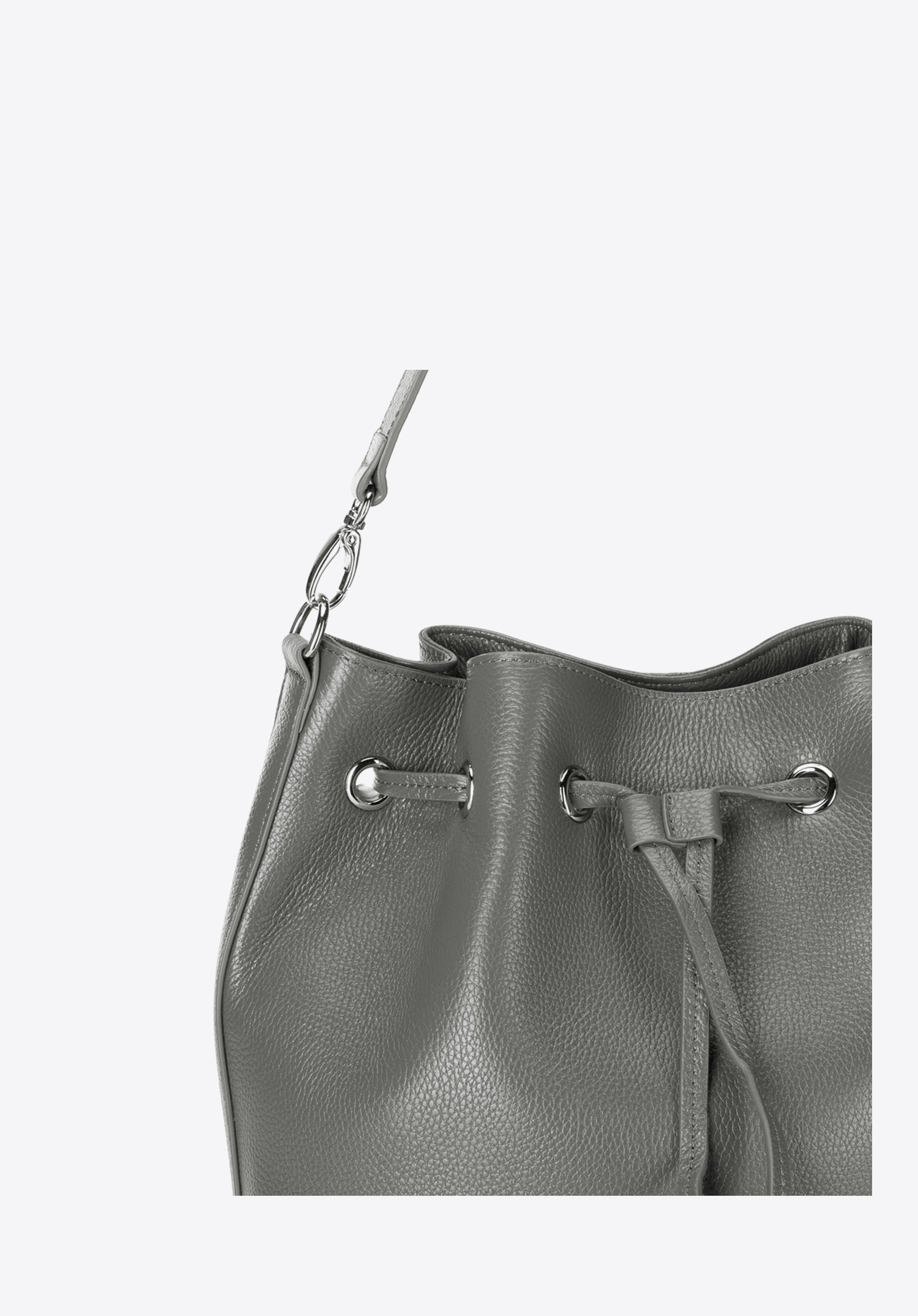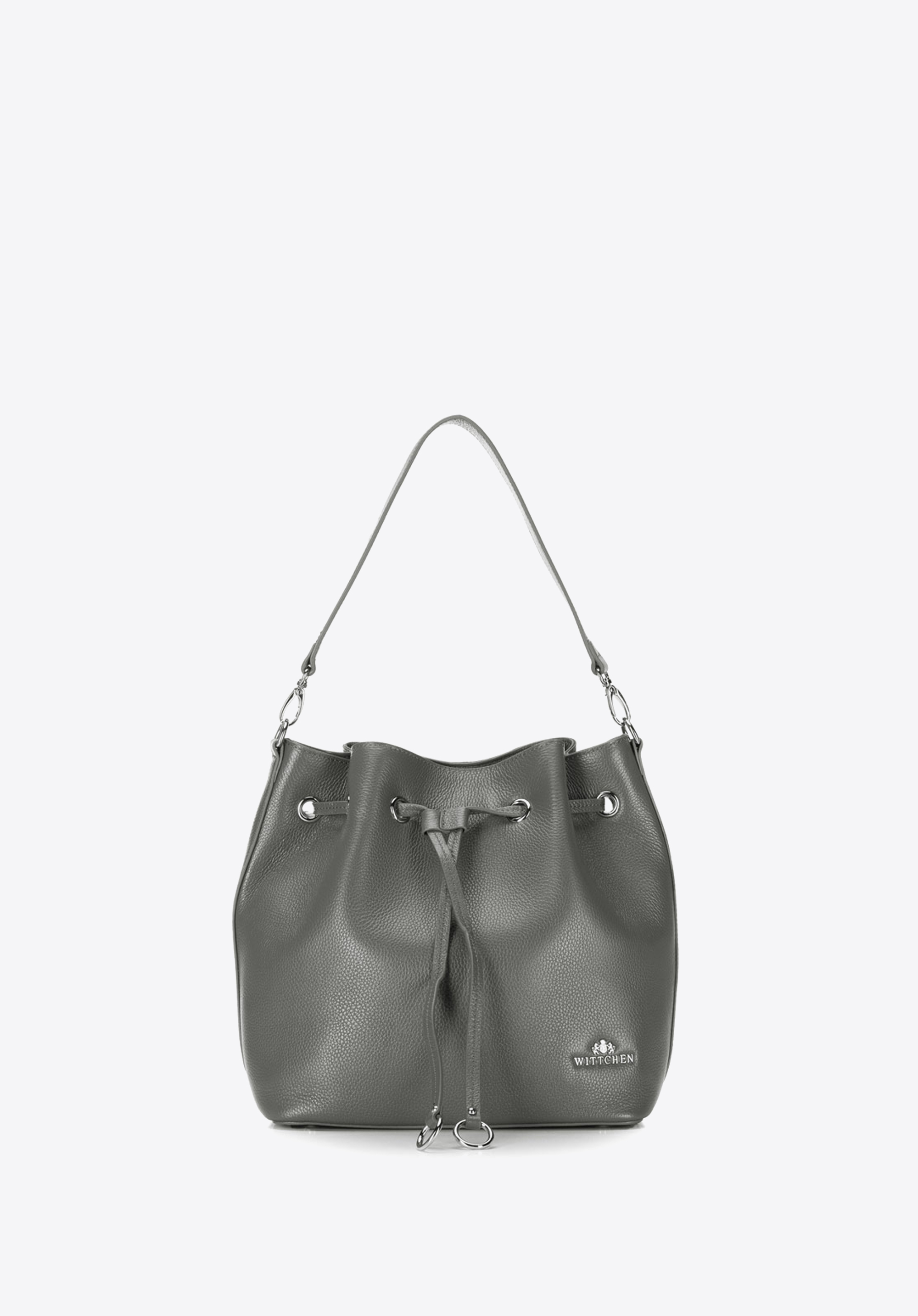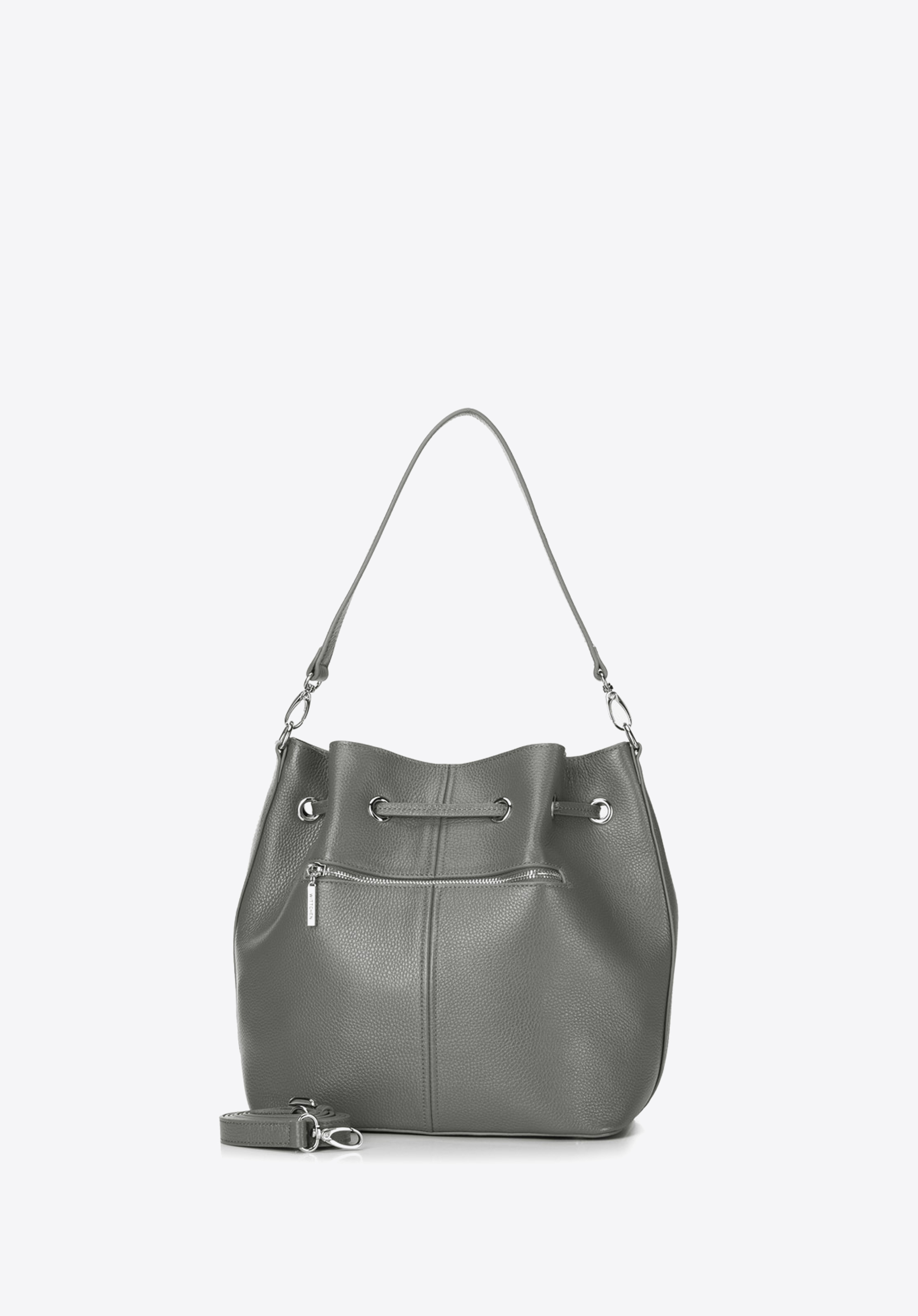 Skórzana torebka damska, przyozdobiona srebrnymi elementami. Charakterystycznym elementem tego produktu jest ściągacz, umożliwiający zmianę kształtu na torebkę typu worek. Co więcej torebka posiada również regulowany pasek na ramię oraz dobrze rozplanowane wnętrze. W ofercie dostępne są 3 odcienie: szary, jasnobrązowy oraz czarny.