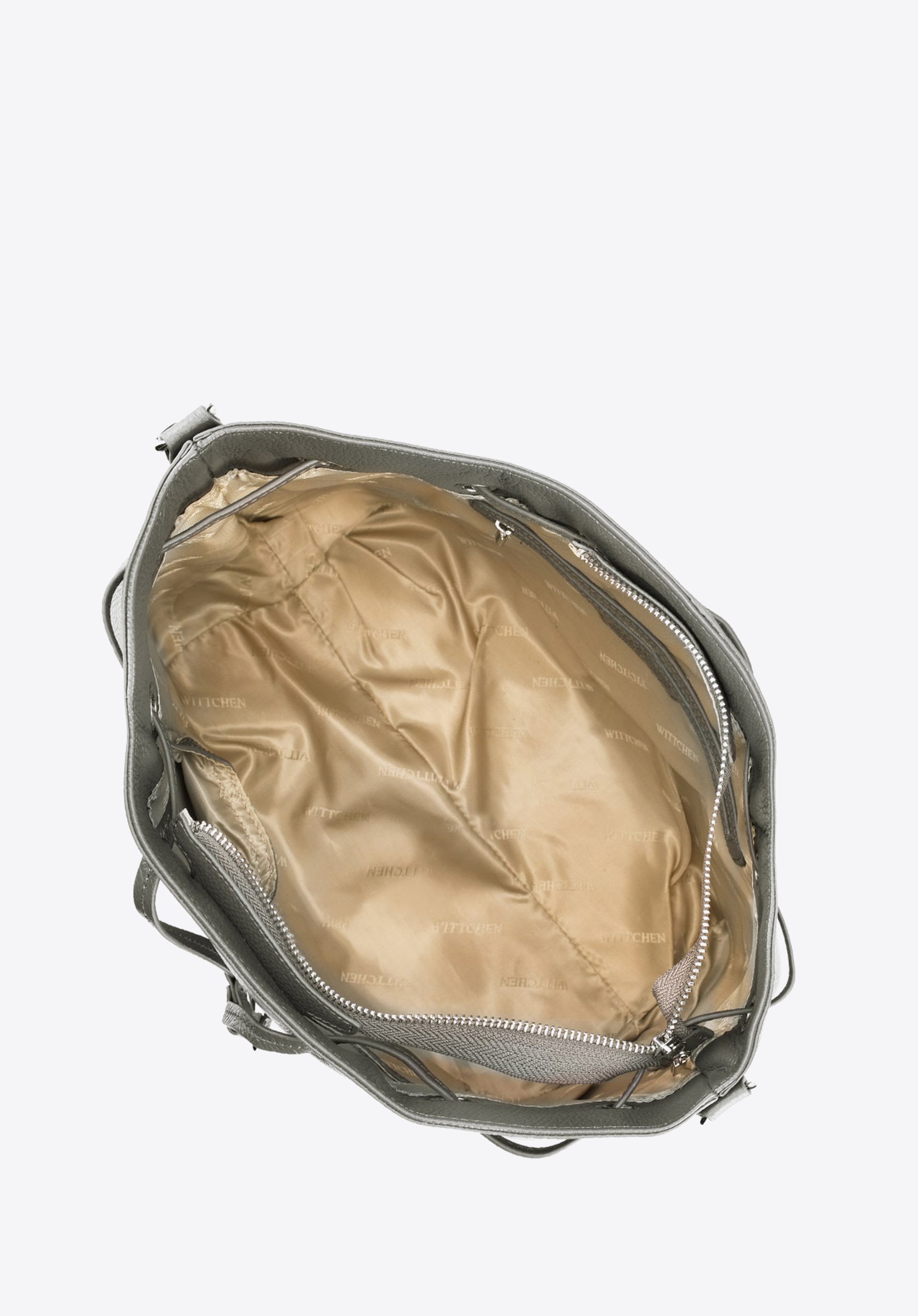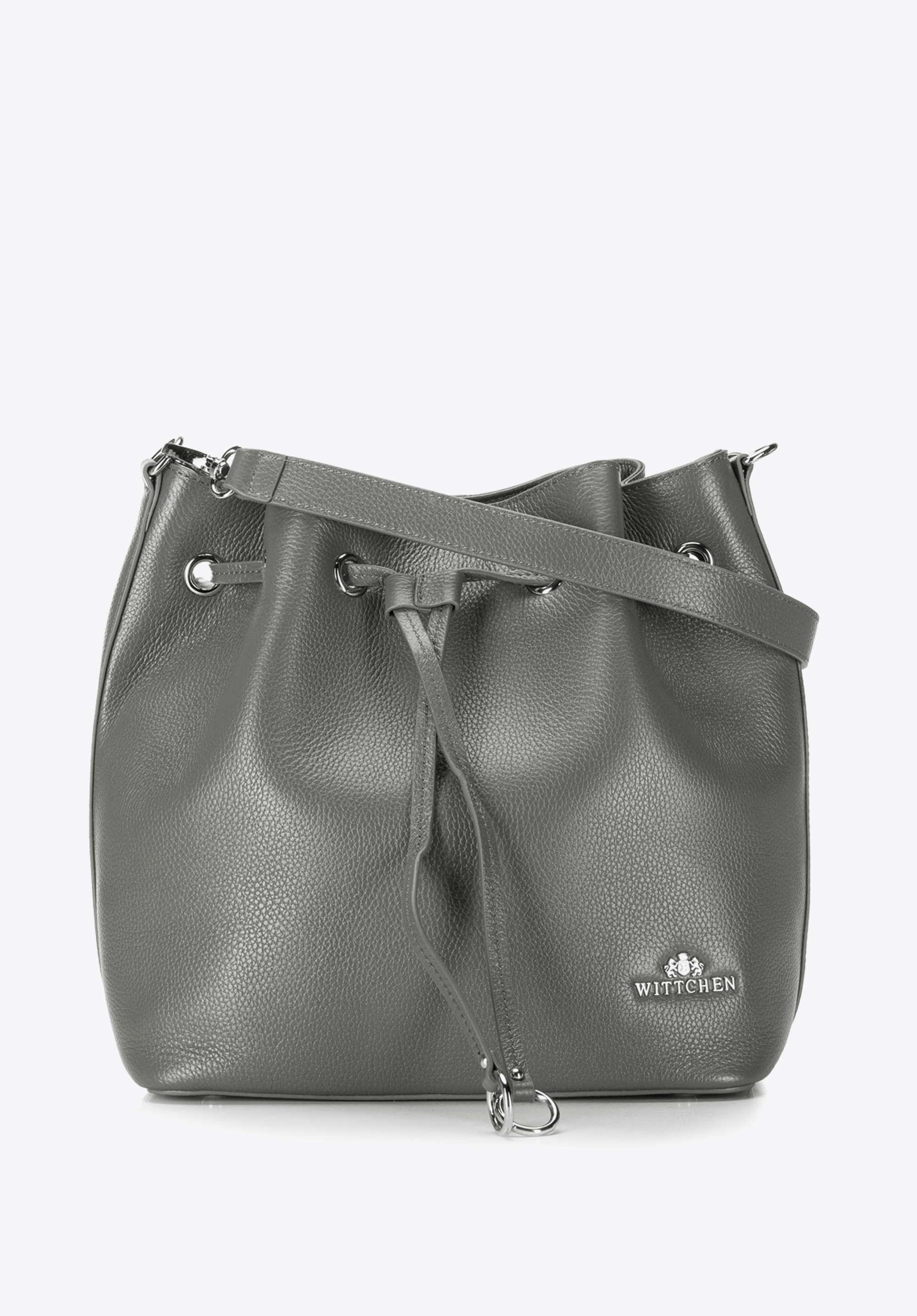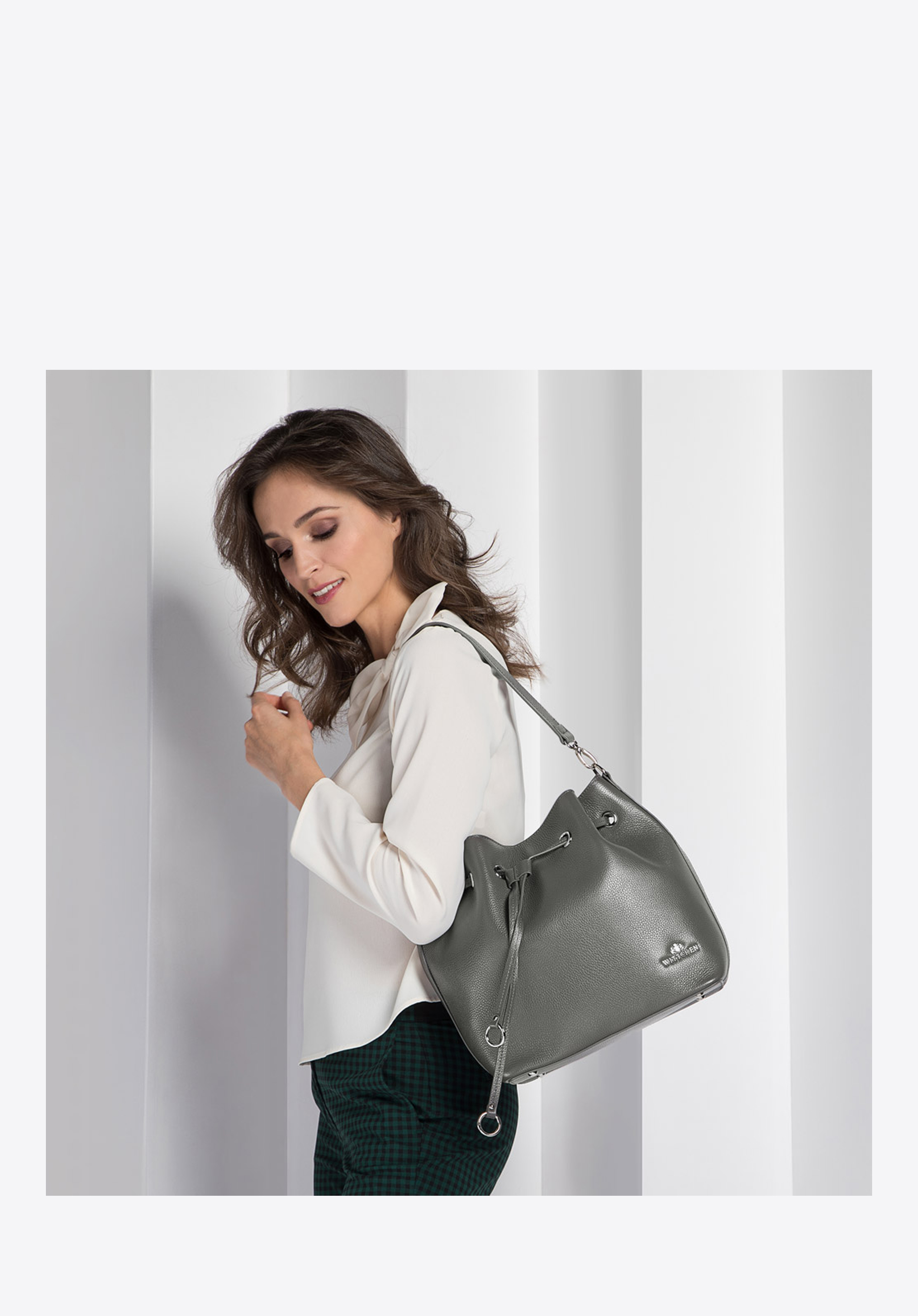 Skórzana torebka damska, przyozdobiona srebrnymi elementami. Charakterystycznym elementem tego produktu jest ściągacz, umożliwiający zmianę kształtu na torebkę typu worek. Co więcej torebka posiada również regulowany pasek na ramię oraz dobrze rozplanowane wnętrze. W ofercie dostępne są 3 odcienie: szary, jasnobrązowy oraz czarny.