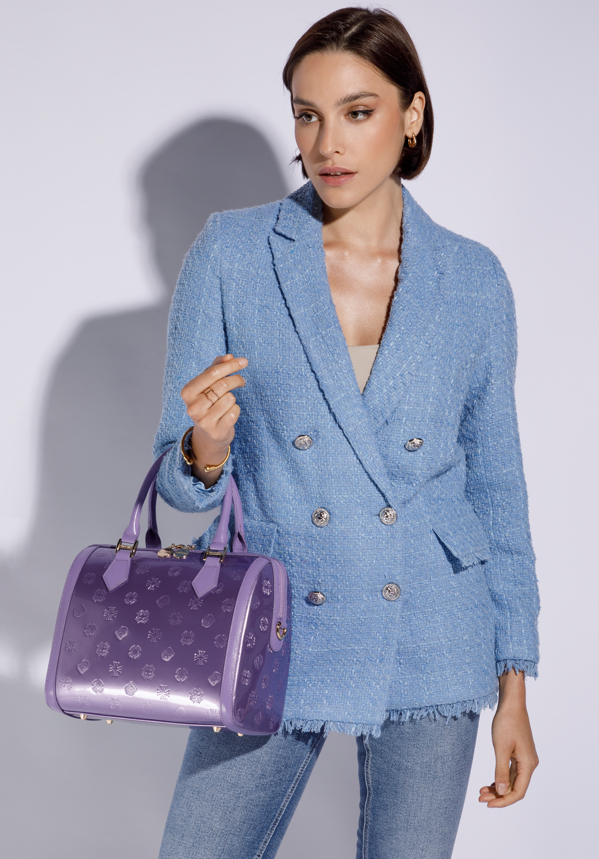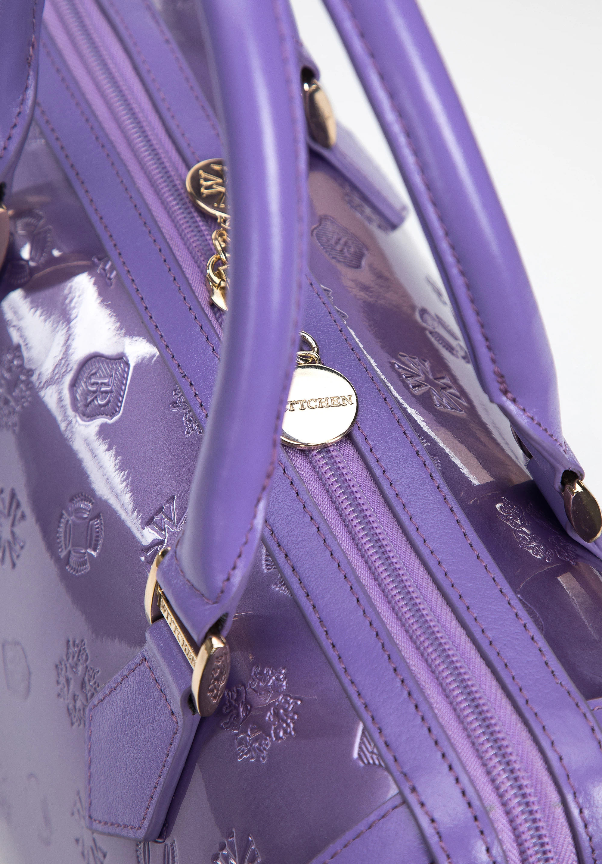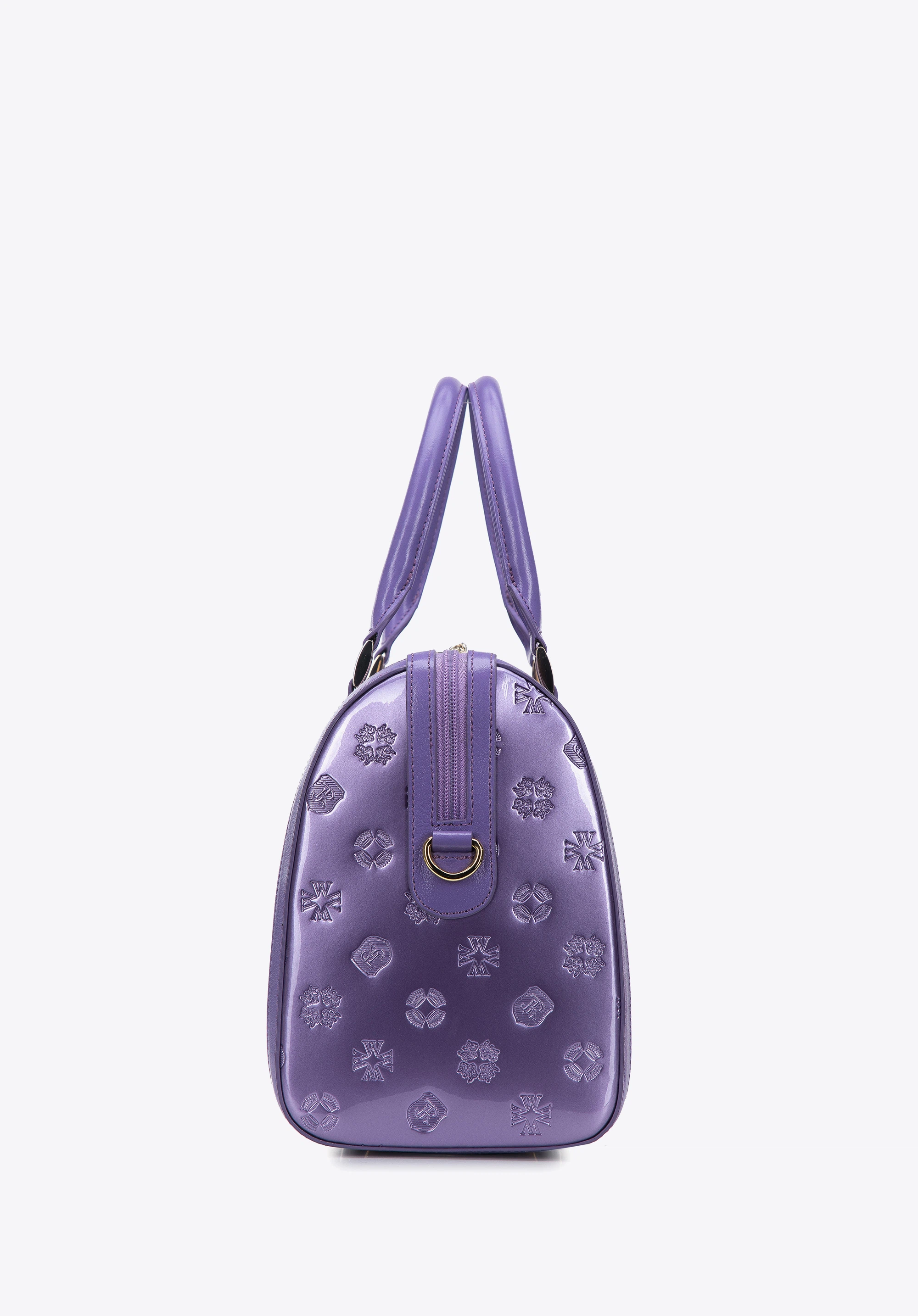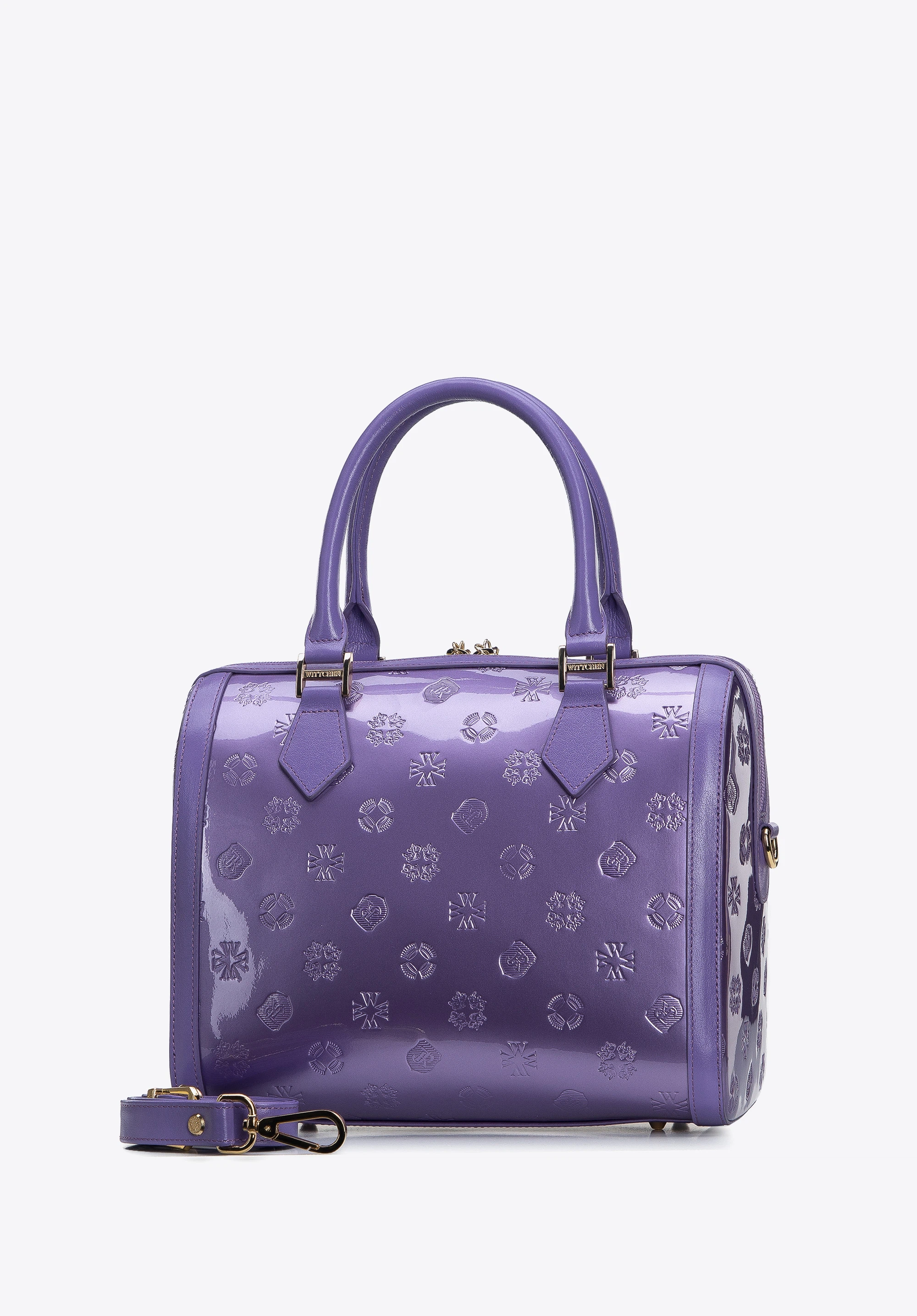 z wysokiej jakości skóry naturalnej: lakierowanej z wytłoczonym monogramem z przodu i z tyłu oraz połyskującej na bokach i rączkach. Dzięki