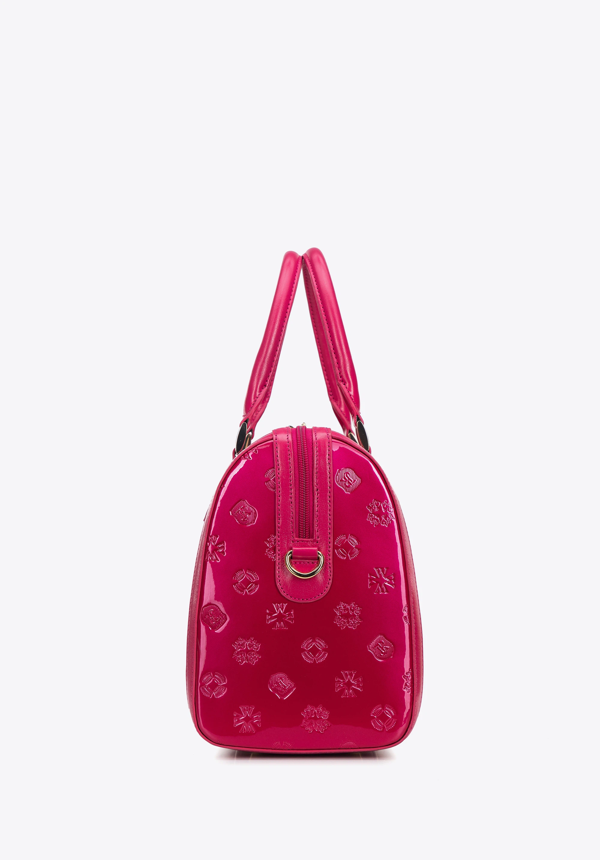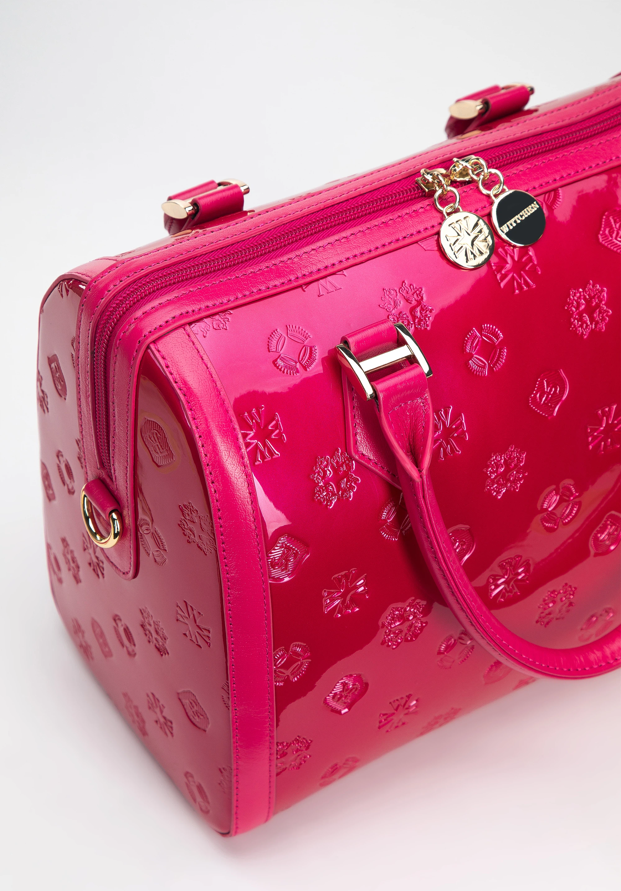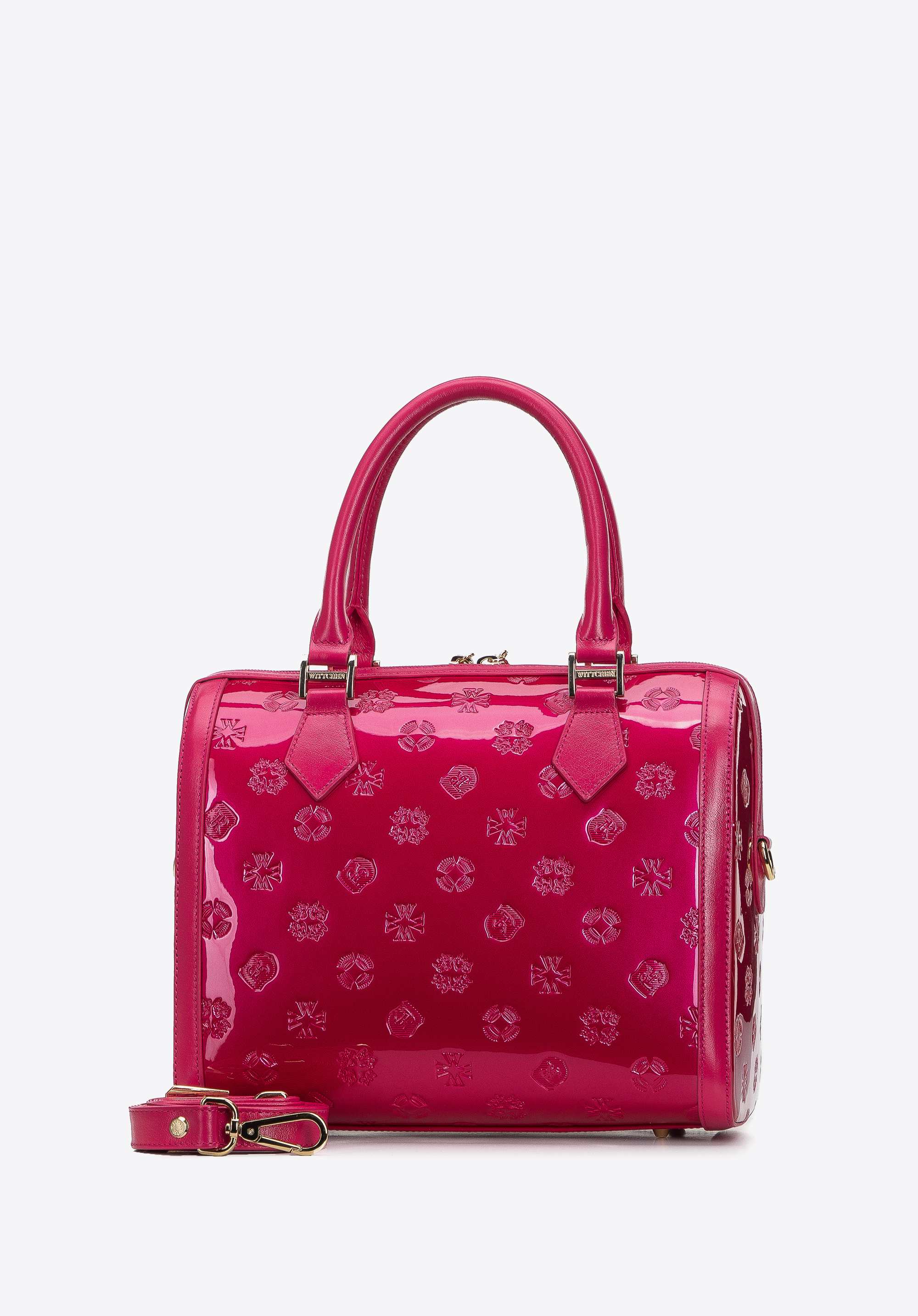 z wysokiej jakości skóry naturalnej: lakierowanej z wytłoczonym monogramem z przodu i z tyłu oraz połyskującej na bokach i rączkach. Dzięki