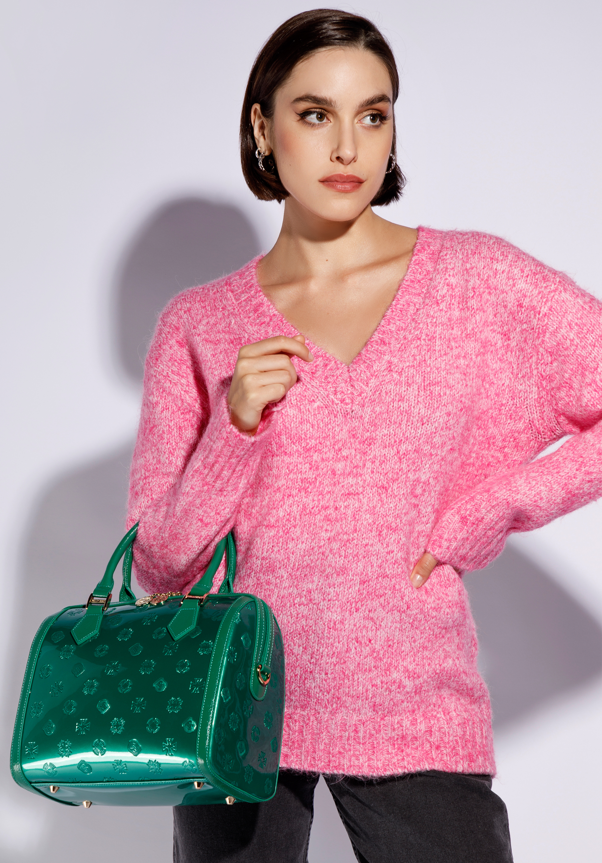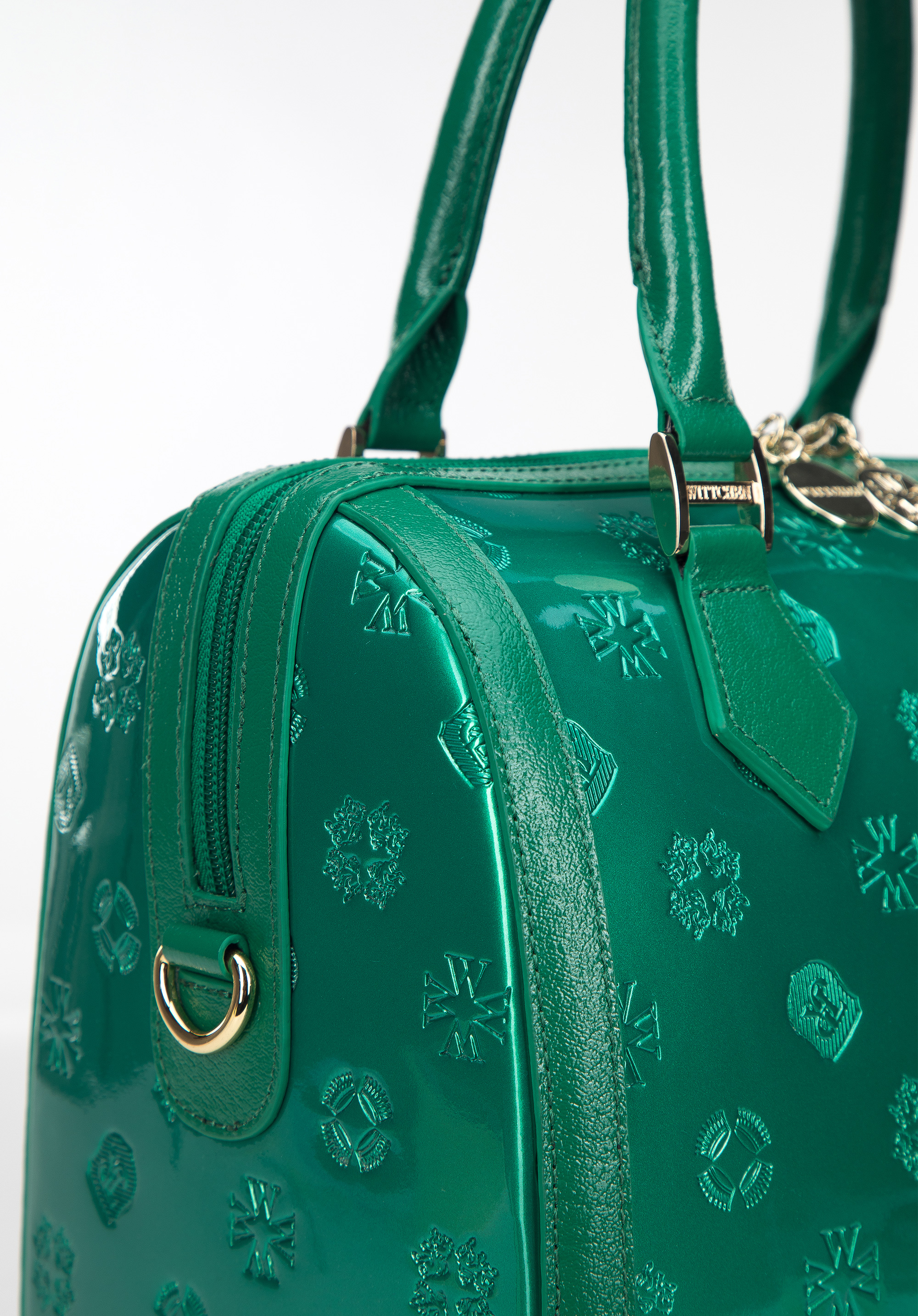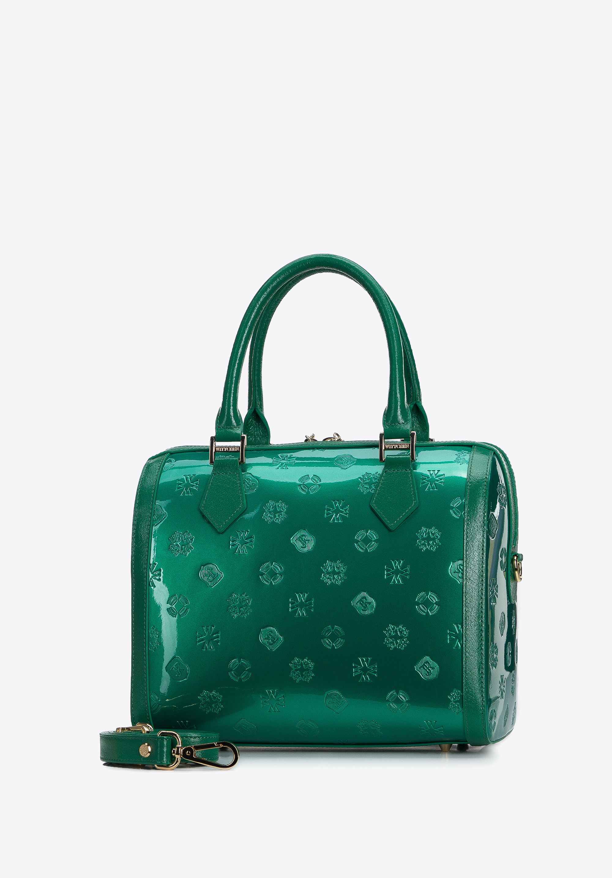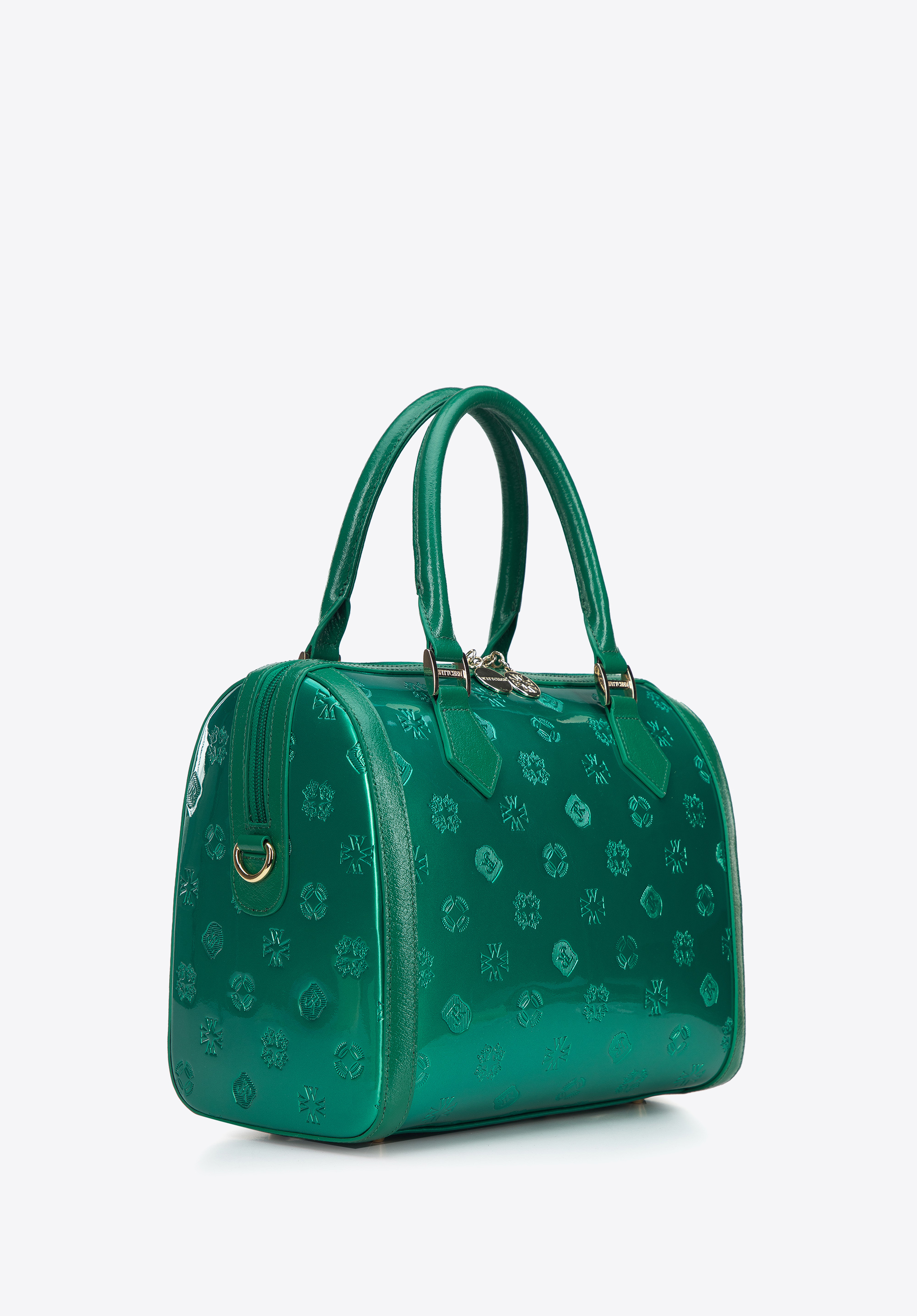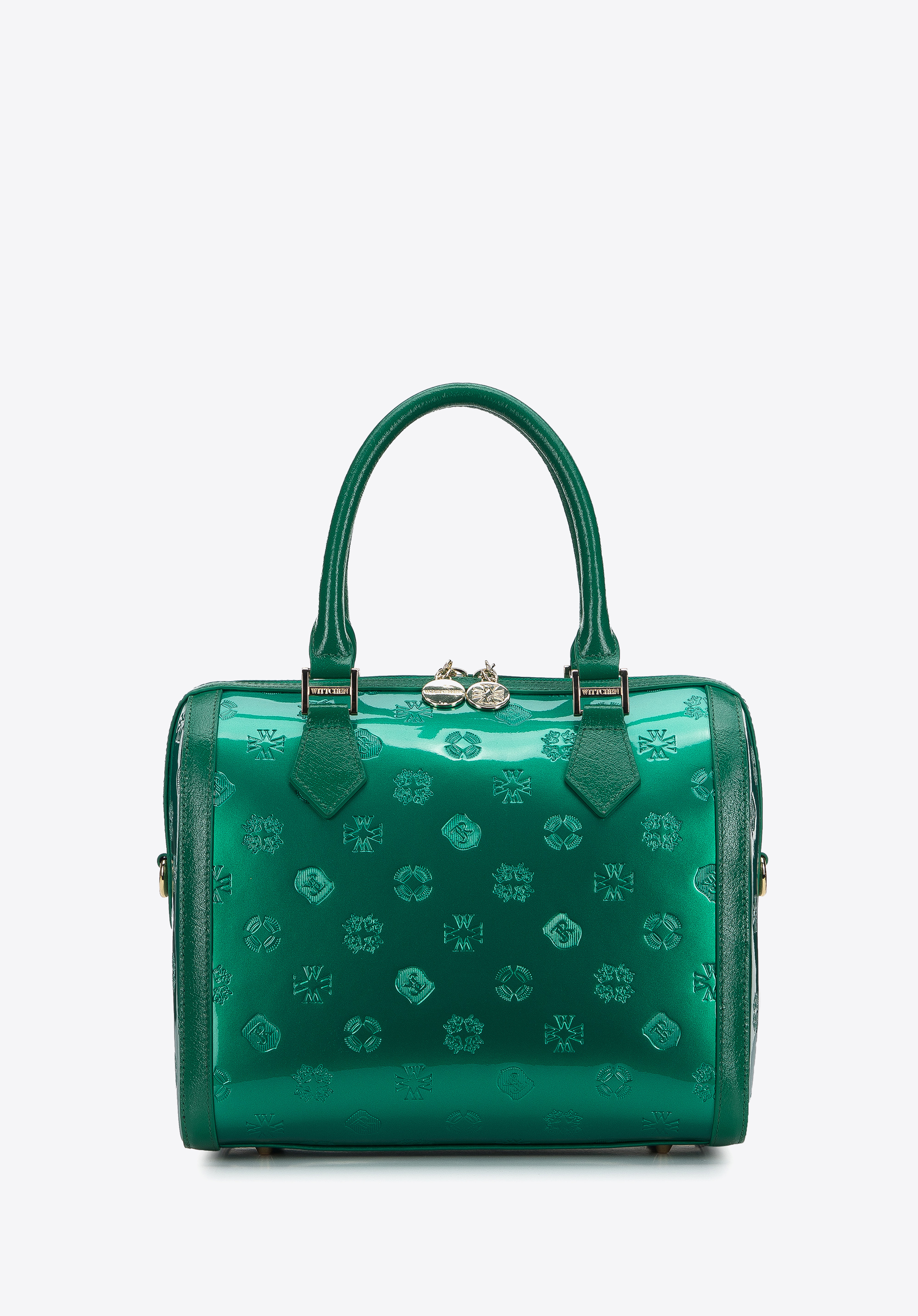 z wysokiej jakości skóry naturalnej: lakierowanej z wytłoczonym monogramem z przodu i z tyłu oraz połyskującej na bokach i rączkach. Dzięki