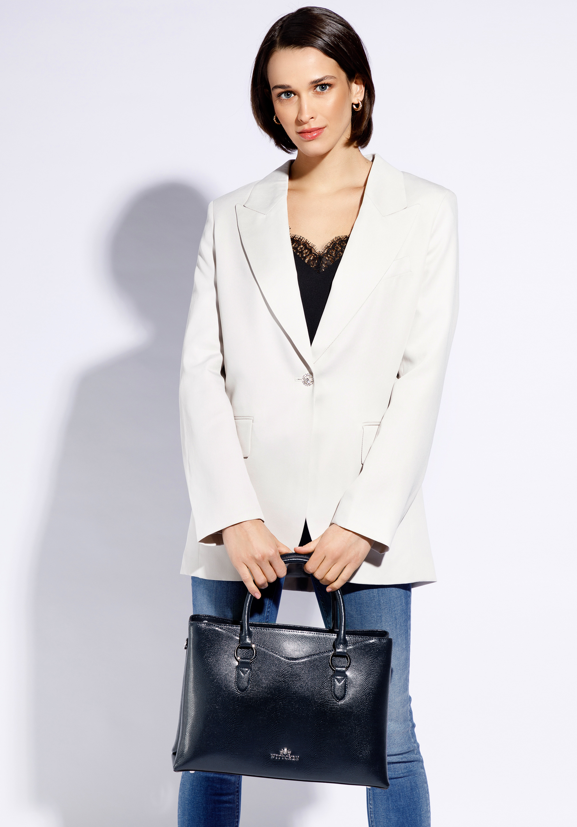 dwóm komorom łatwo zachowasz w niej porządek. W środku zmieścisz portfel, telefon, kalendarz, małą butelkę wody, zapasowy szal i kilka drobiazgów. Ten model dopełni kobiecy garnitur i doda szyku stylizacji z dżinsami i oversizowym swetrem.