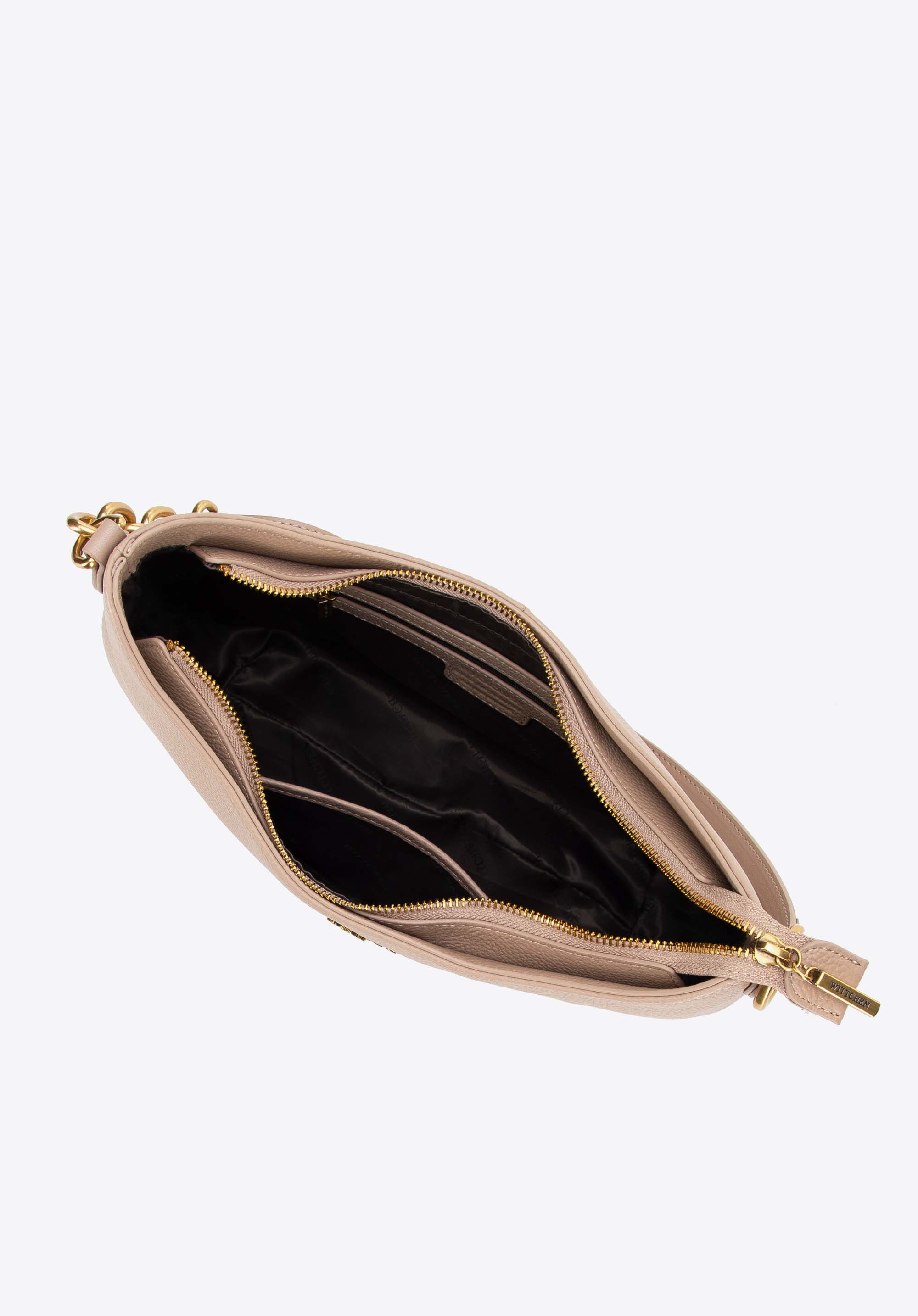 - Przemyślana organizacja: Wewnątrz torebki znajdują się dwie kieszenie – jedna zamykana na zamek i jedna otwarta, co ułatwia organizację akcesoriów, kluczy czy portfela.