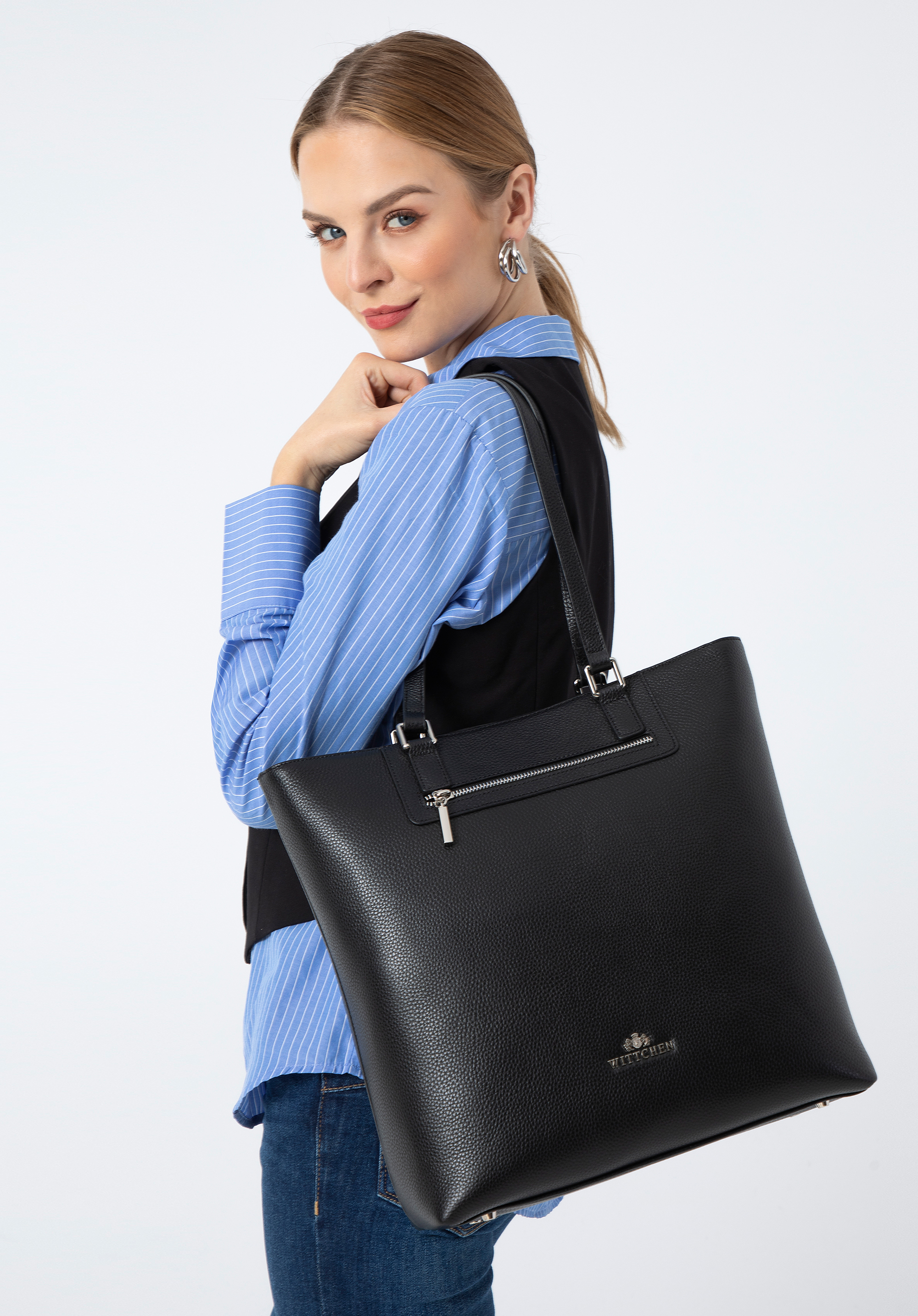 duża i pakowna, w sam raz do pracy, na uczelnię lub małe zakupy. W środku zmieścisz dokumenty w formacie A4, kosmetyczkę, kalendarz, butelkę wody i kilka drobiazgów.