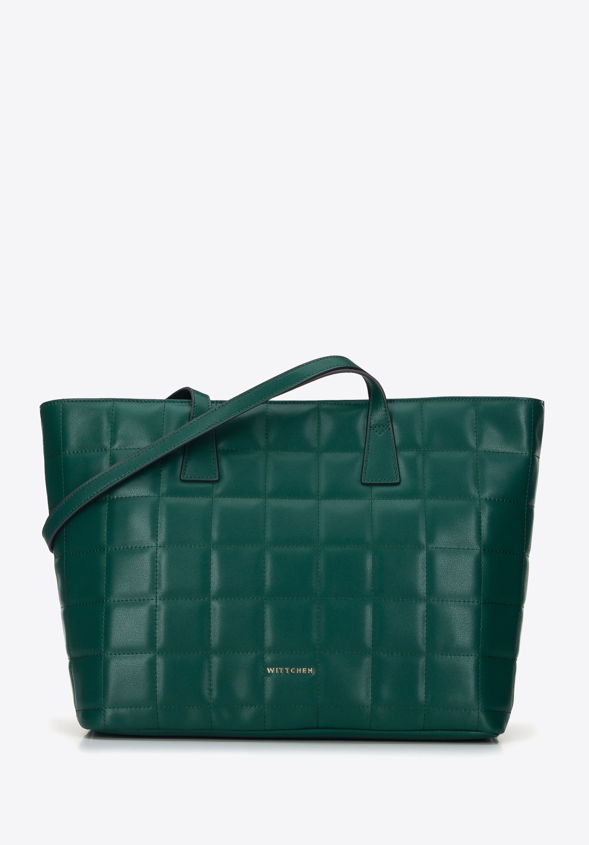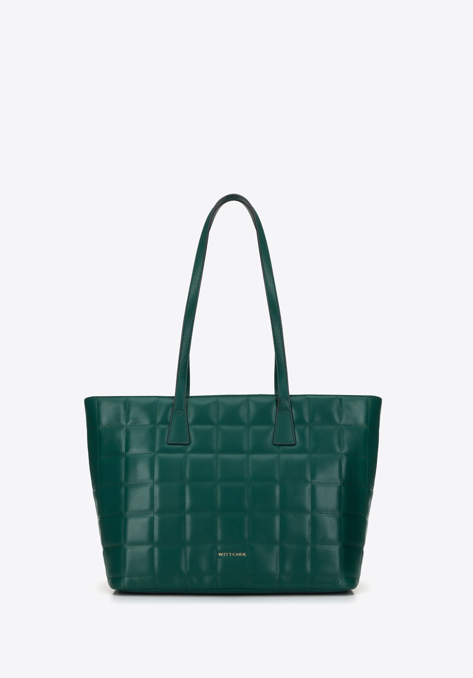 z wysokiej jakości skóry naturalnej, pikowanej w duże kwadraty. Całość zdobi nowe logo WITTCHEN złożone z samych liter. Wewnątrz jest