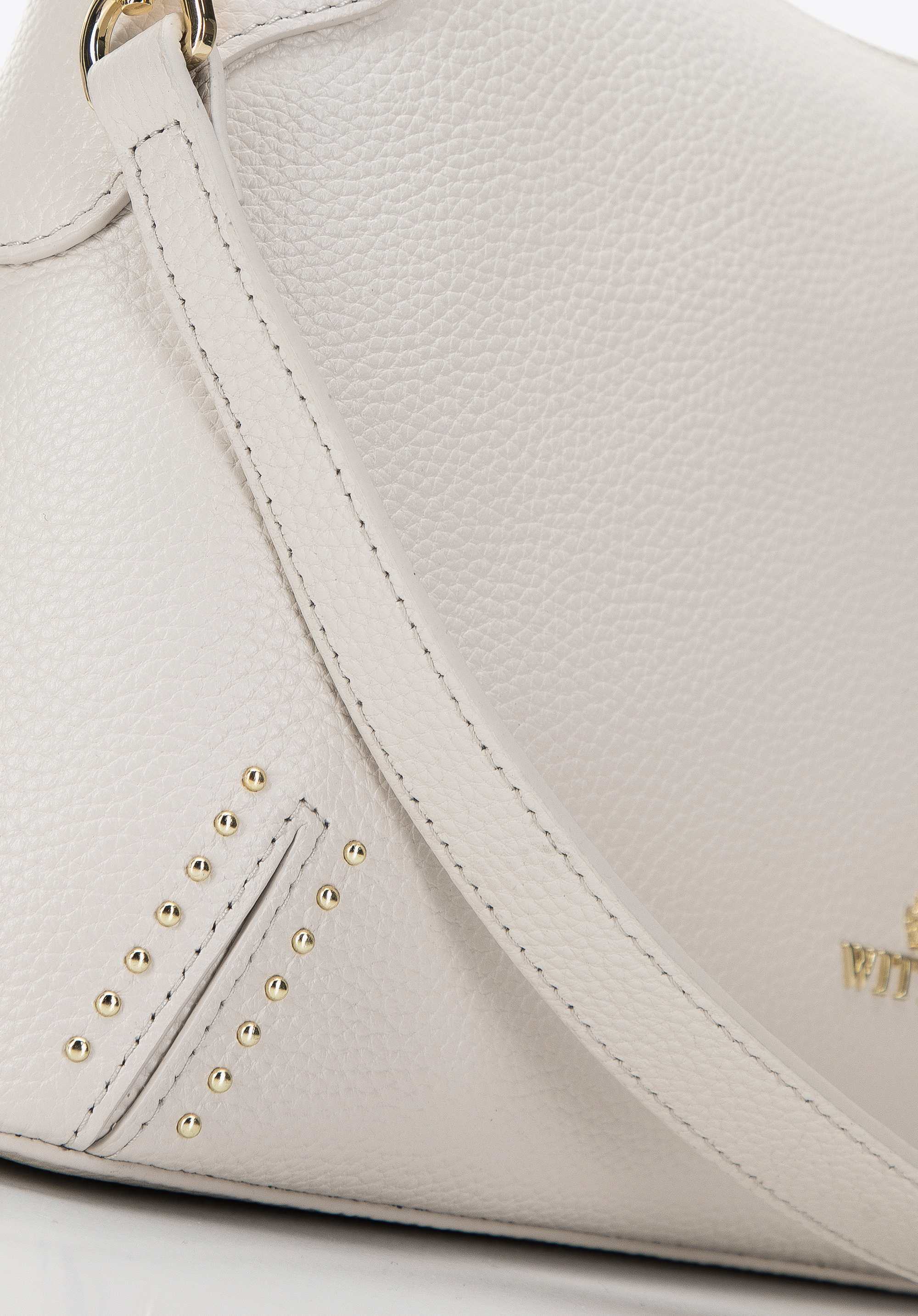 Klasyczny fason urozmaicają drobne nity oraz patki przy połyskujących okuciach. Ma