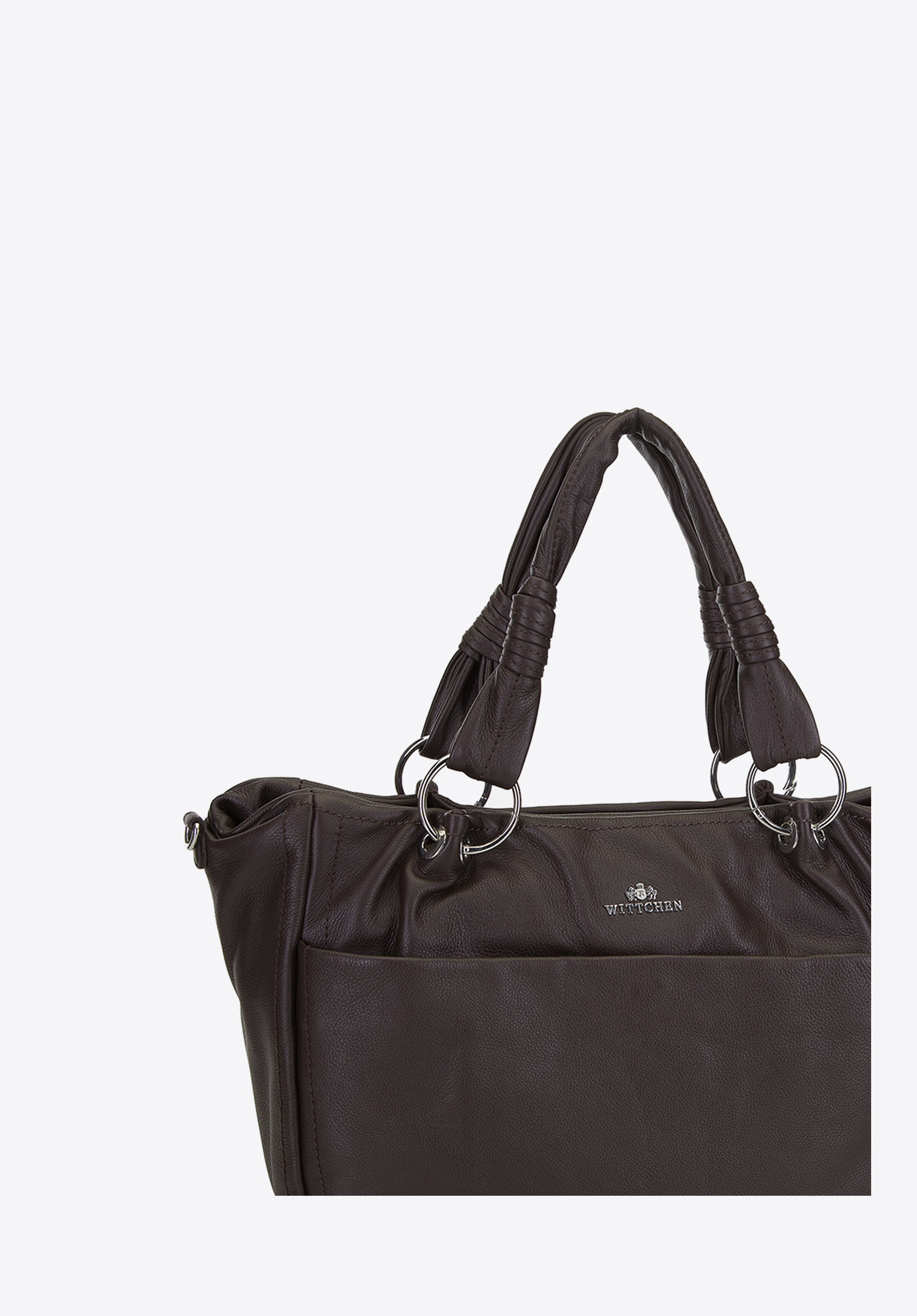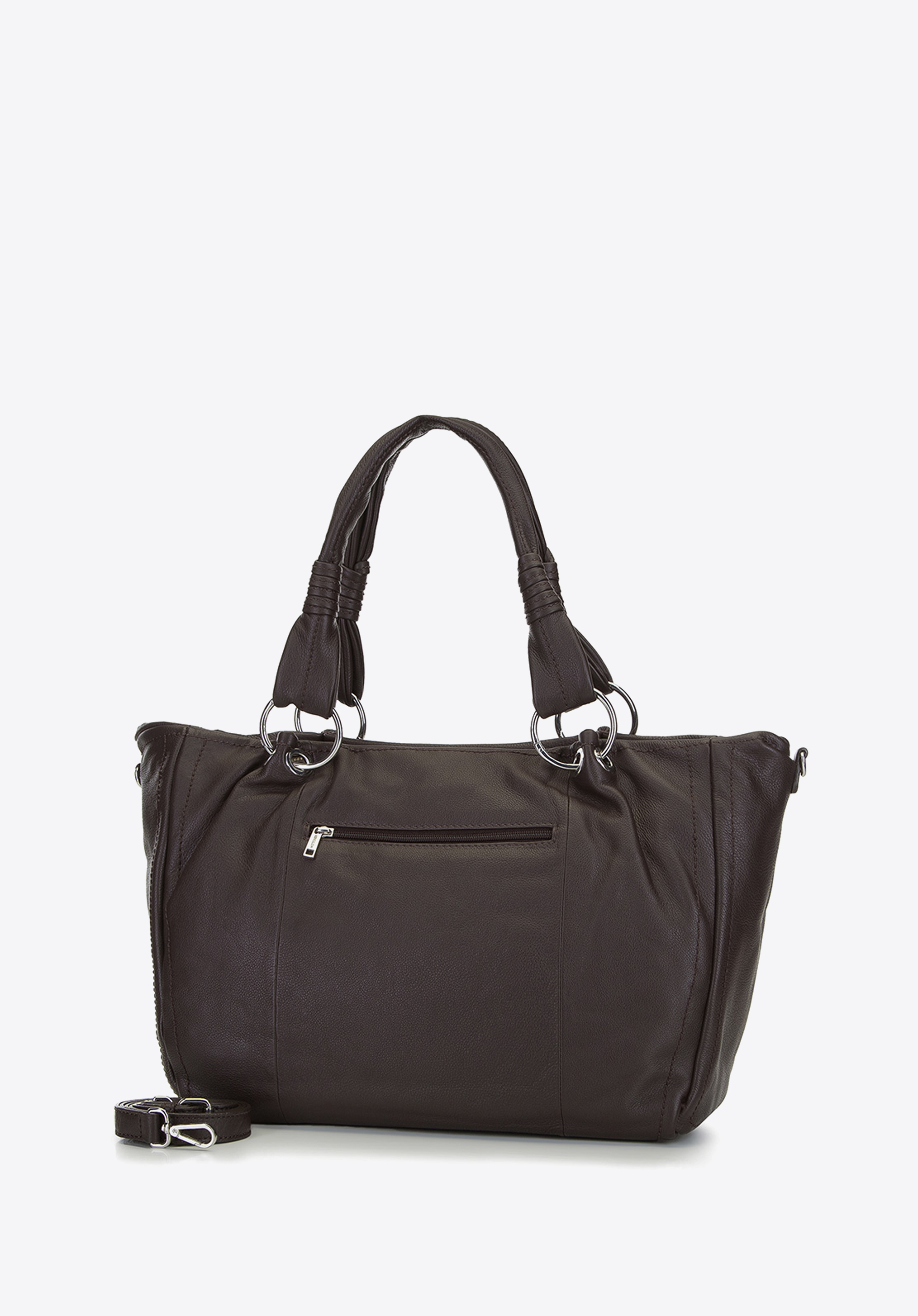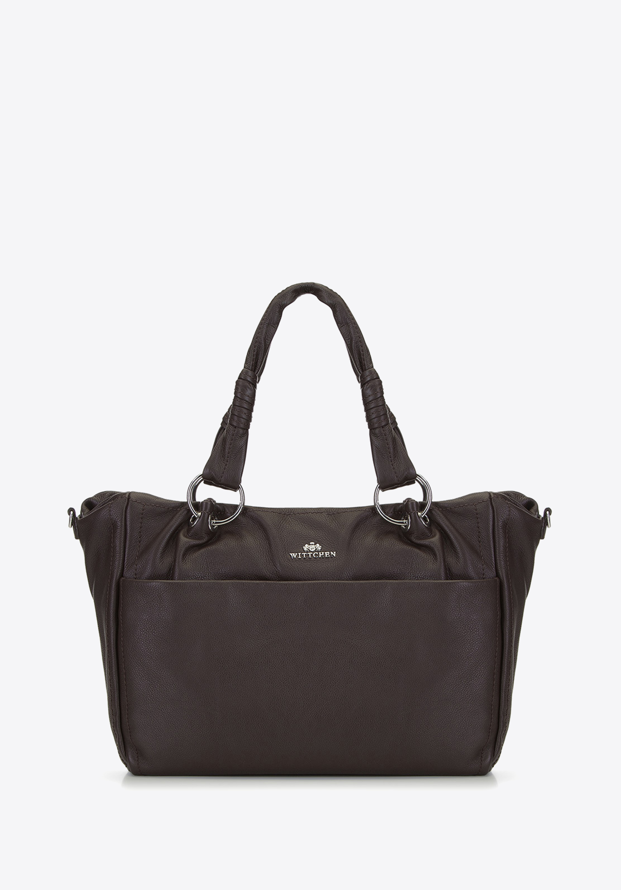 Ta duża torba o kroju worka będzie świetnym dopełnieniem stroju zarówno biznesowego, jak i codziennego. Miękka skóra naturalna sprawia, że torba dobrze układa się na ramieniu. Interesujące uchwyty z wiązanej skóry, przyczepione do torby metalowymi kółkami, dodają jej charakteru. Z kolei liczne kieszenie pomogą w utrzymaniu porządku w rzeczach osobistych, a ta z przodu torby pełni w dodatku funkcję ozdobną. Możesz mieć pewność, że ponadczasowy fason tej torby worka nigdy nie wyjdzie z mody.
