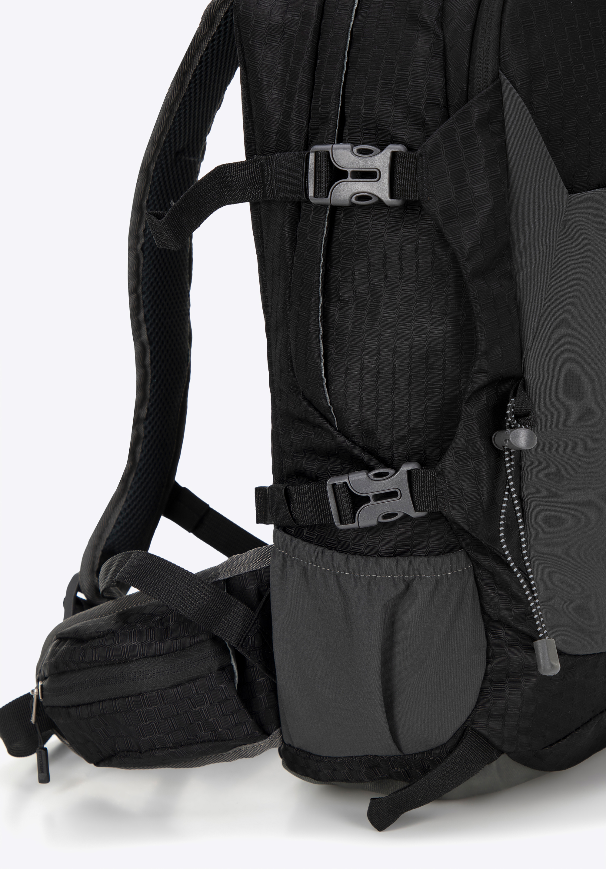 - Pas piersiowy (22–42 cm) i biodrowy (48–144 cm): Zapewniają stabilność plecaka, równomiernie rozkładając wagę, co odciąża plecy i ramiona. Pas biodrowy posiada dodatkowe kieszonki, idealne na drobiazgi, takie jak klucze czy telefon.