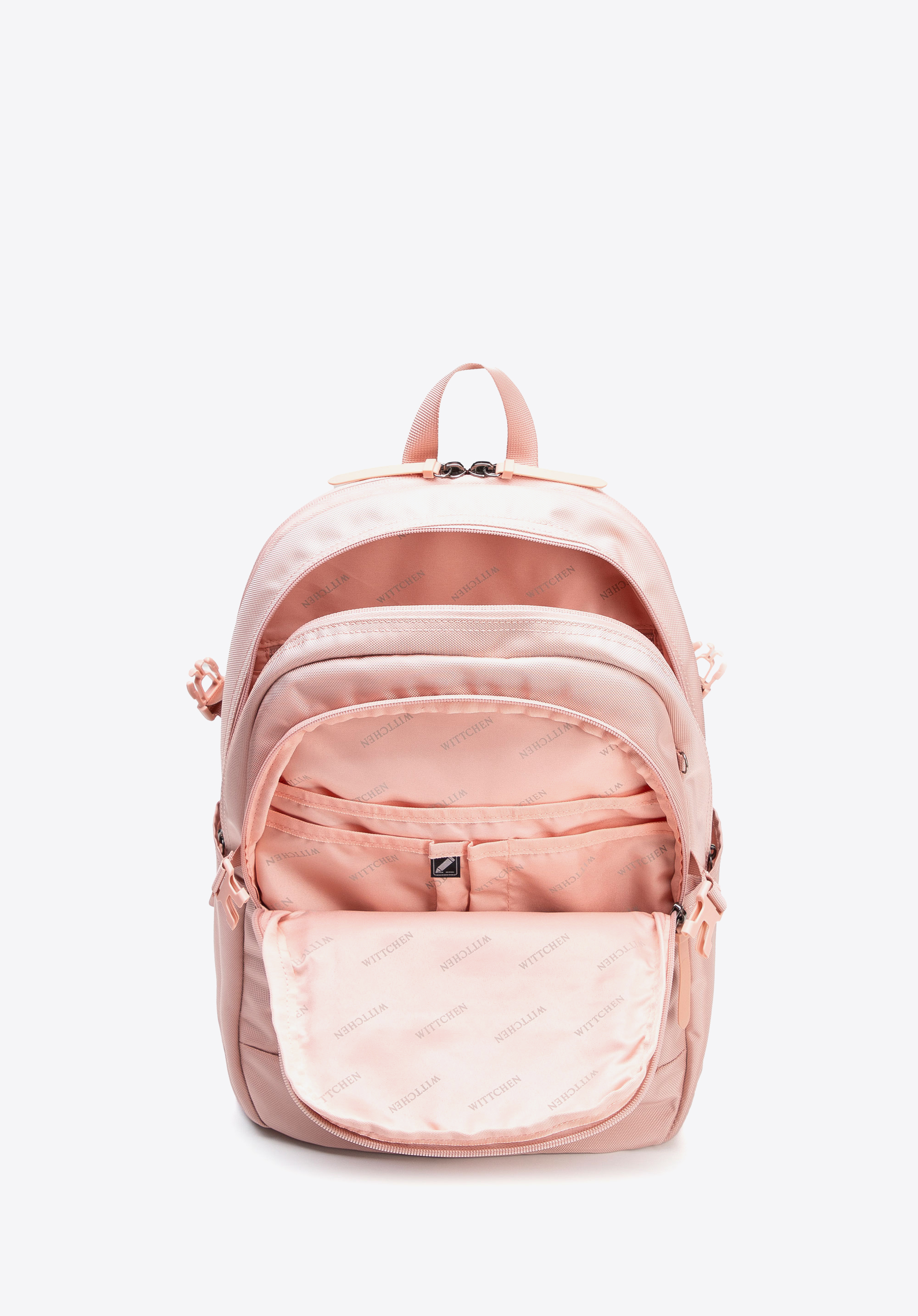 - Przednie kieszenie: Dwie zamykane kieszenie na drobne akcesoria oraz kieszeń z trzema przegrodami i dwiema kieszonkami na długopis, które pomagają utrzymać porządek i mieć wszystko pod ręką.
