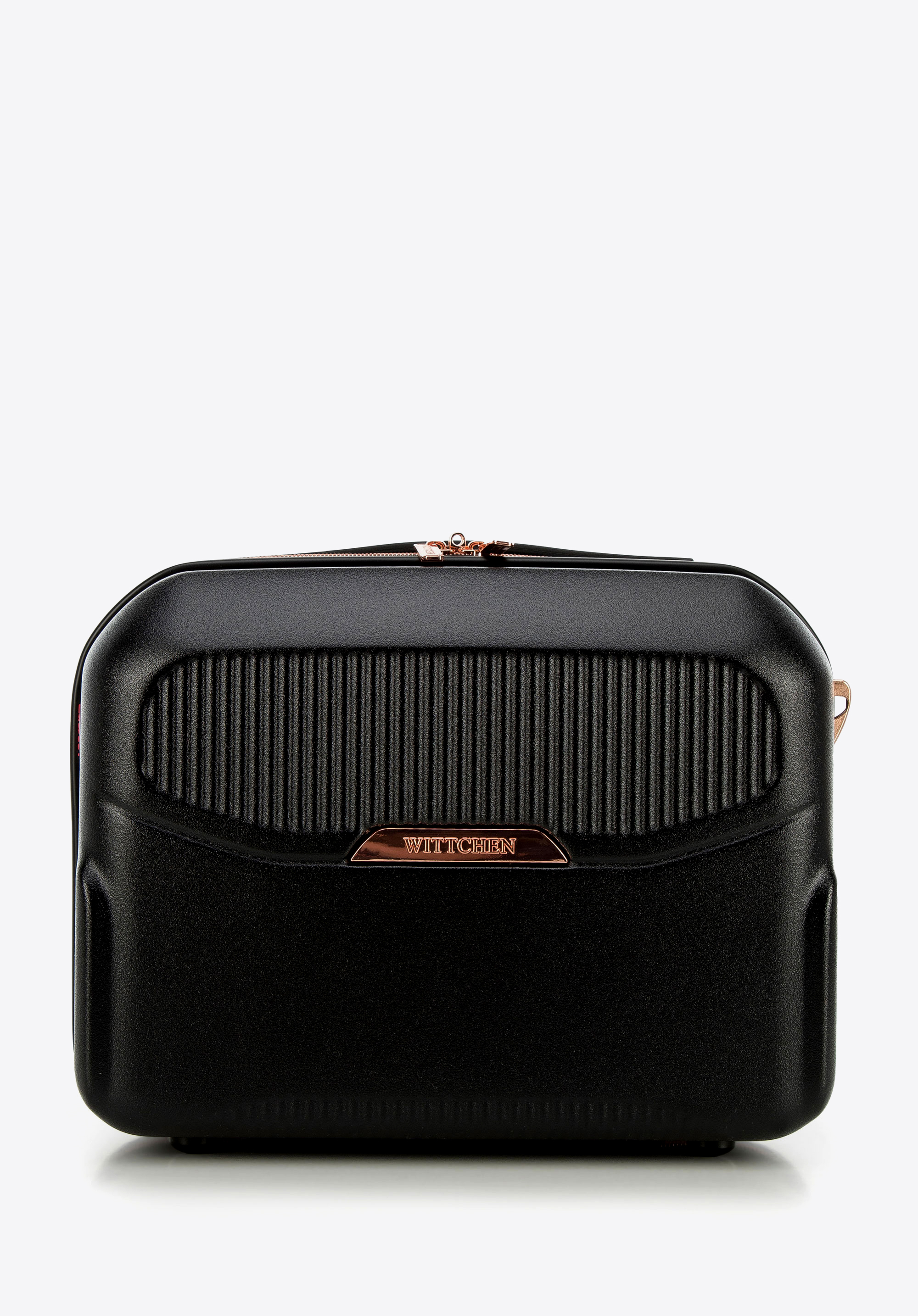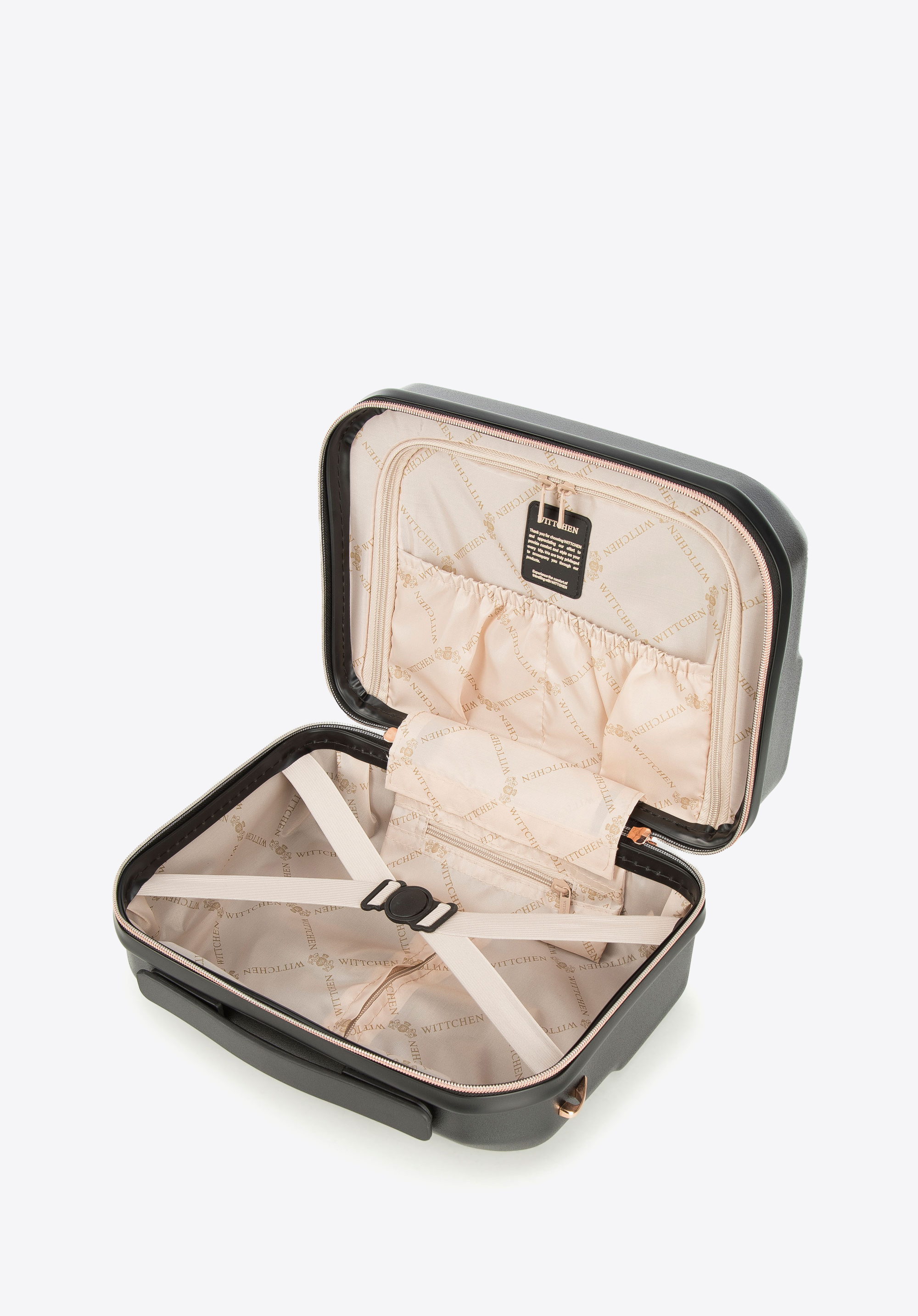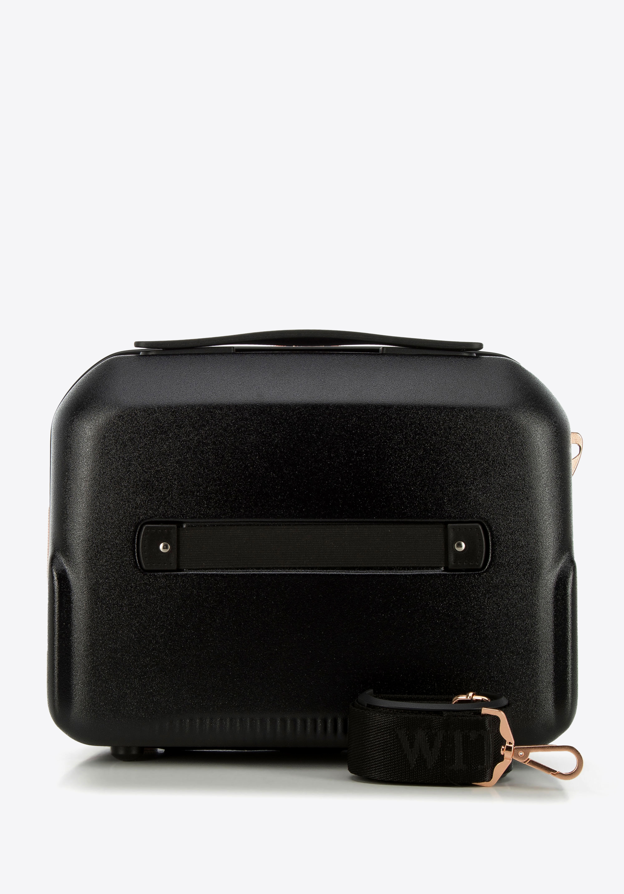 - Kosmetyczka: Wyposażona w uchwyt, odpinany i regulowany pasek na ramię oraz elastyczny pas do mocowania na rączce walizki.