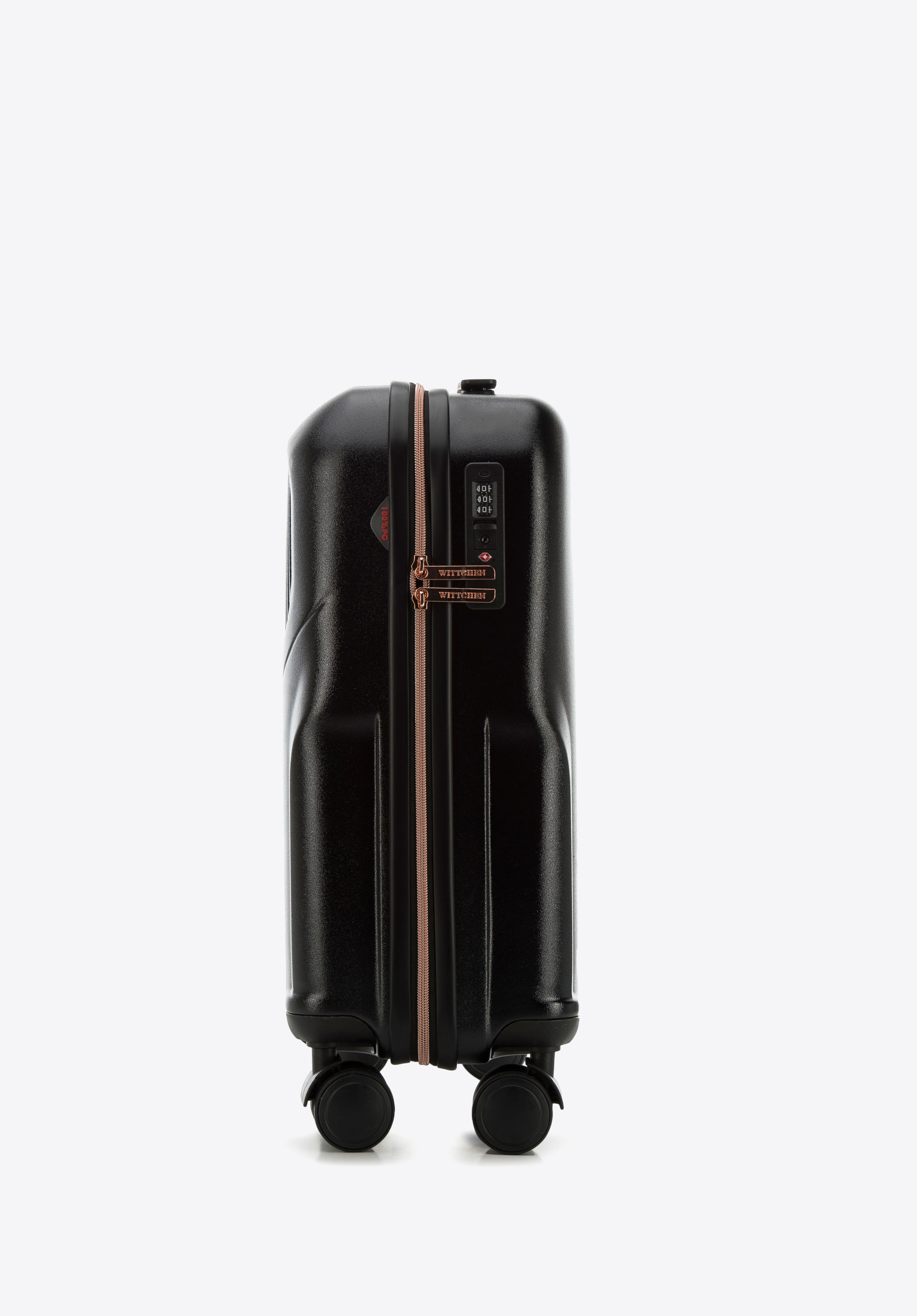 - Design: Stylowe żłobienia i wstawki w kolorze różowego złota nadają walizce nowoczesny, elegancki wygląd.