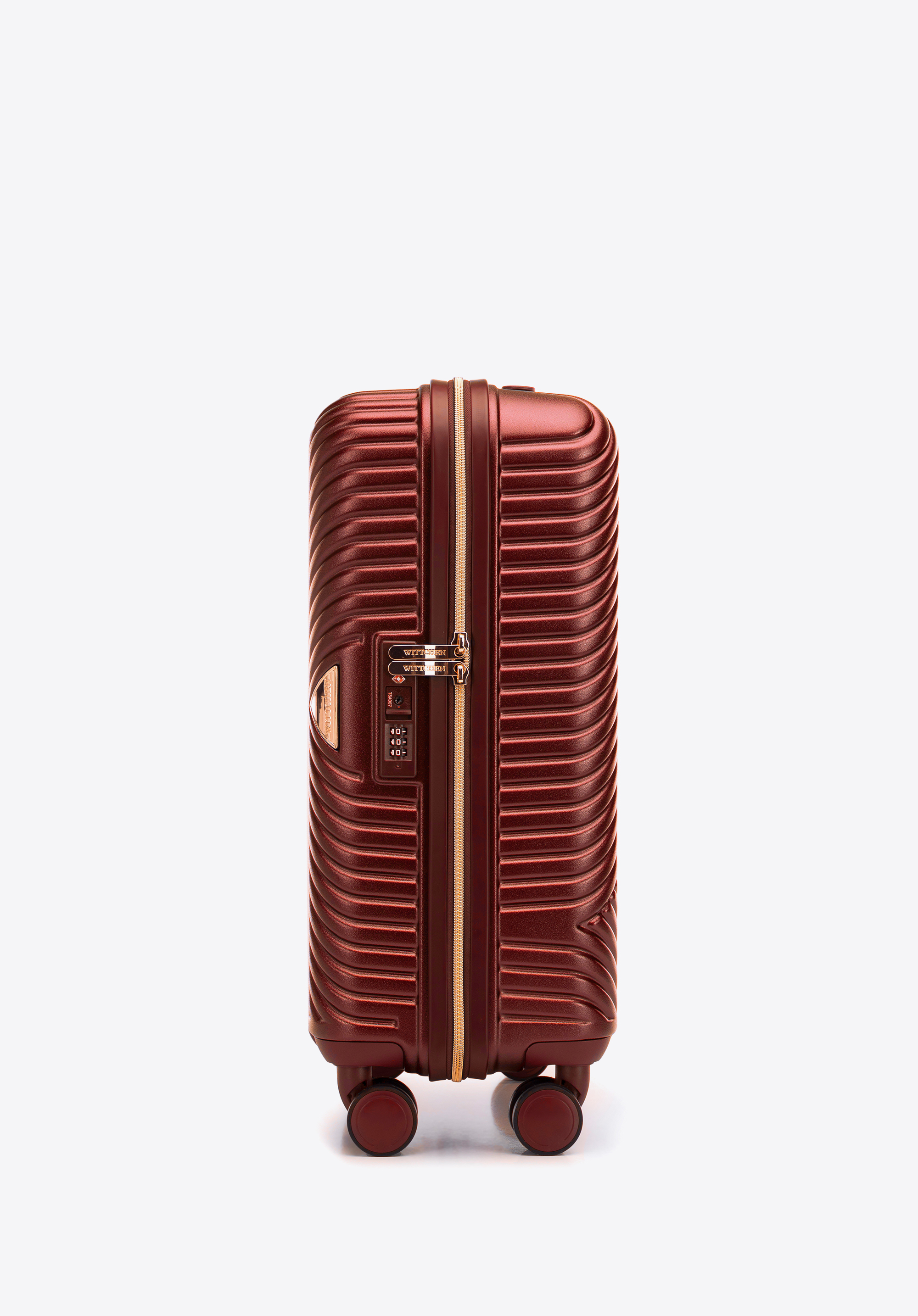 - Wnętrze walizki: Komora główna z regulowanymi pasami zabezpieczającymi ubrania; komora zamykana na suwak; dwie kieszenie z siatki i dodatkowa kieszeń zamykana na suwak – wszystko wykończone beżową podszewką z logo WITTCHEN.