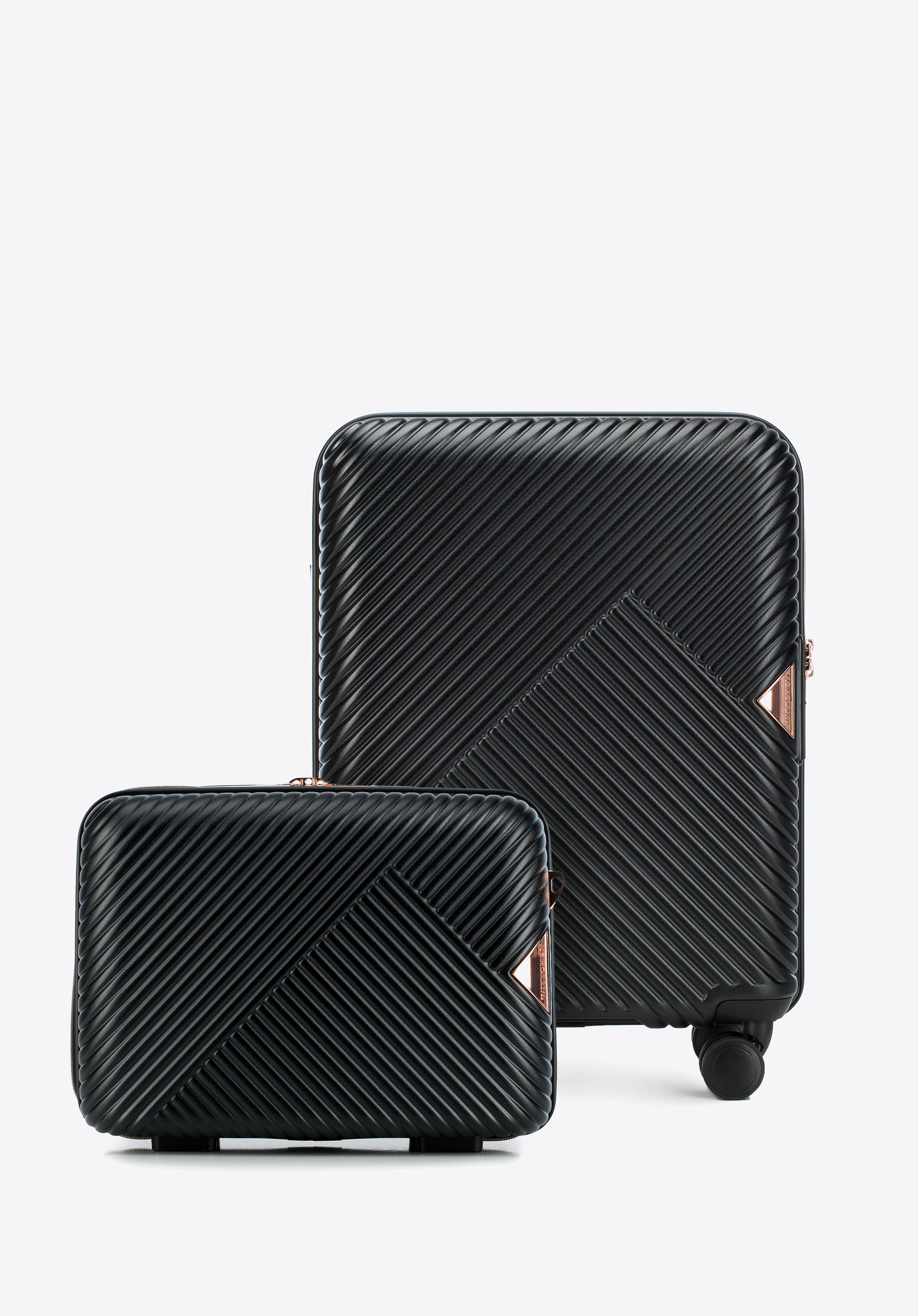 Stylowy duet, który wniesie elegancję do każdej podróży! Walizka kabinowa i dopasowana kosmetyczka z kolekcji GL Style wykonane są z wytrzymałego polikarbonu o matowym wykończeniu, łączącego lekkość z odpornością na uszkodzenia. Lśniące okucia w kolorze różowego złota i geometryczne tłoczenia nadają im nowoczesny charakter. Z tym zestawem każda podróż – od służbowego wyjazdu po weekendowy city break – będzie stylowa i doskonale zorganizowana.