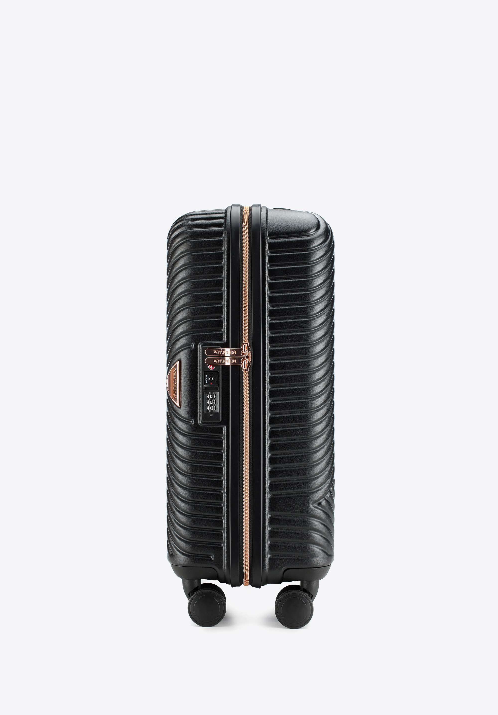 - Wnętrze walizki: Komora główna z regulowanymi pasami zabezpieczającymi ubrania; komora zamykana na suwak; dwie kieszenie z siatki i dodatkowa kieszeń zamykana na suwak – wszystko wykończone beżową podszewką z logo WITTCHEN.