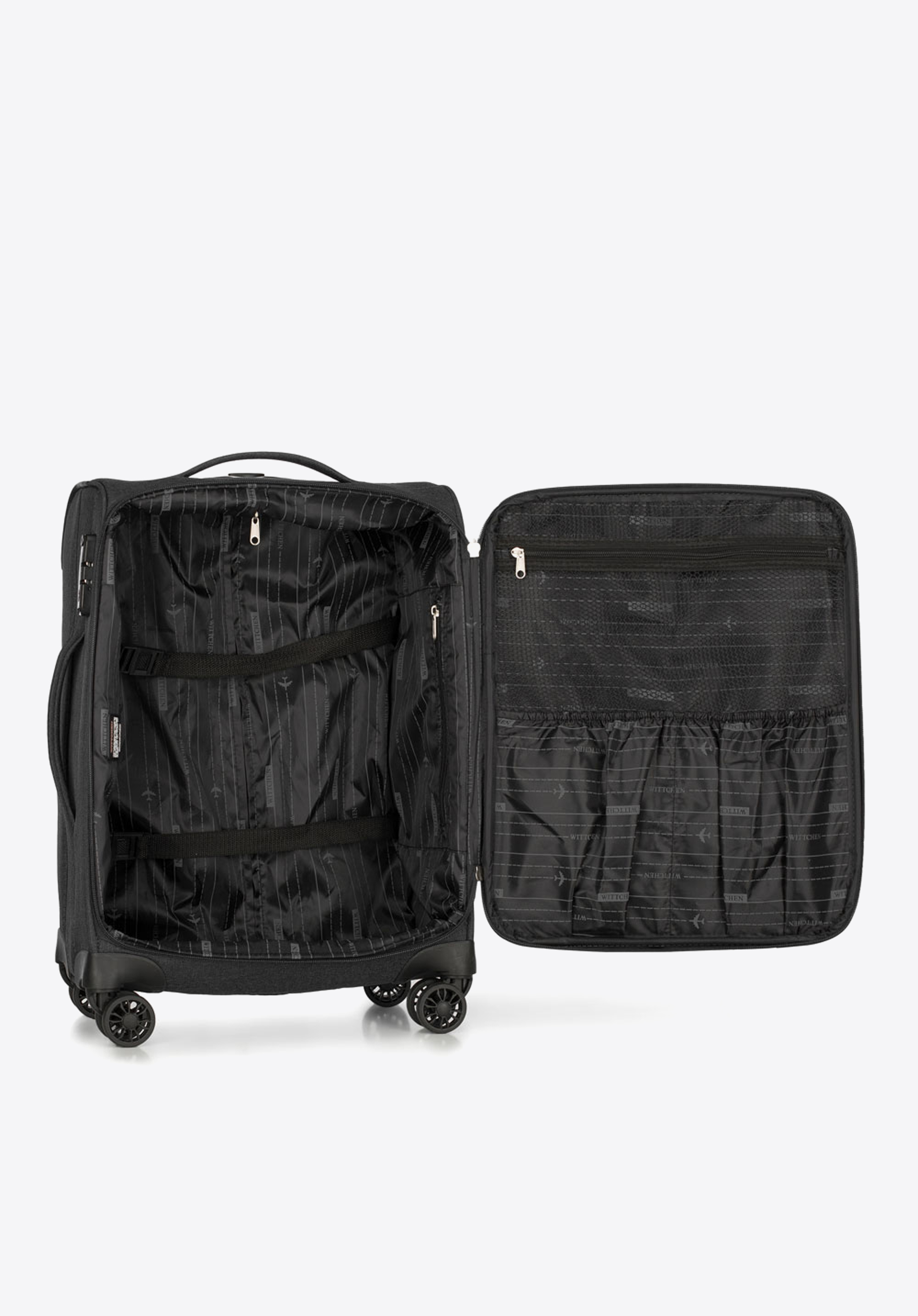 - zamek z szyfrem TSA – bardzo przydatny w przypadku rewizji bagażu przez służby celne – gwarantuje on bezinwazyjne otwarcie walizki oraz jej ponowne zamknięcie, bez uszkodzenia zamka;