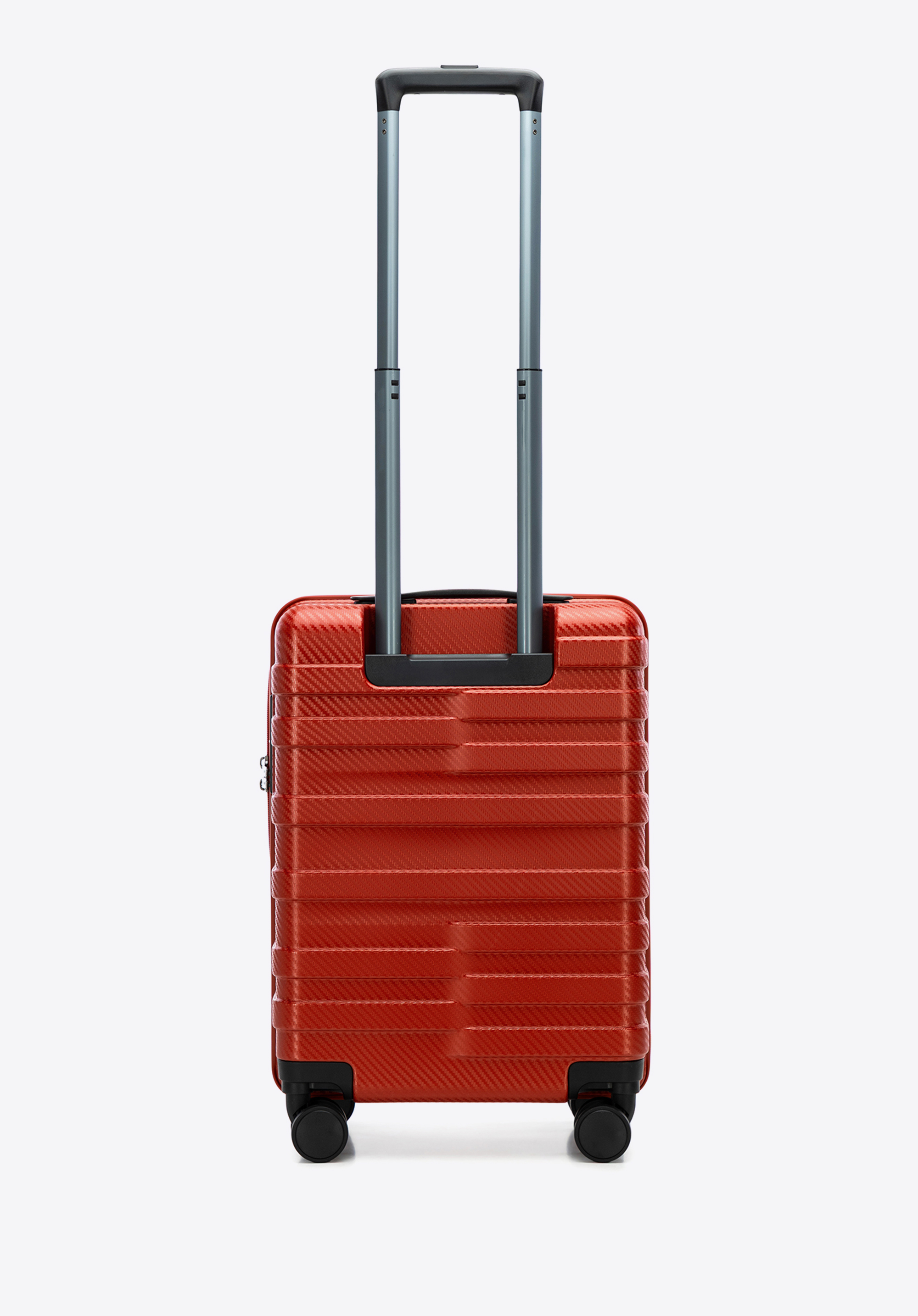 - Uchwyt: Praktyczna rączka z logo ułatwia przenoszenie walizki w ręku.