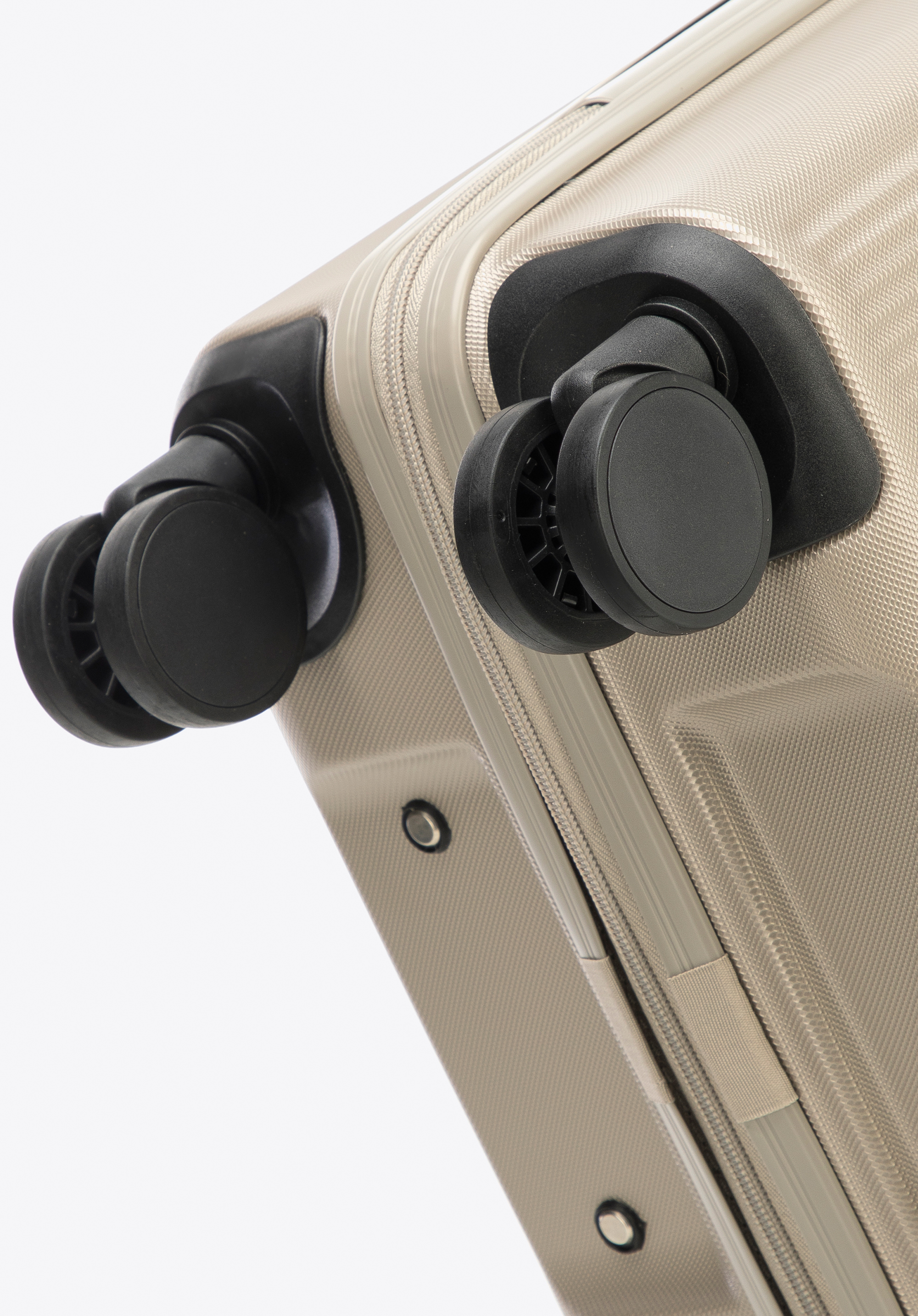 - walizka wyposażona w cztery podwójne, obrotowe kółka ułatwiające prowadzenie;