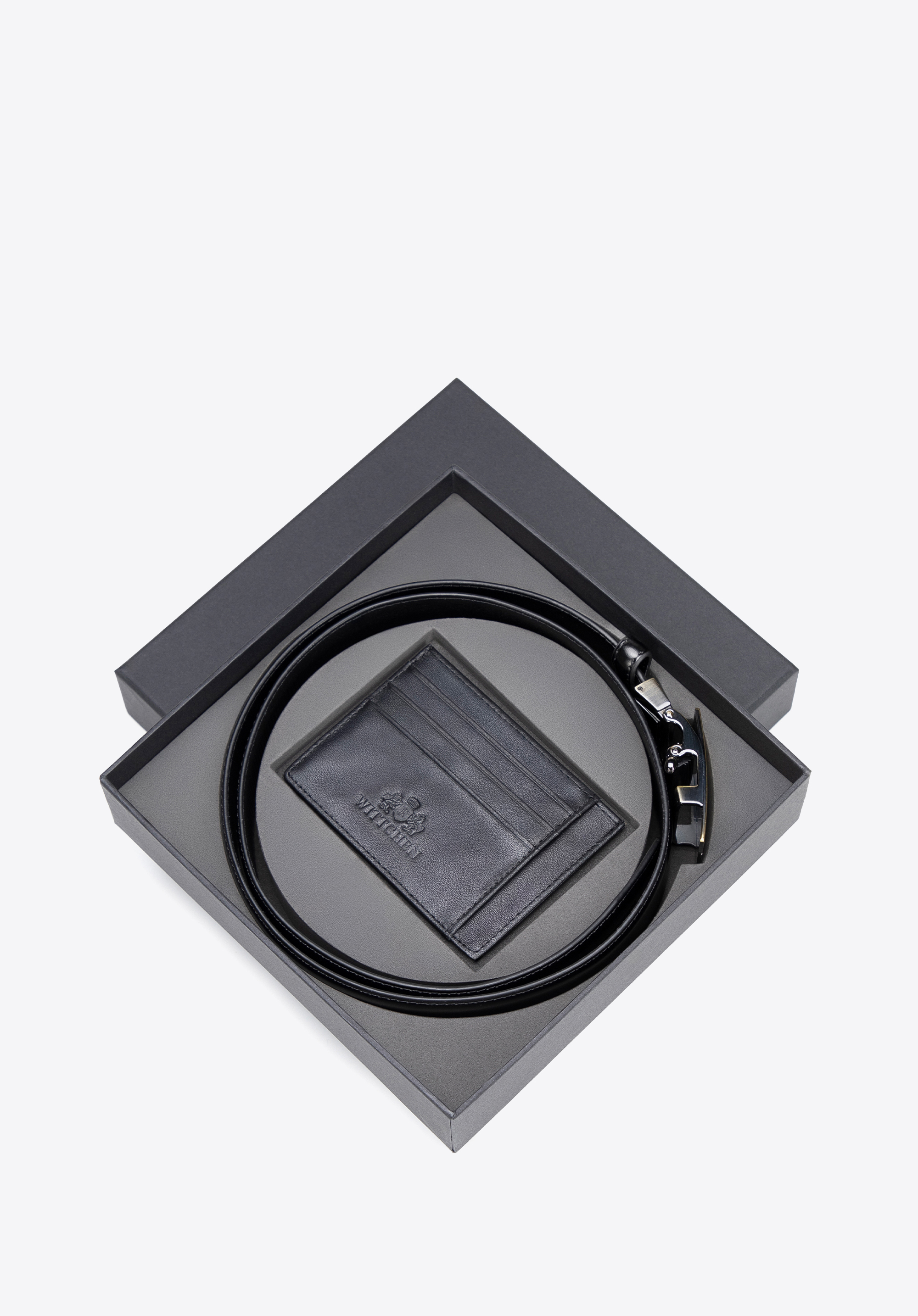 - Stylowe detale: Subtelne logo na klamrze oraz tłoczone detale na końcówce paska i froncie etui podkreślają nowoczesny, męski charakter zestawu.
